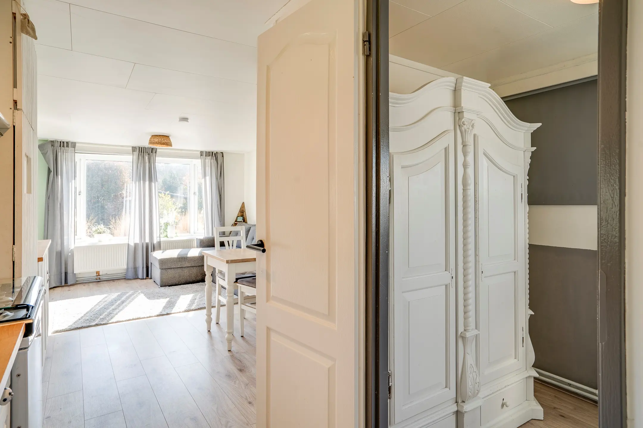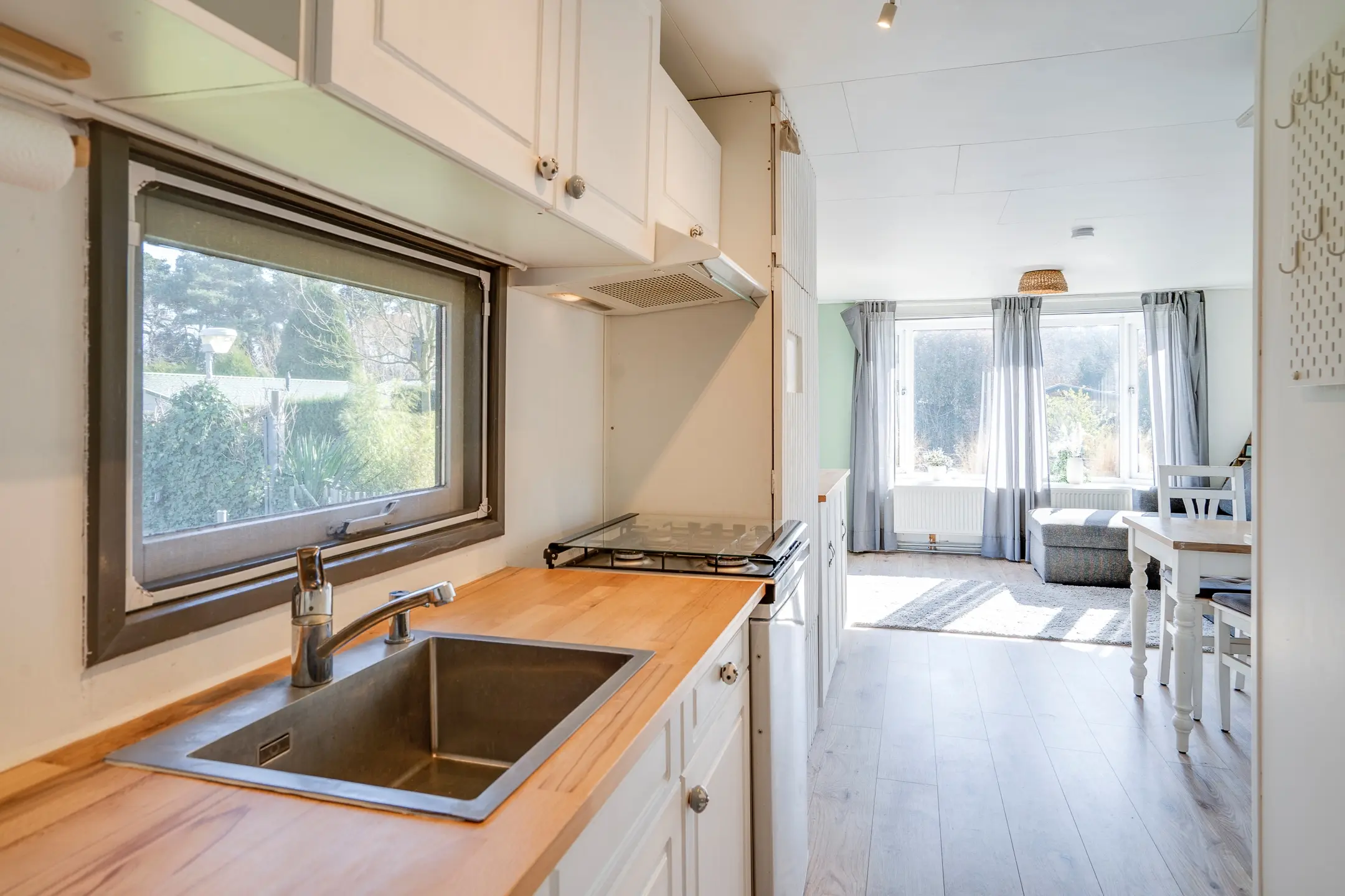 De sfeervolle woonkamer (ca. 22 m²) staat in directe verbinding met de fraai aangelegde tuin dankzij dubbele terrasdeuren. Grote raampartijen zorgen voor een prettige lichtinval en een ruimtelijk gevoel. De halfopen keuken is praktisch ingericht en voorzien van een kookplaat, afzuigkap en koelkast.