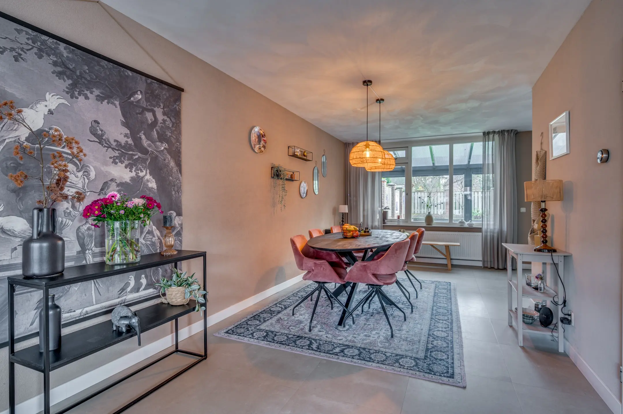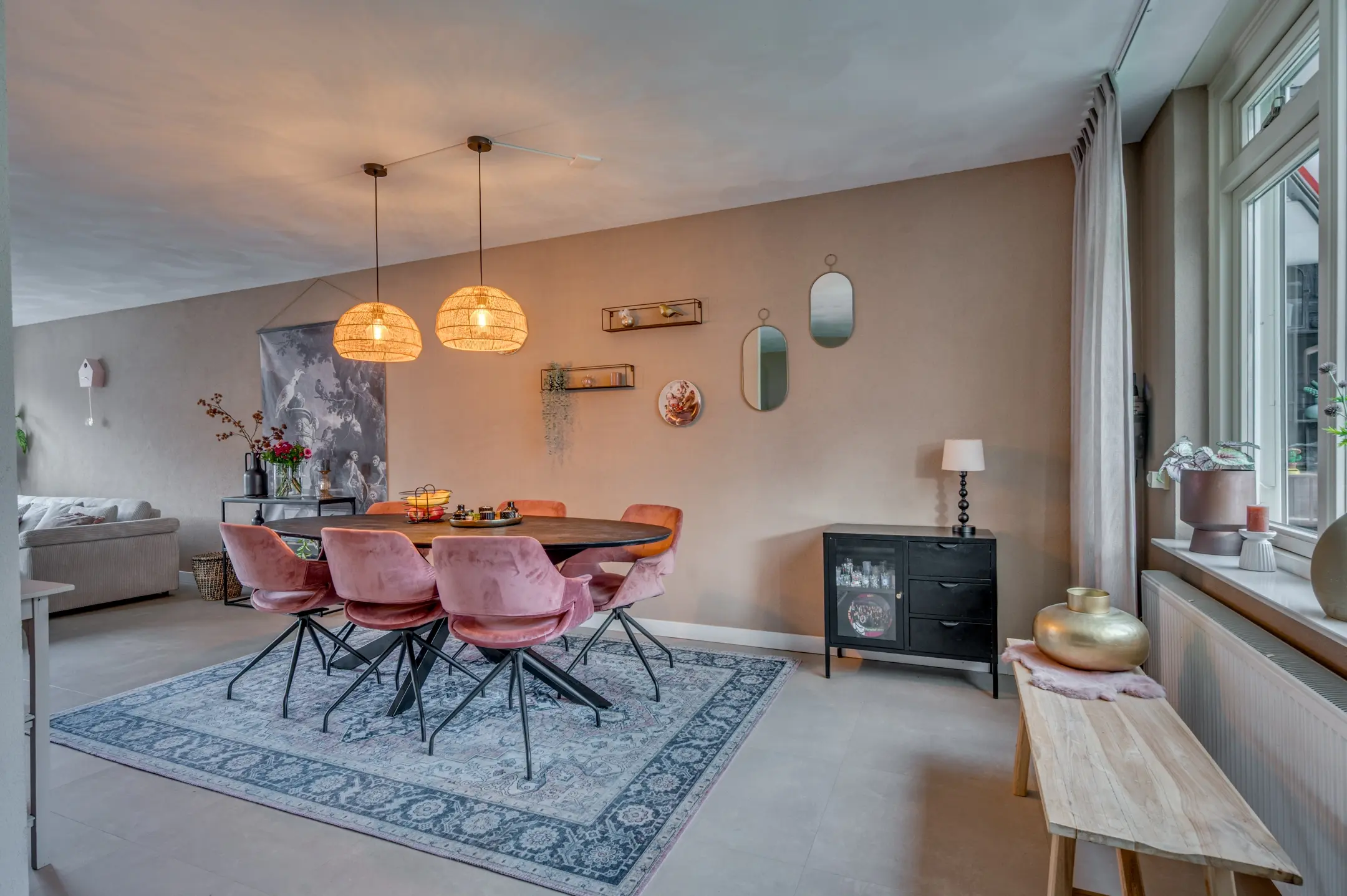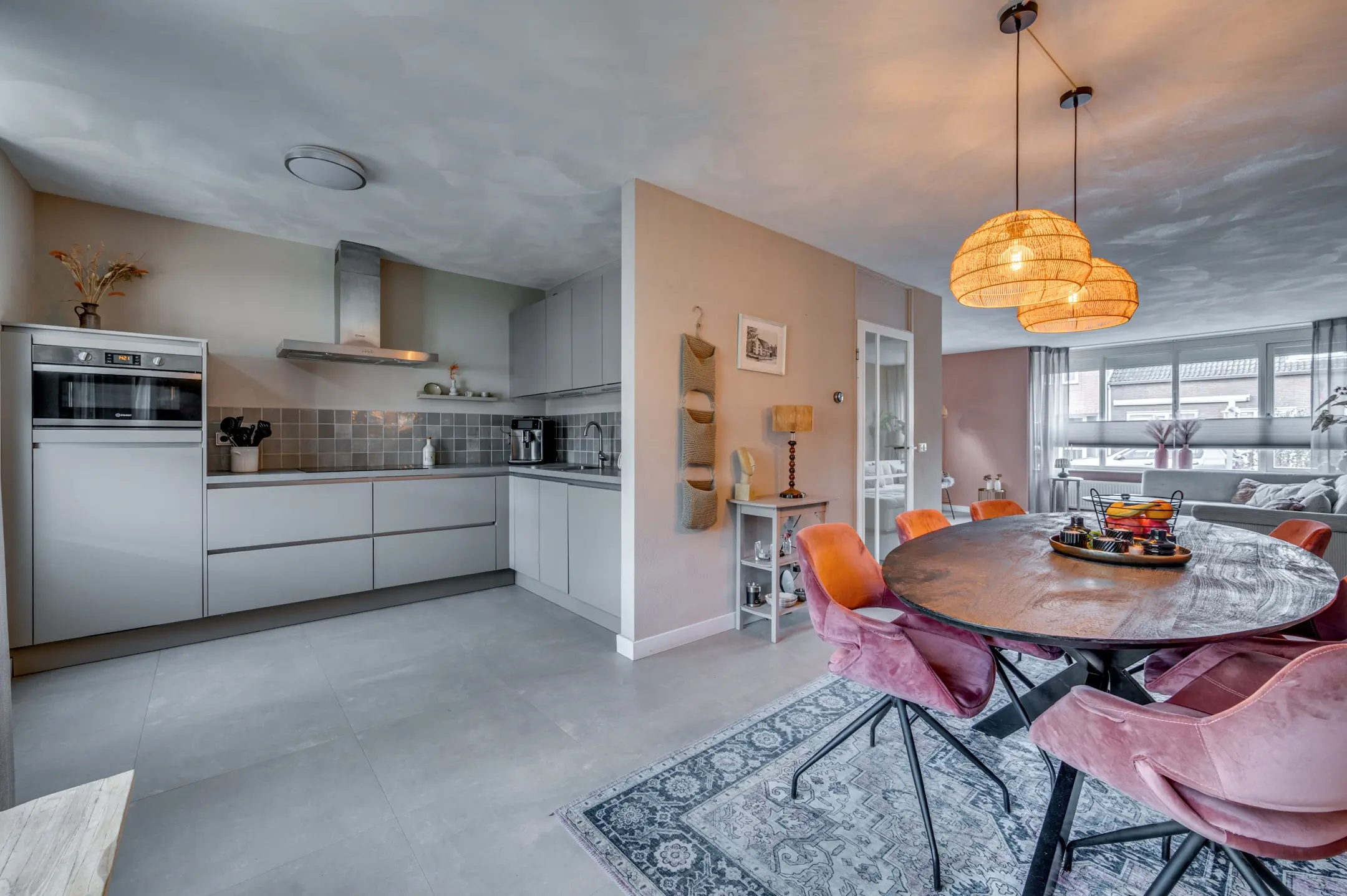 De ruime doorzon living met erker vormt het hart van de woning en staat in open verbinding met de moderne keuken, die is uitgerust met alle benodigde inbouwapparatuur.