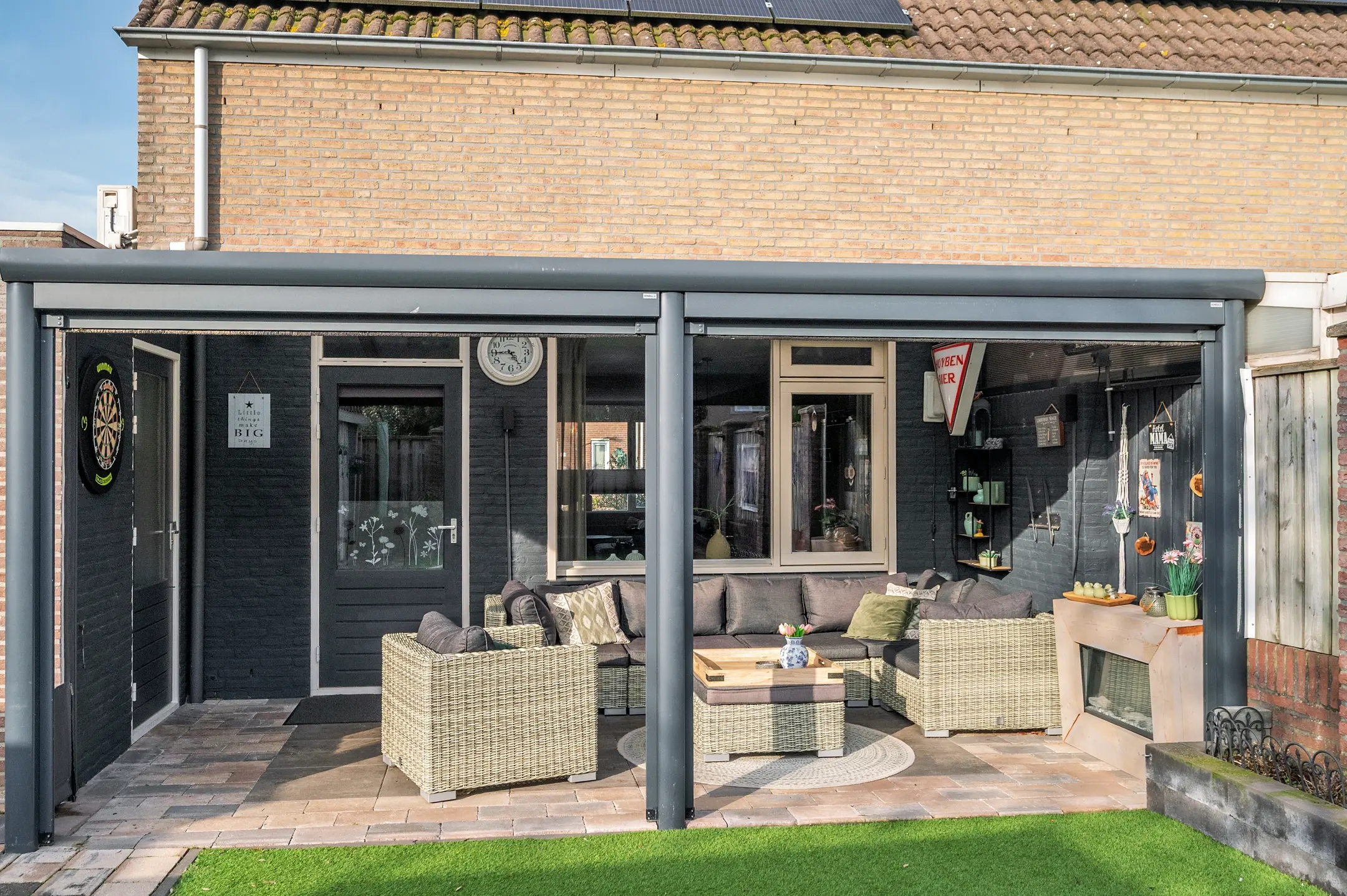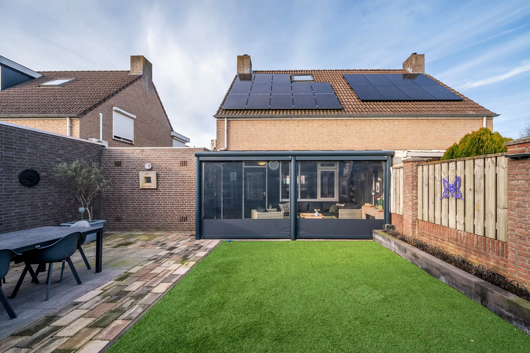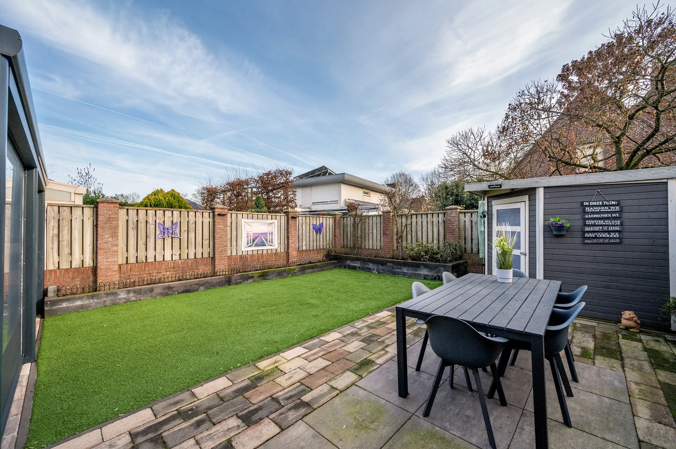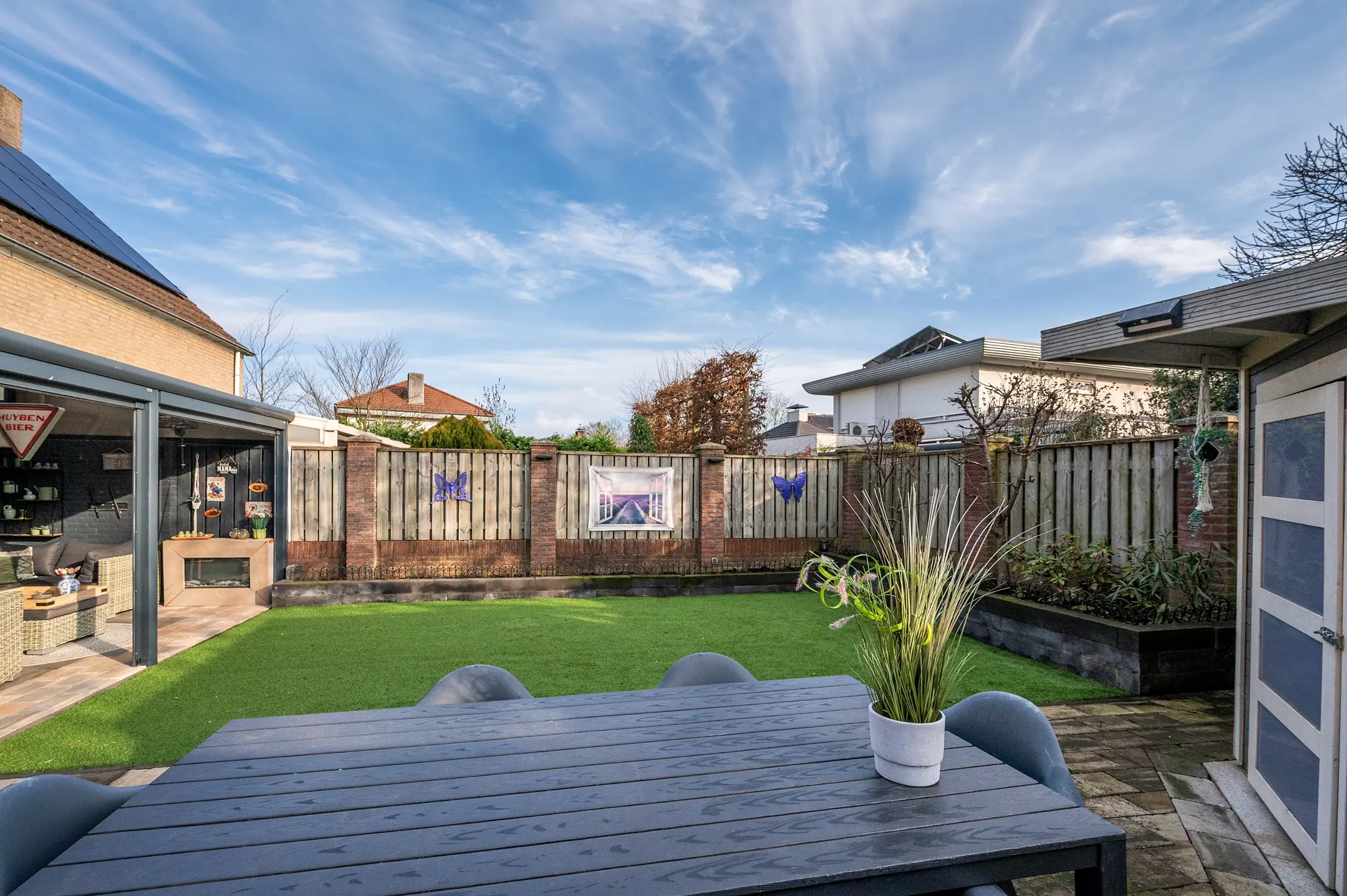 Het overige gedeelte van de tuin is onderhoudsvriendelijk ingericht met kunstgras en beschikt over een tweede terras. Hierdoor heeft u altijd de keuze tussen een zonnige plek of juist een aangename schaduwplaats, ideaal voor elk moment van de dag.