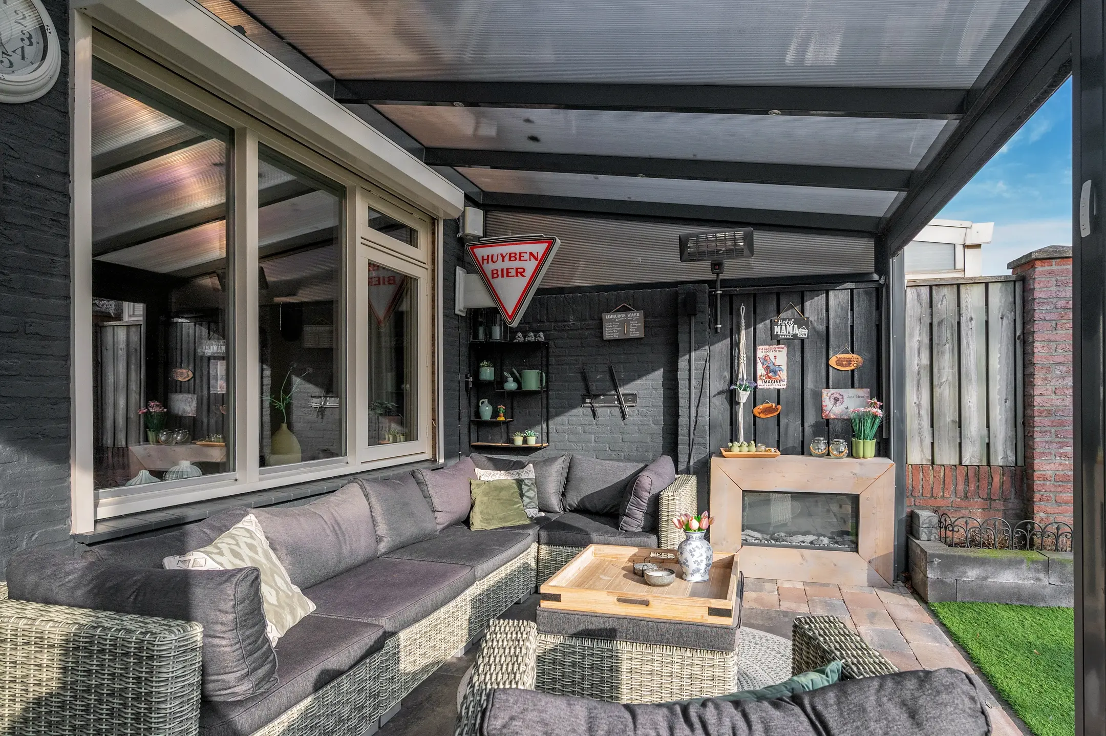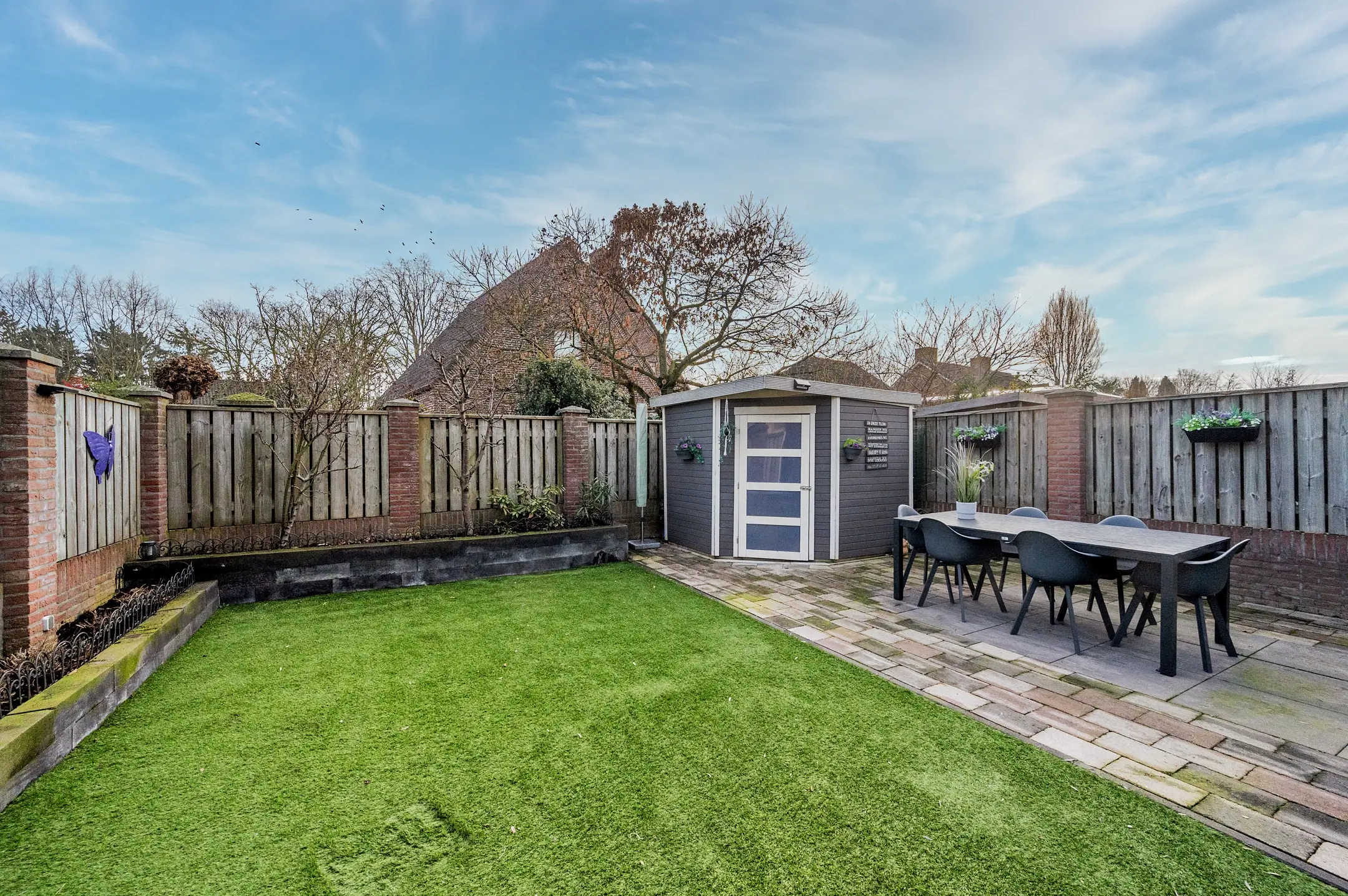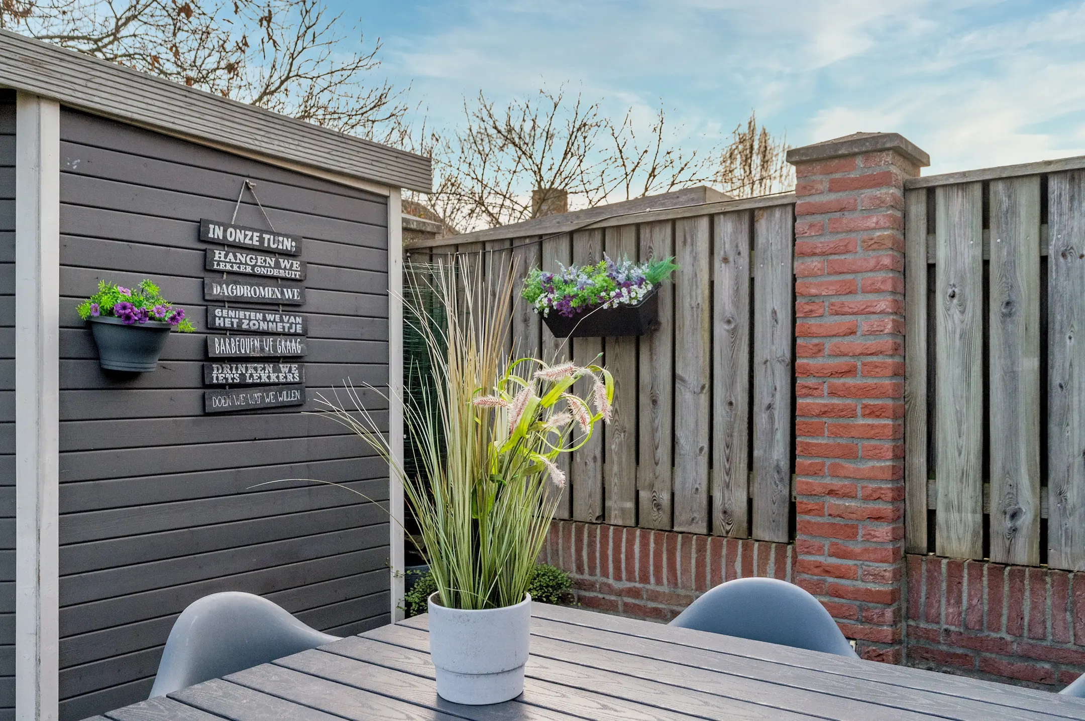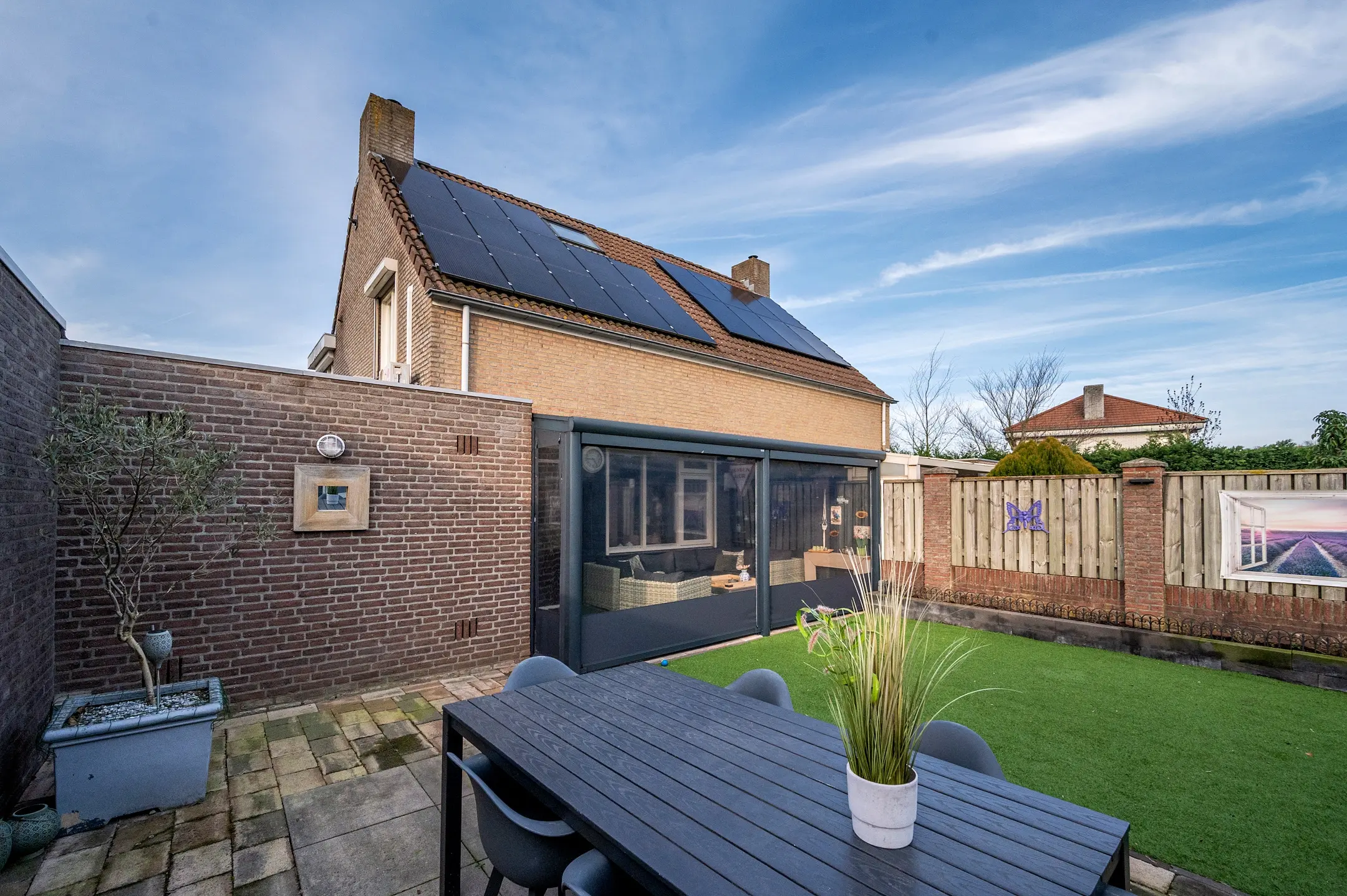 Het overige gedeelte van de tuin is onderhoudsvriendelijk ingericht met kunstgras en beschikt over een tweede terras. Hierdoor heeft u altijd de keuze tussen een zonnige plek of juist een aangename schaduwplaats, ideaal voor elk moment van de dag.