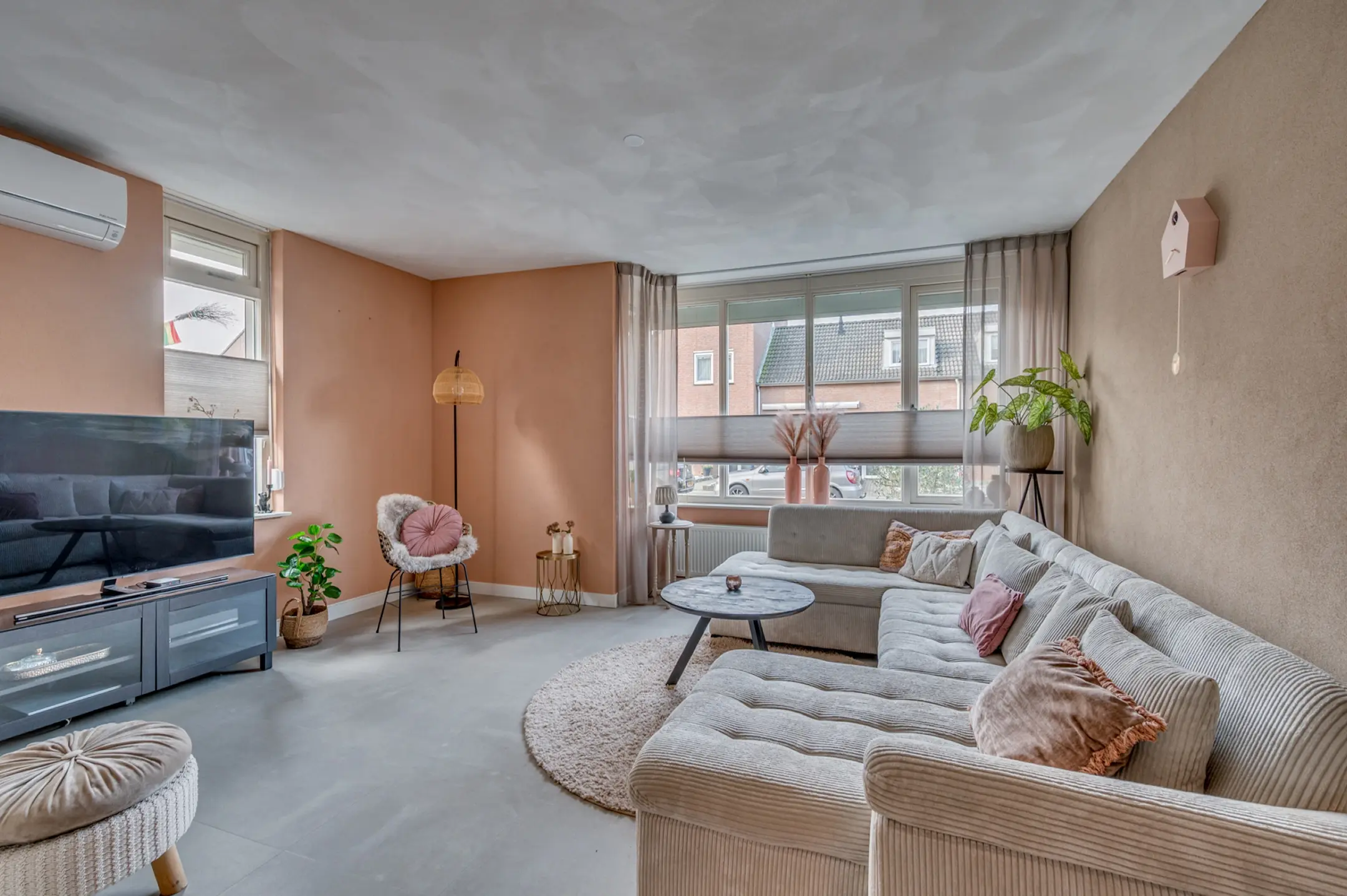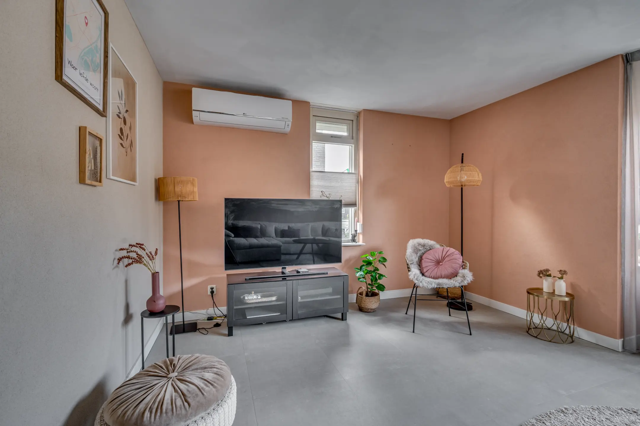Voor een comfortabel binnenklimaat, het hele jaar door, is de woonkamer voorzien van een airco, zodat het zowel op zomerse als op winterse dagen aangenaam vertoeven is.