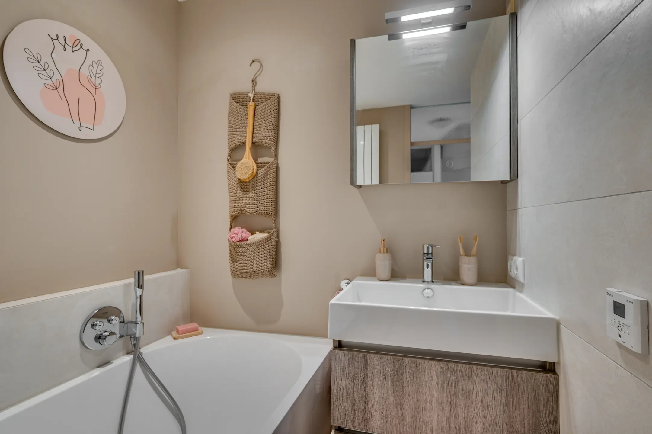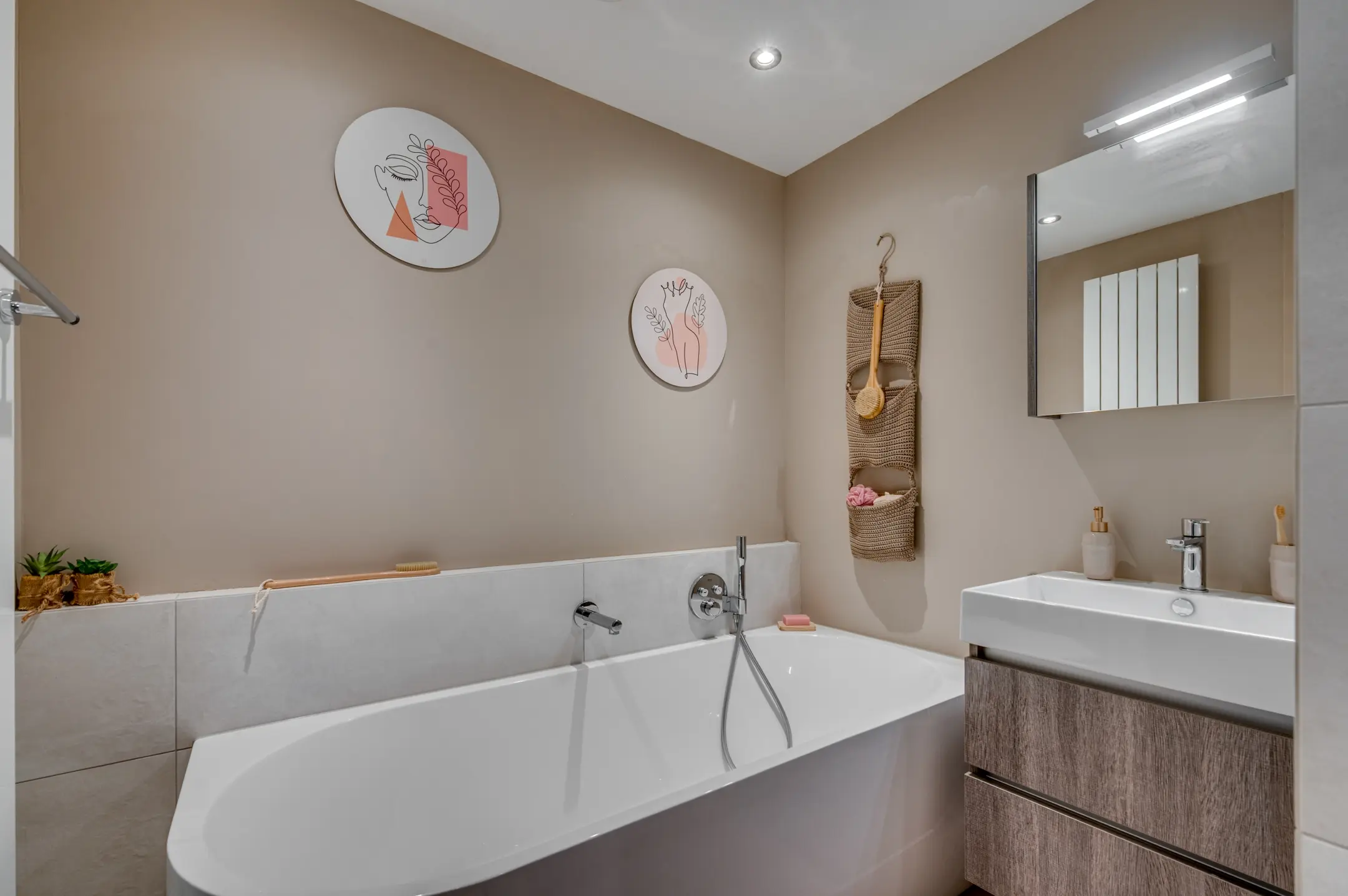 De in 2022 gemoderniseerde badkamer is een echte wellnessruimte, uitgerust met een ligbad, inloopdouche met sunshower, toilet en wastafelmeubel. De lichte tegelvloer met vloerverwarming zorgt voor extra comfort, en voor een sfeervolle beleving is de badkamer voorzien van een Power Dynamics BTW30SET inbouw muzieksysteem. De gehele eerste verdieping is afgewerkt met hoogwaardige laminaatvloeren, wat bijdraagt aan een stijlvolle en warme uitstraling.