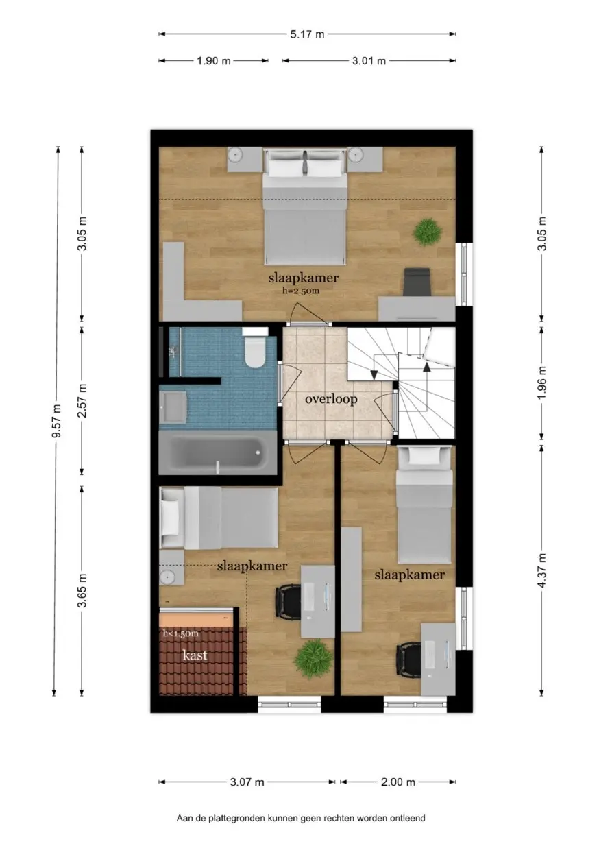 Via de nieuw gestylde houten trap in de hal bereikt u de ruime overloop van de eerste verdieping. Vanaf hier heeft u toegang tot drie volwaardige slaapkamers, waarvan één momenteel is ingericht als royale walk-in closet. De masterbedroom aan de achterzijde is met circa 15 m² zeer ruim opgezet en voorzien van een airco, die het gehele huis voorziet van een aangenaam binnenklimaat. De twee overige slaapkamers, van circa 10 m² en 9 m², liggen aan de voor- en zijkant van de woning en zijn eveneens netjes afgewerkt.
