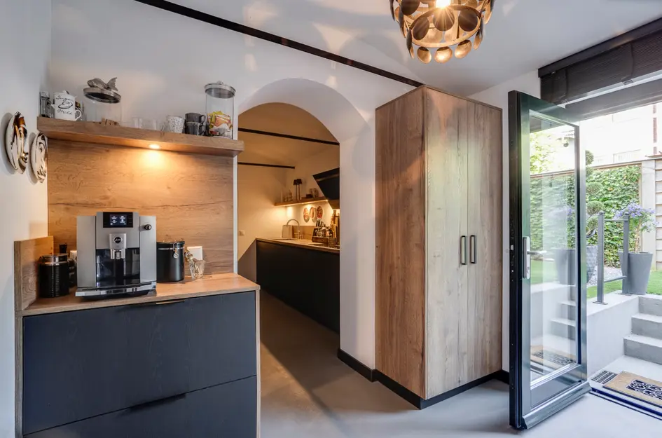 Aansluitend aan de eetkamer bevindt zich een charmante koffiecorner, uitgevoerd in dezelfde hoogwaardige materialen en afwerking als de keuken – een harmonieus geheel dat luxe en eenheid uitstraalt. Hier geniet u in alle rust van uw ochtendkoffie.