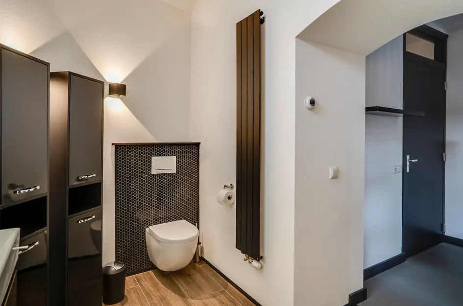 Achter de keuken bevindt zich de fraai vormgegeven ensuite badkamer, die op speelse wijze in het geheel is geïntegreerd zonder concessies te doen aan comfort of luxe. Deze stijlvolle ruimte is uitgerust met een modern tweede toilet, een op maat gemaakt wastafelmeubel met dubbele designkranen, een royale inloopdouche met glazen wand en een strakke designradiator. Hoogwaardige materialen, subtiele verlichting en een doordachte indeling zorgen voor een serene sfeer waarin u zich dagelijks kunt terugtrekken.