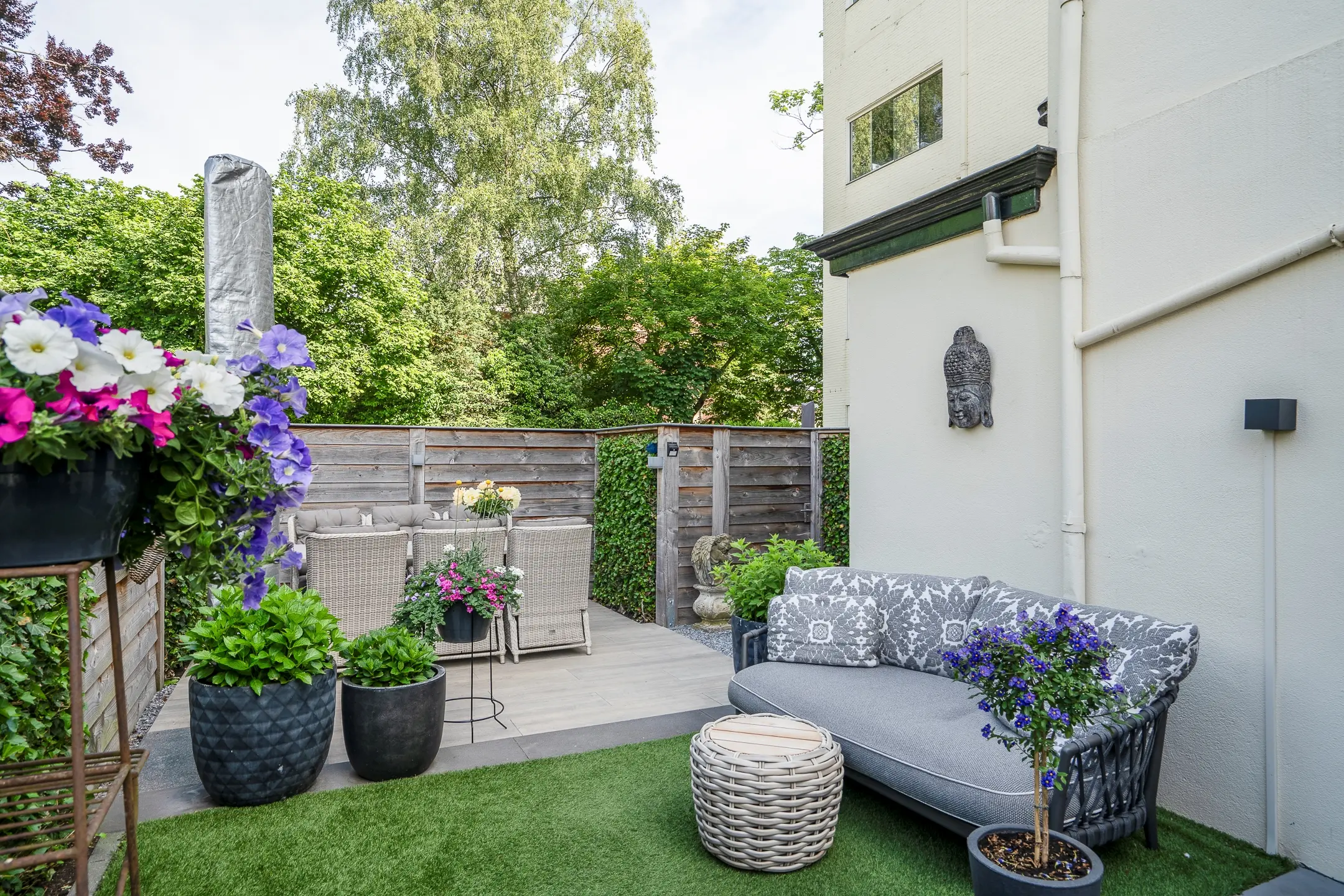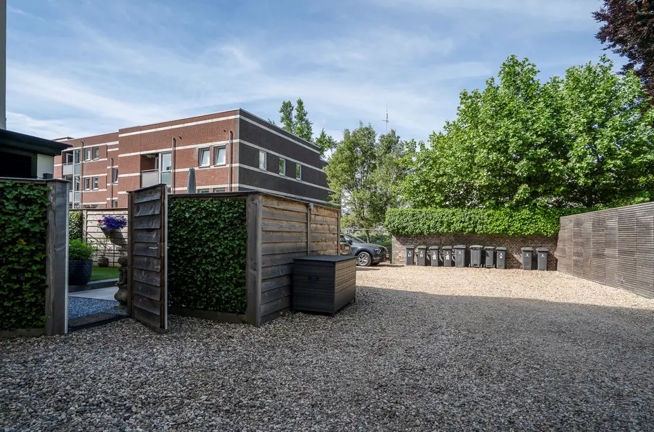 Vanuit deze ruimte heeft u tevens directe toegang tot de sfeervol aangelegde tuin, die het appartement verrijkt met een buitenruimte waar rust en privacy centraal staan.