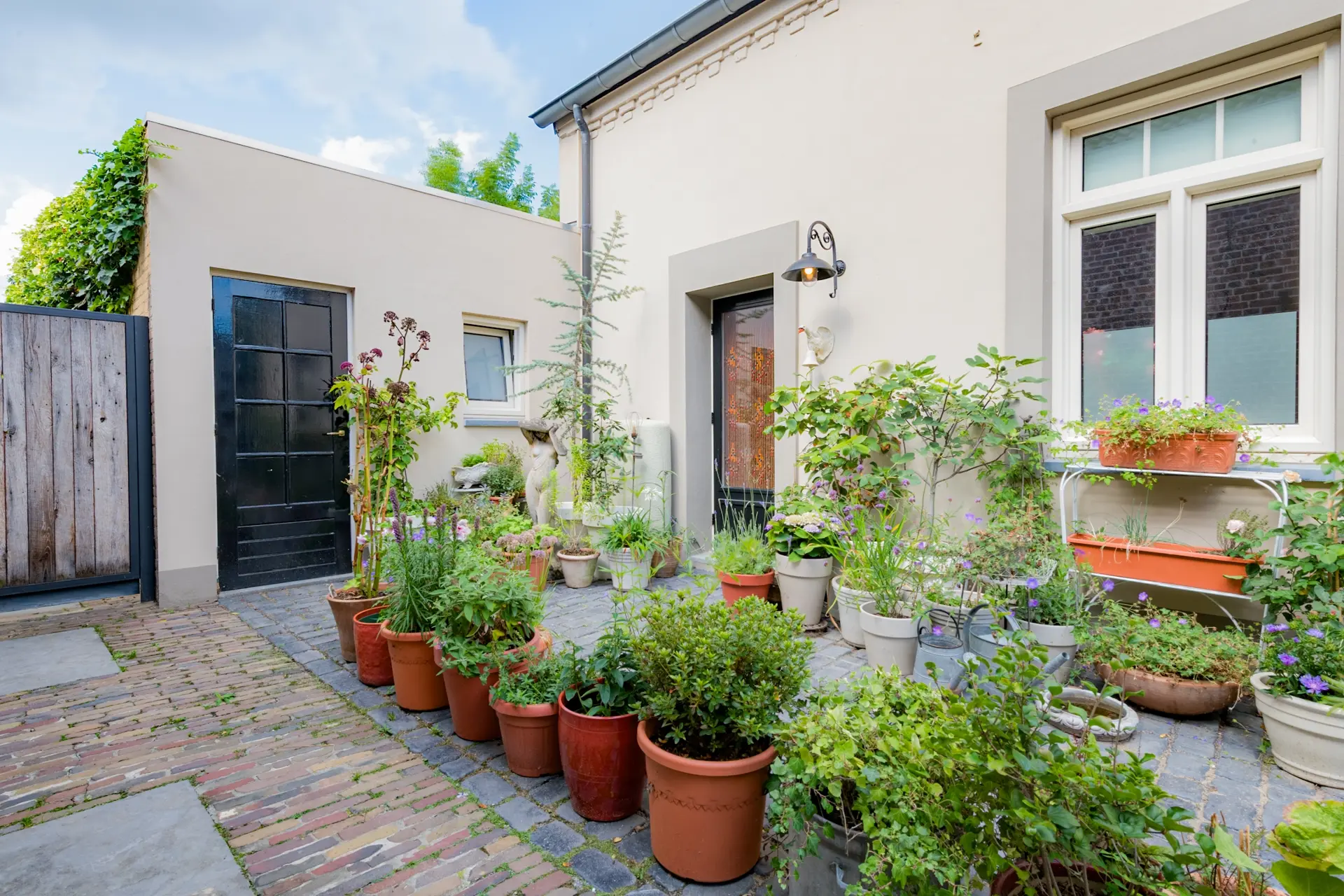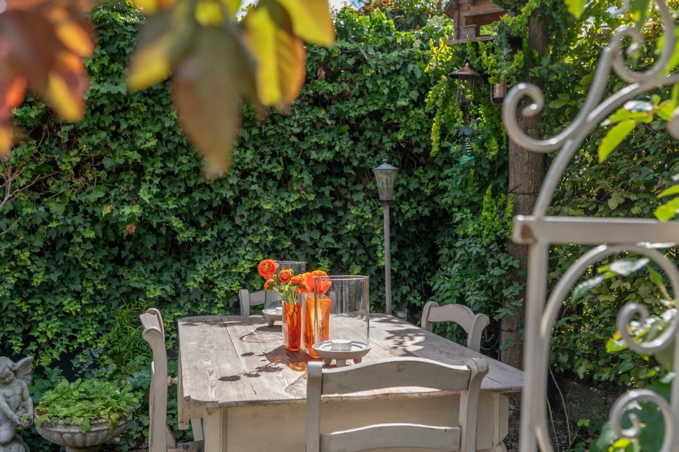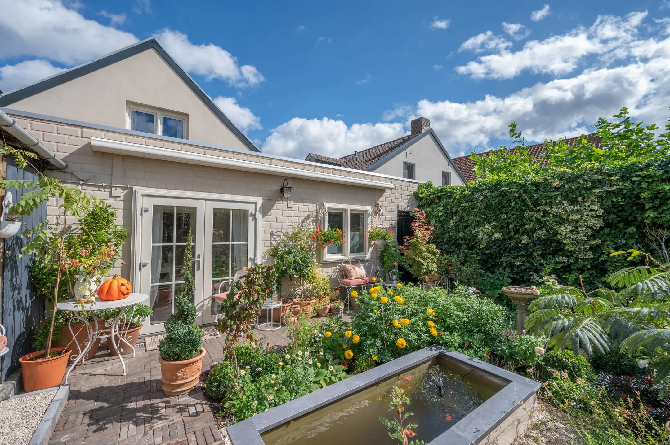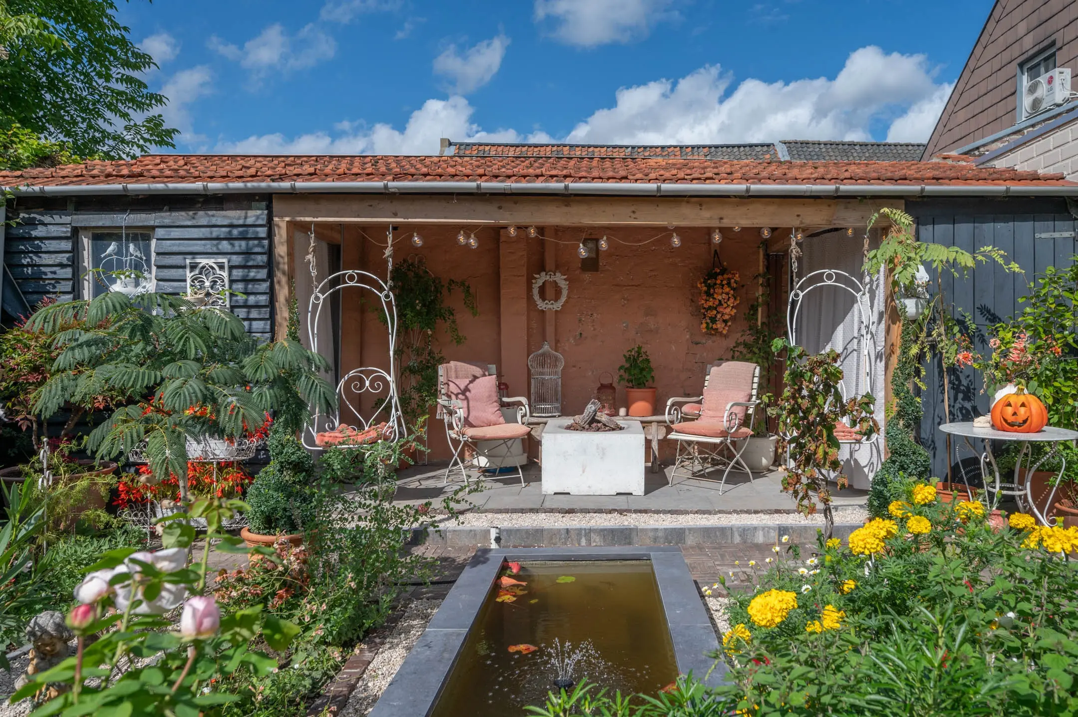 • Fraai aangelegde, omsloten tuin met overdekt terras, vijver en eigen achterom