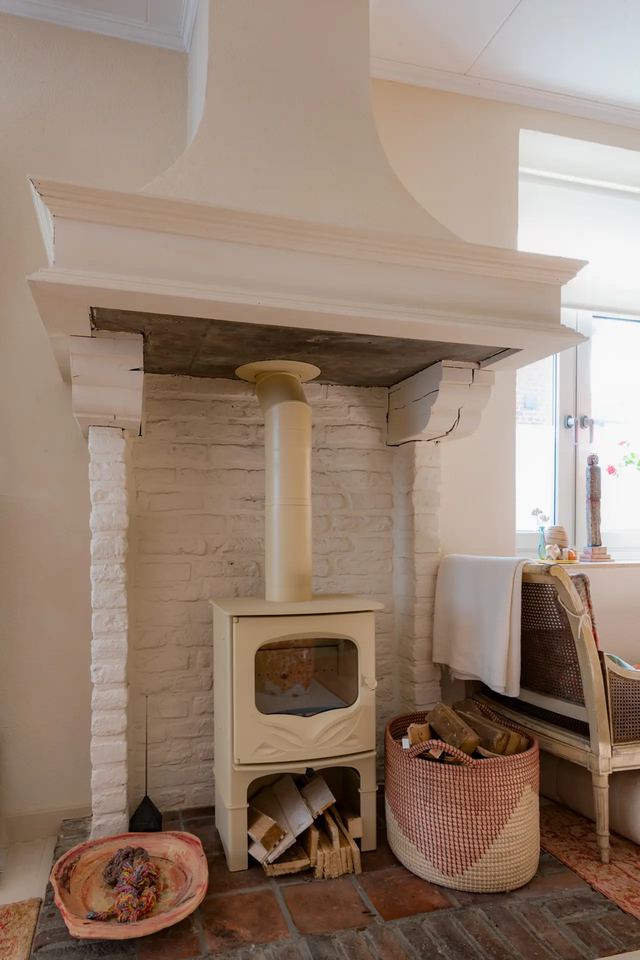 De royale woonkamer (ca 33 m²) ademt sfeer en gezelligheid, mede dankzij de centraal geplaatste nieuwe houtkachel (2025). Rondom de sfeervolle houtkachel is een knusse zithoek gemaakt. De grote raampartijen zorgen voor volop daglicht, terwijl de houten plankenvloer het geheel een warme uitstraling geeft.