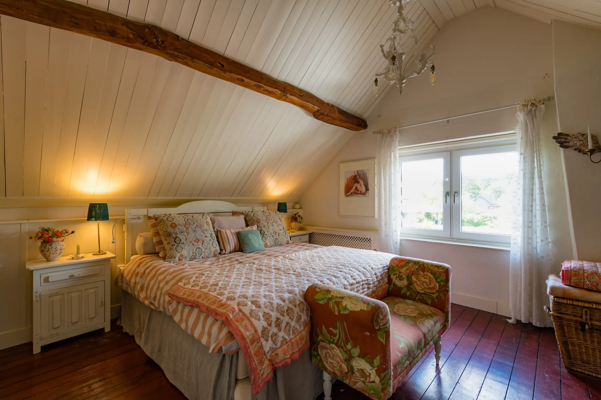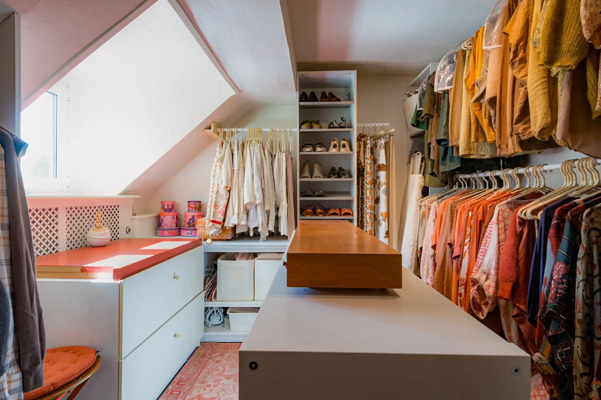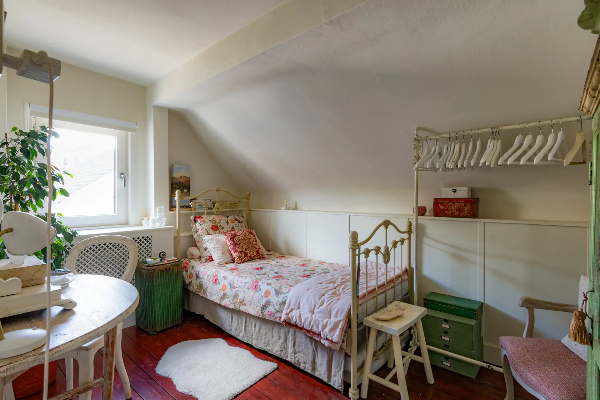 De centraal gelegen slaapkamer, nu ingericht als inloopkast, beschikt over een dakkapel die voor een lichte en luchtige sfeer zorgt. De originele houten vloeren zijn op de hele verdieping behouden gebleven – een prachtige herinnering aan de historie van het huis.