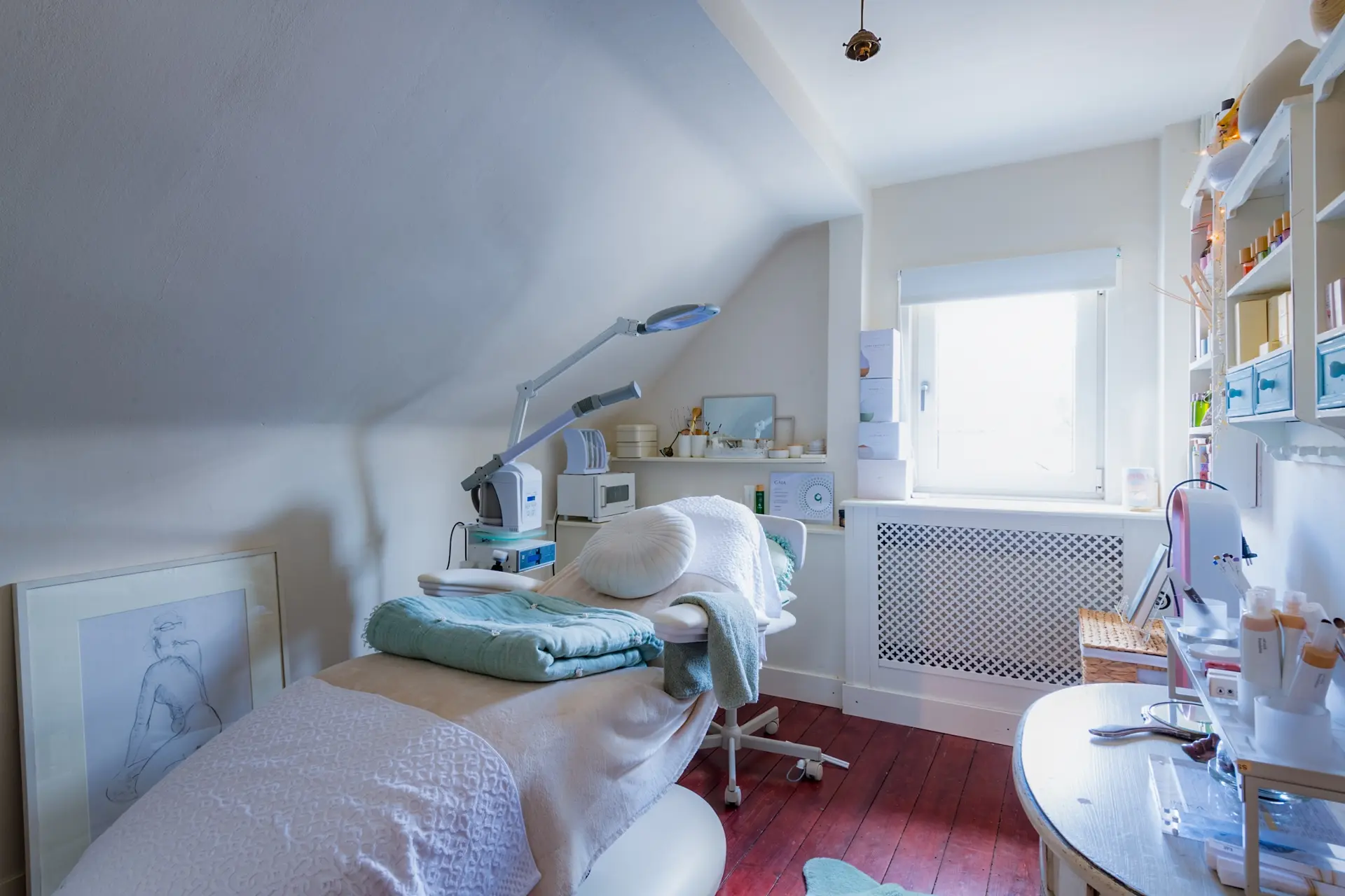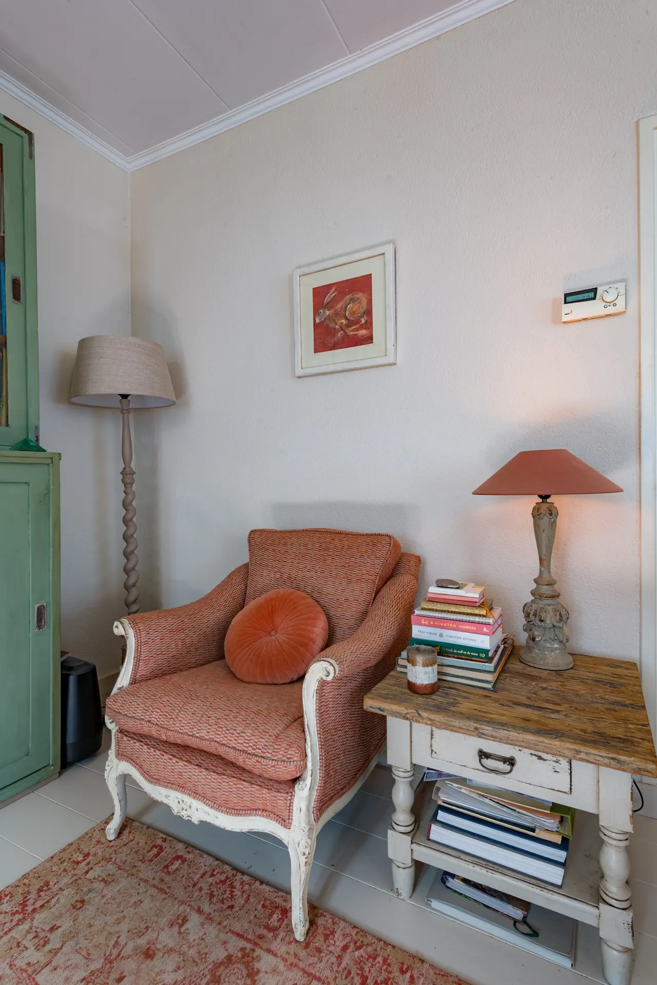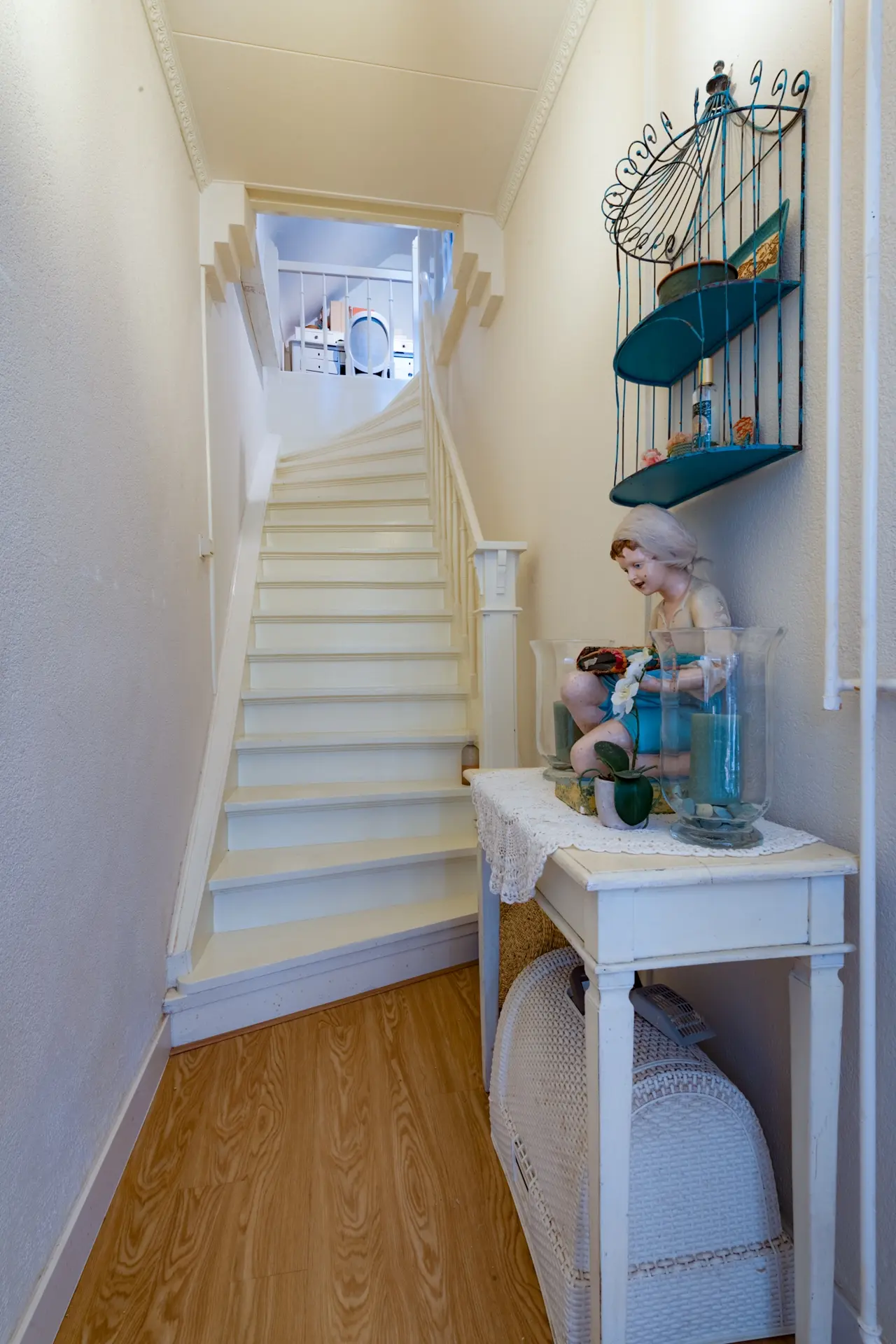 De centraal gelegen slaapkamer, nu ingericht als inloopkast, beschikt over een dakkapel die voor een lichte en luchtige sfeer zorgt. De originele houten vloeren zijn op de hele verdieping behouden gebleven – een prachtige herinnering aan de historie van het huis.