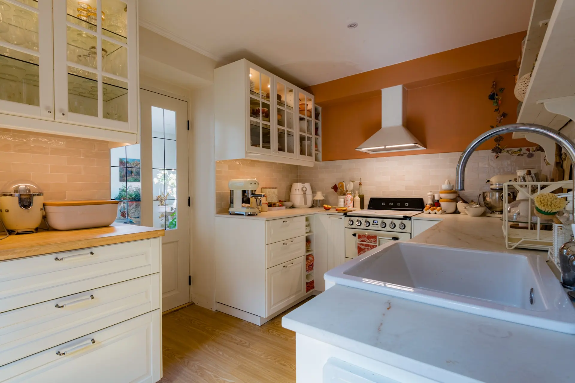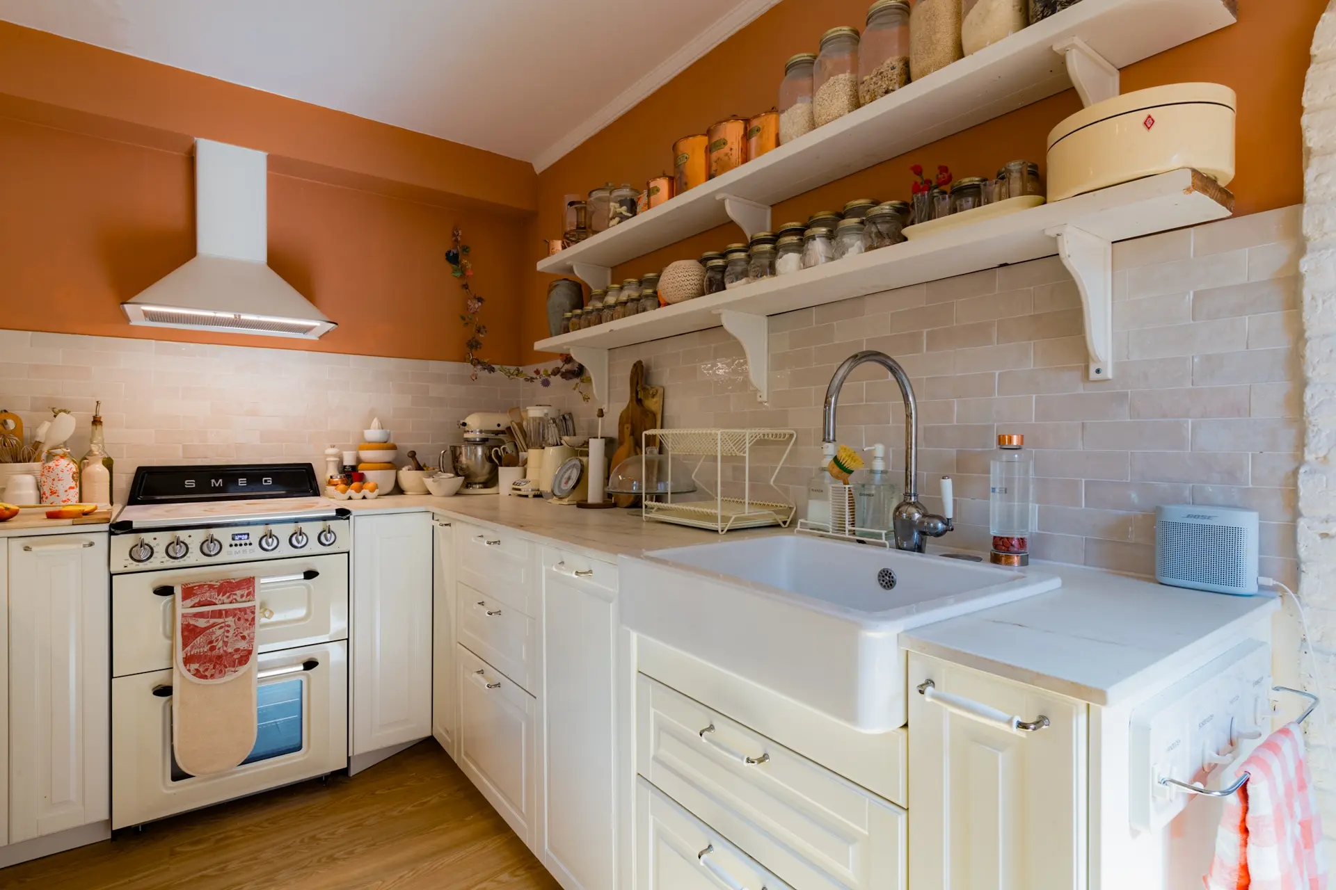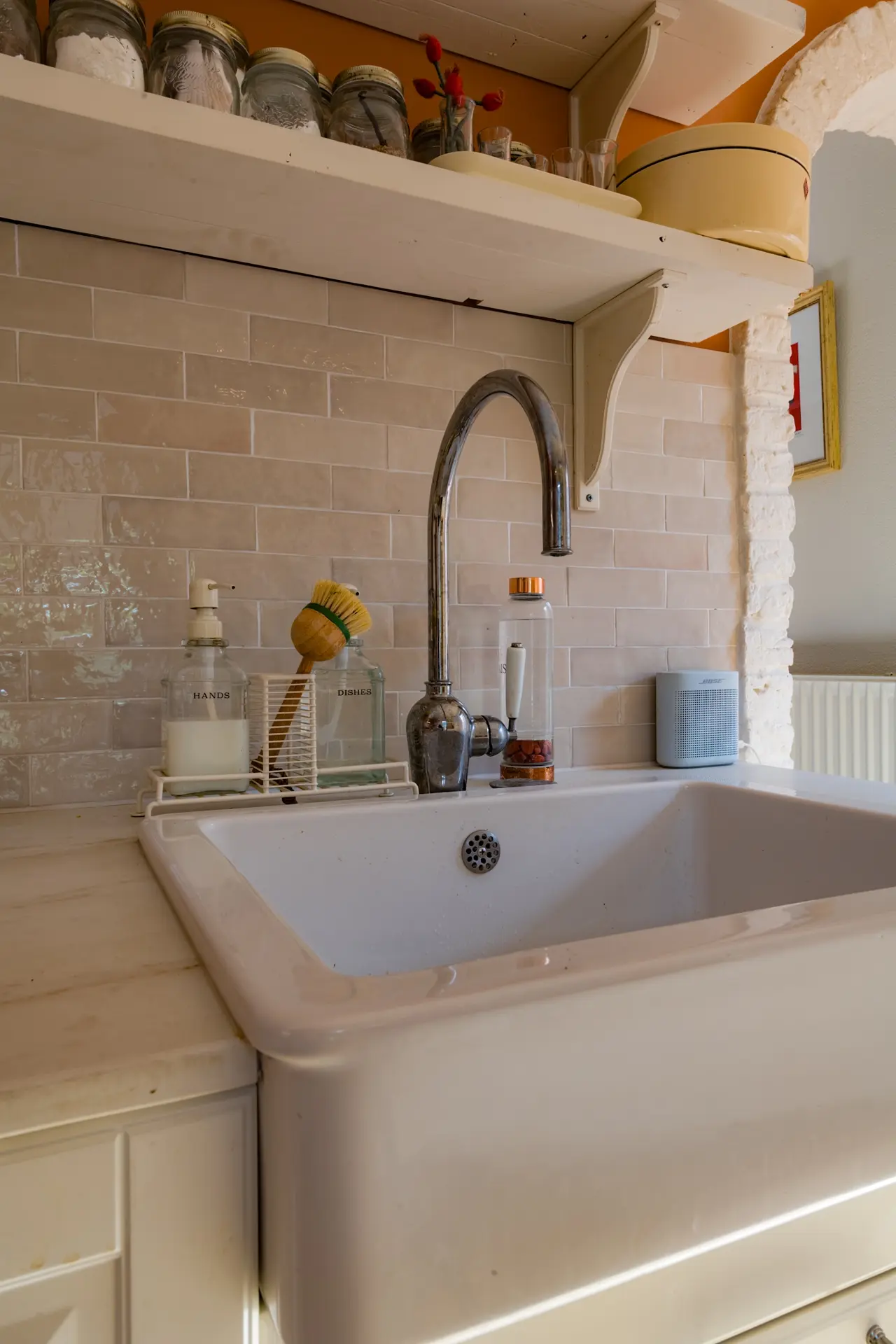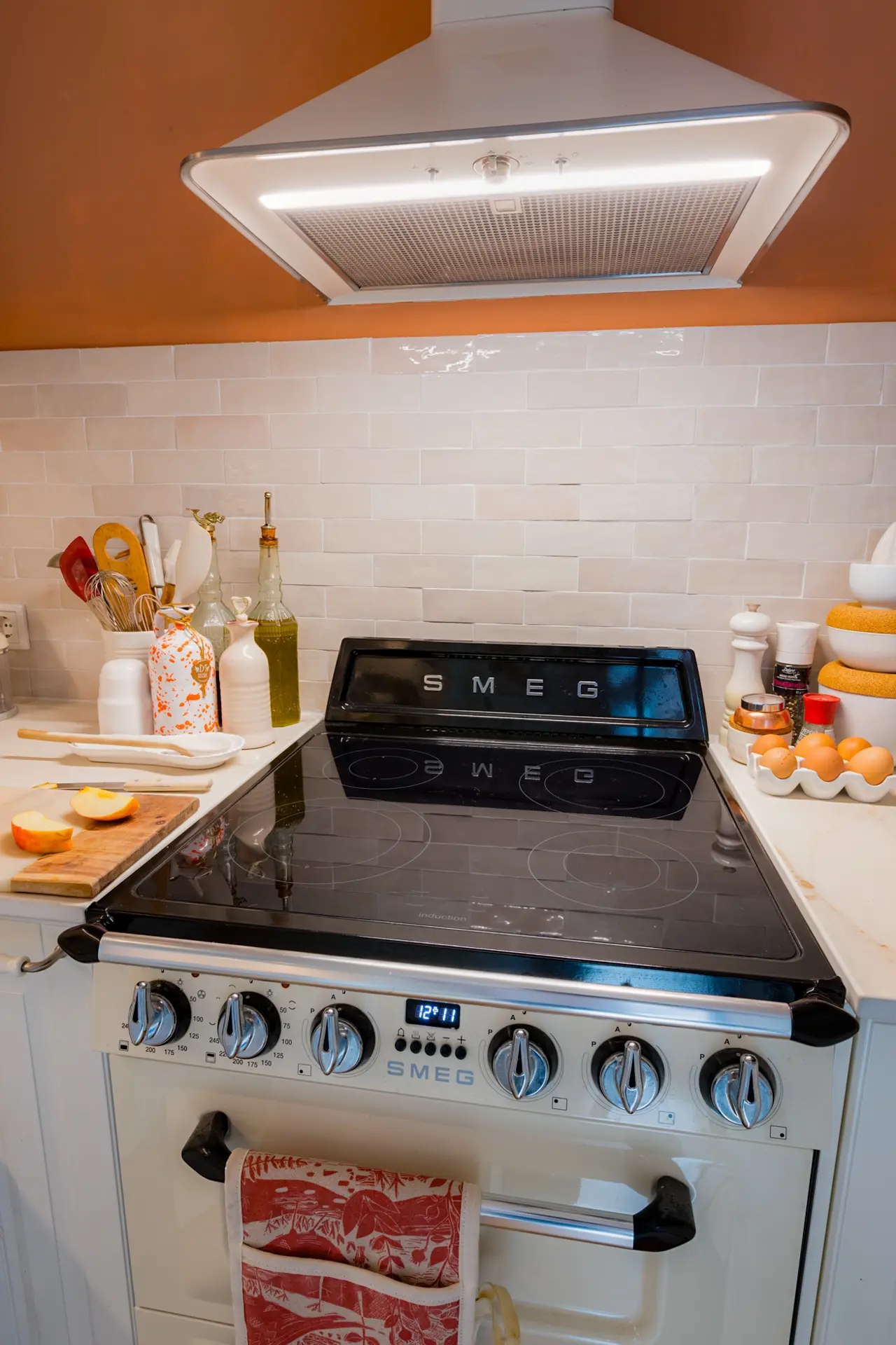 Vanuit de living betreed je de keuken. Deze is volledig vernieuwd (2025) in de stijl van de woning, met oog voor detail en afwerking. De keuken is voorzien van een Smeg 4-pits inductiefornuis met 2 multifunctionele ovens en bijbehorende afzuigkap, robuuste wasbak, vaatwasser en koelkast. Vanuit de keuken is er toegang tot zowel de oprit als de aanbouw.