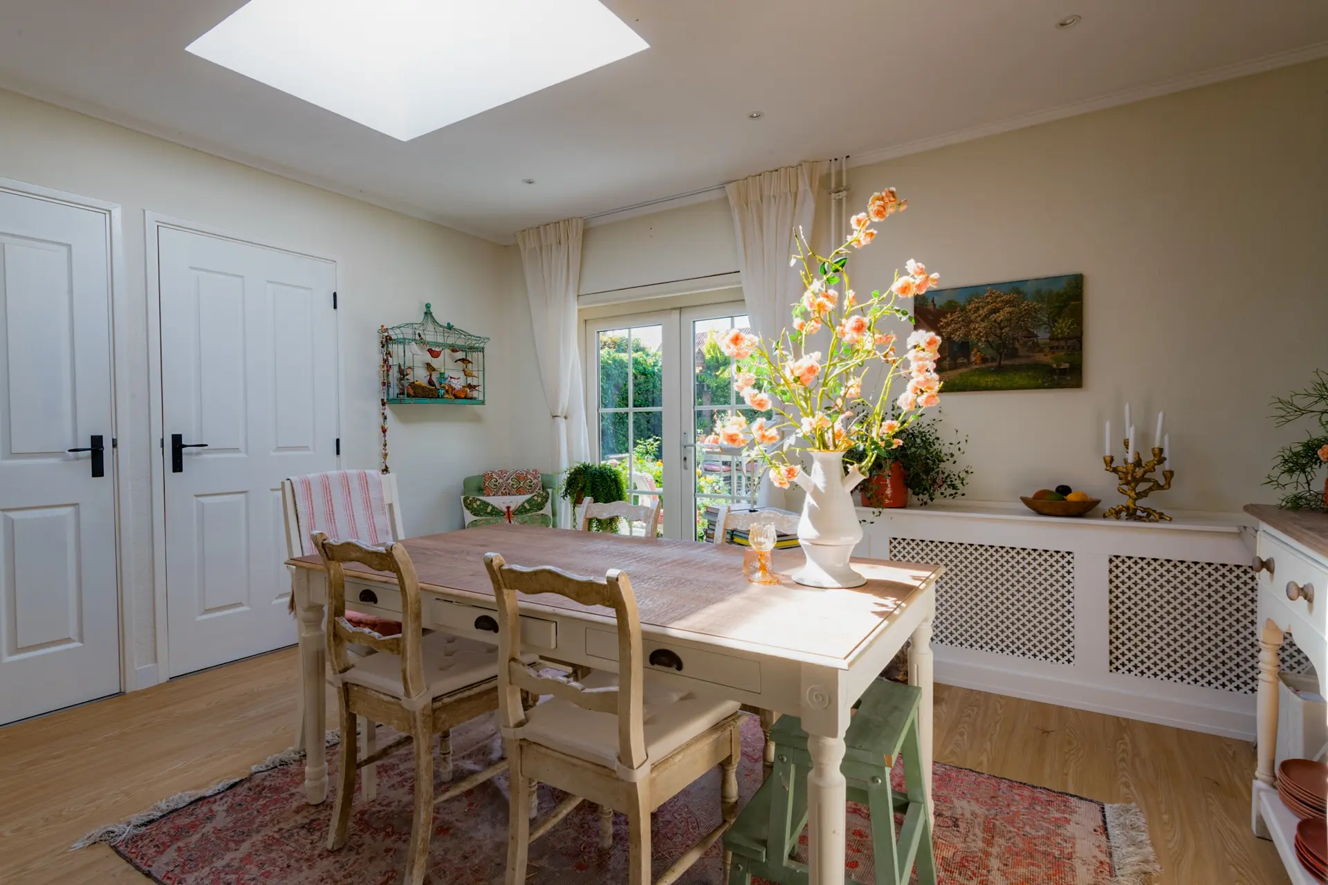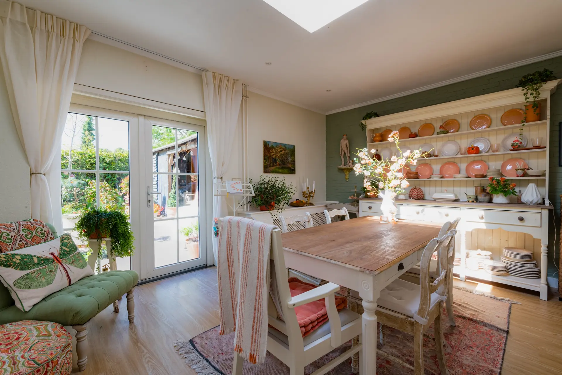 Dankzij de openslaande tuindeuren is er vanuit de uitbouw een optimaal contact met de tuin, waardoor binnen en buiten naadloos in elkaar overlopen