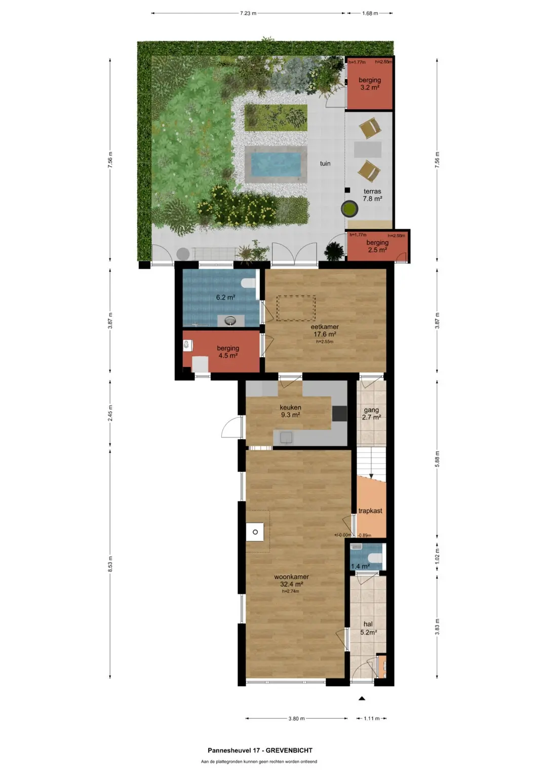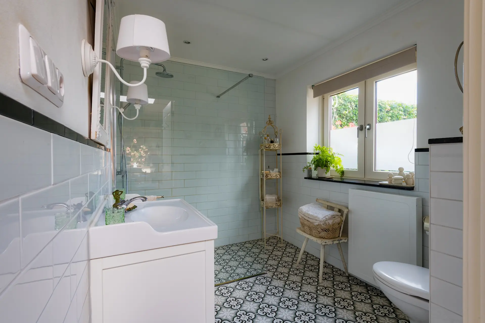 De tuinkamer (ca. 18 m²) biedt een heerlijke extra leefruimte en is voorzien van een royale, triple glas, lichtkoepel, die zorgt voor een overvloed aan natuurlijk licht. Vanuit deze ruimte heb je directe toegang tot de moderne badkamer (ca. 6 m²), uitgerust met een inloopdouche, wastafel en hangcloset.