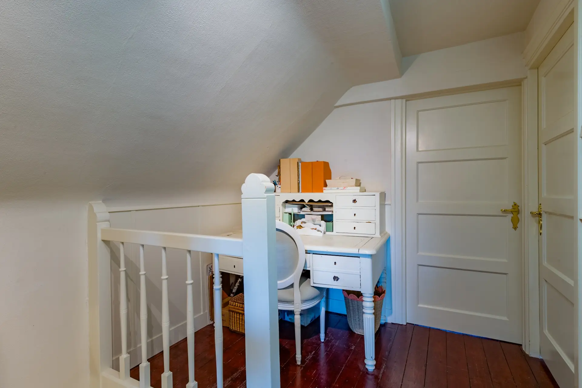 De ruime overloop geeft toegang tot 4 volwaardige slaapkamers. De masterbedroom aan de achterzijde valt op door de zichtbare originele houten spanten en biedt toegang tot de vliering.