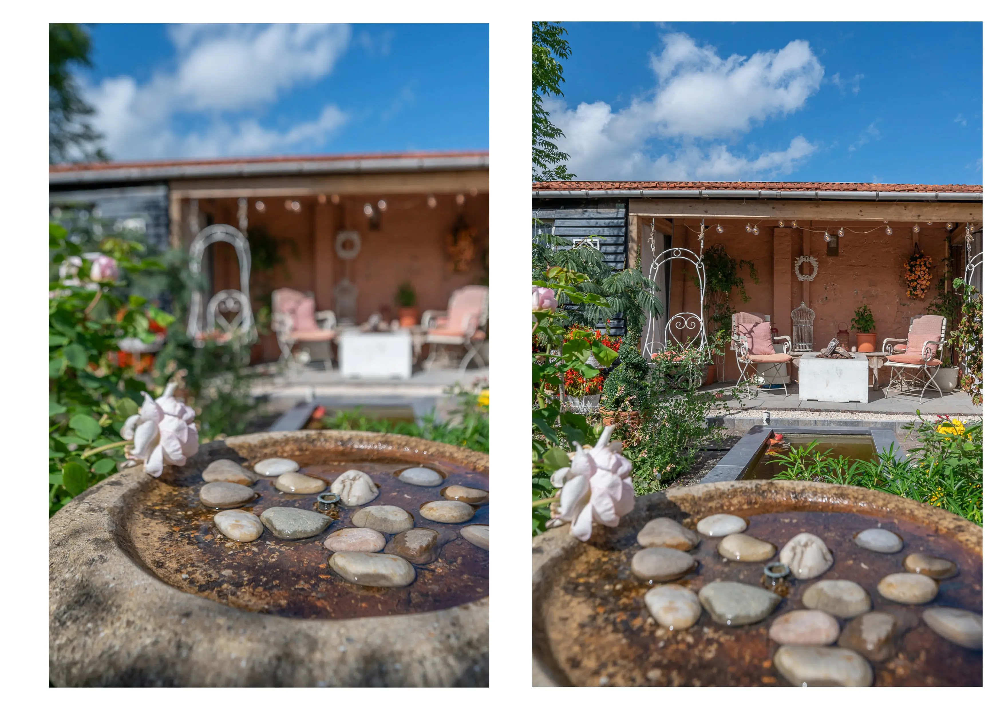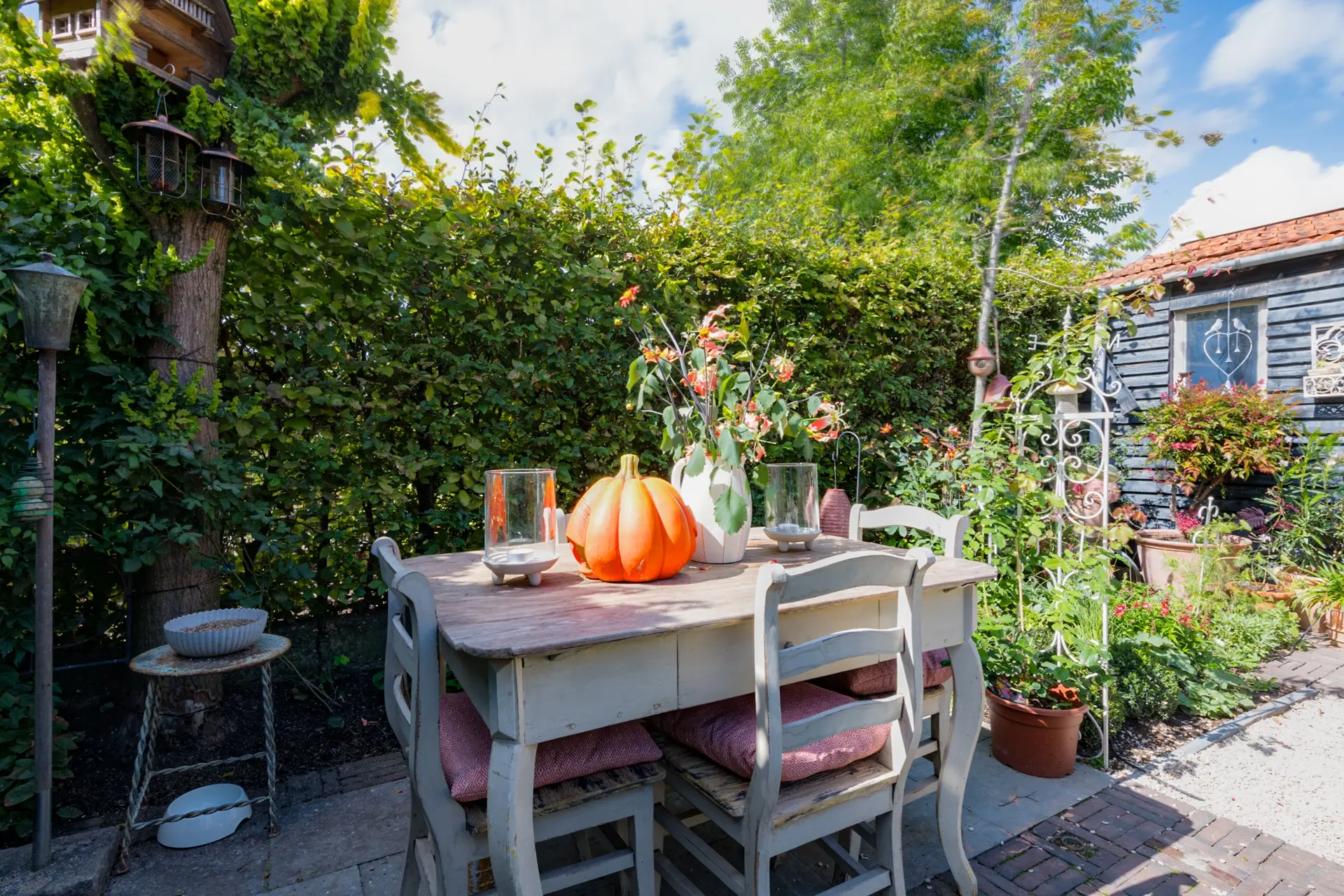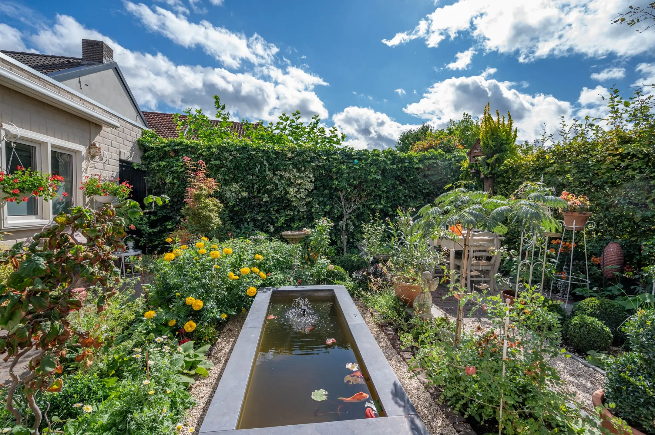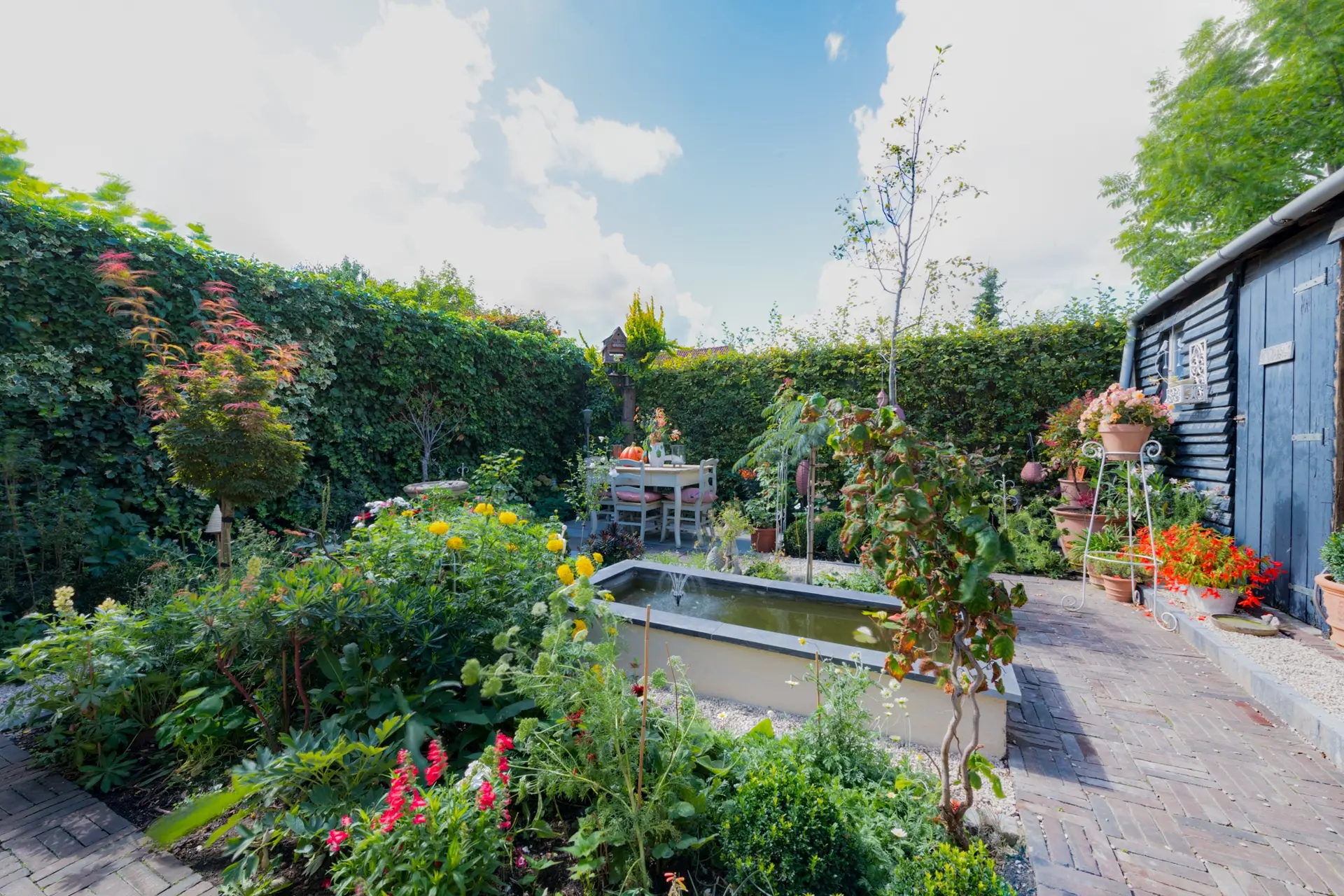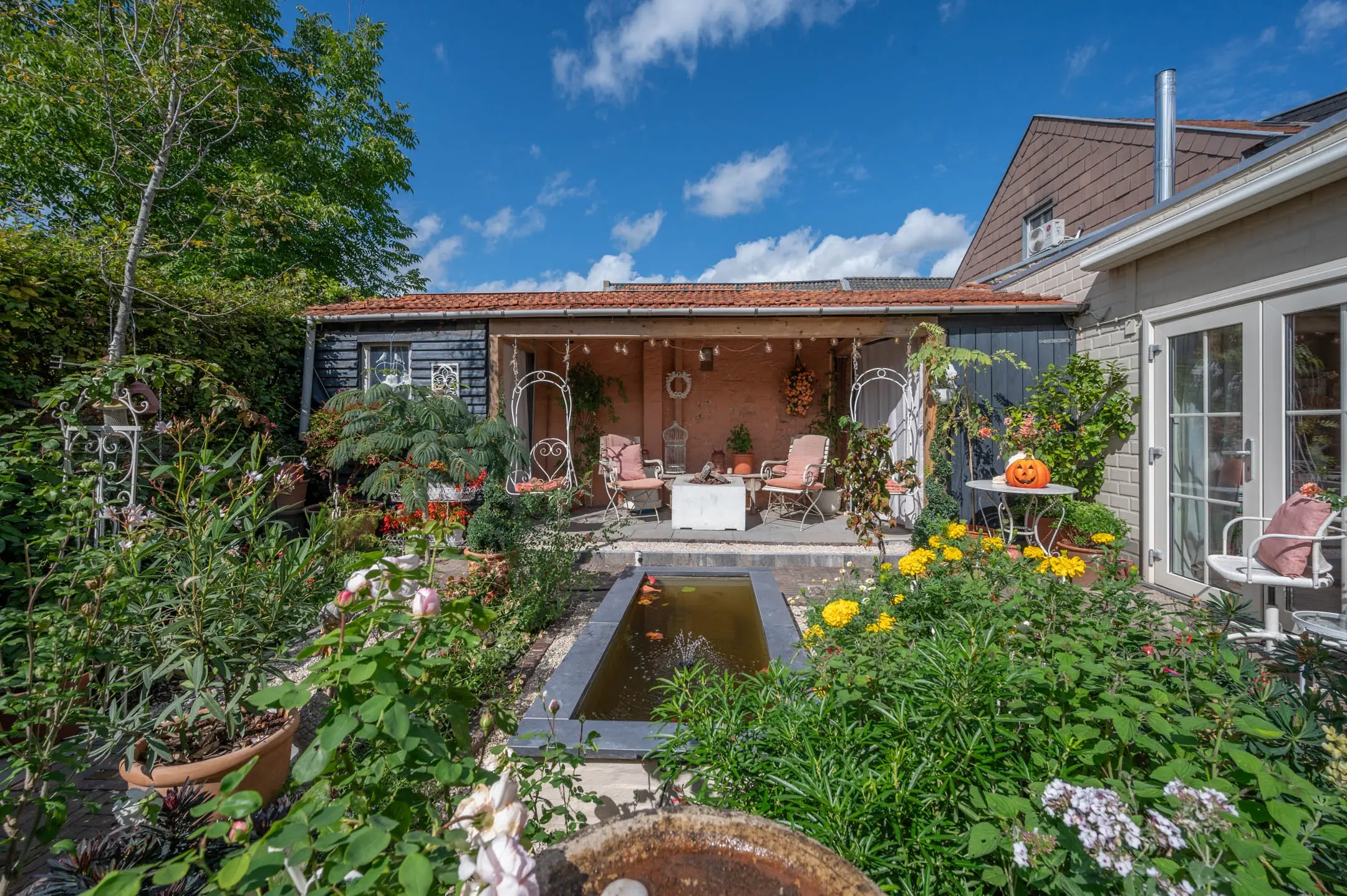 De tuin is in 2025 volledig opnieuw ingericht en straalt een gevoel van rust en harmonie uit. Een smaakvolle combinatie van bloemen, planten en een sfeervol vijvertje maakt dit tot een heerlijke plek om te ontspannen. Bovendien beschikt de tuin over een eigen achterom, bereikbaar via de oprit.