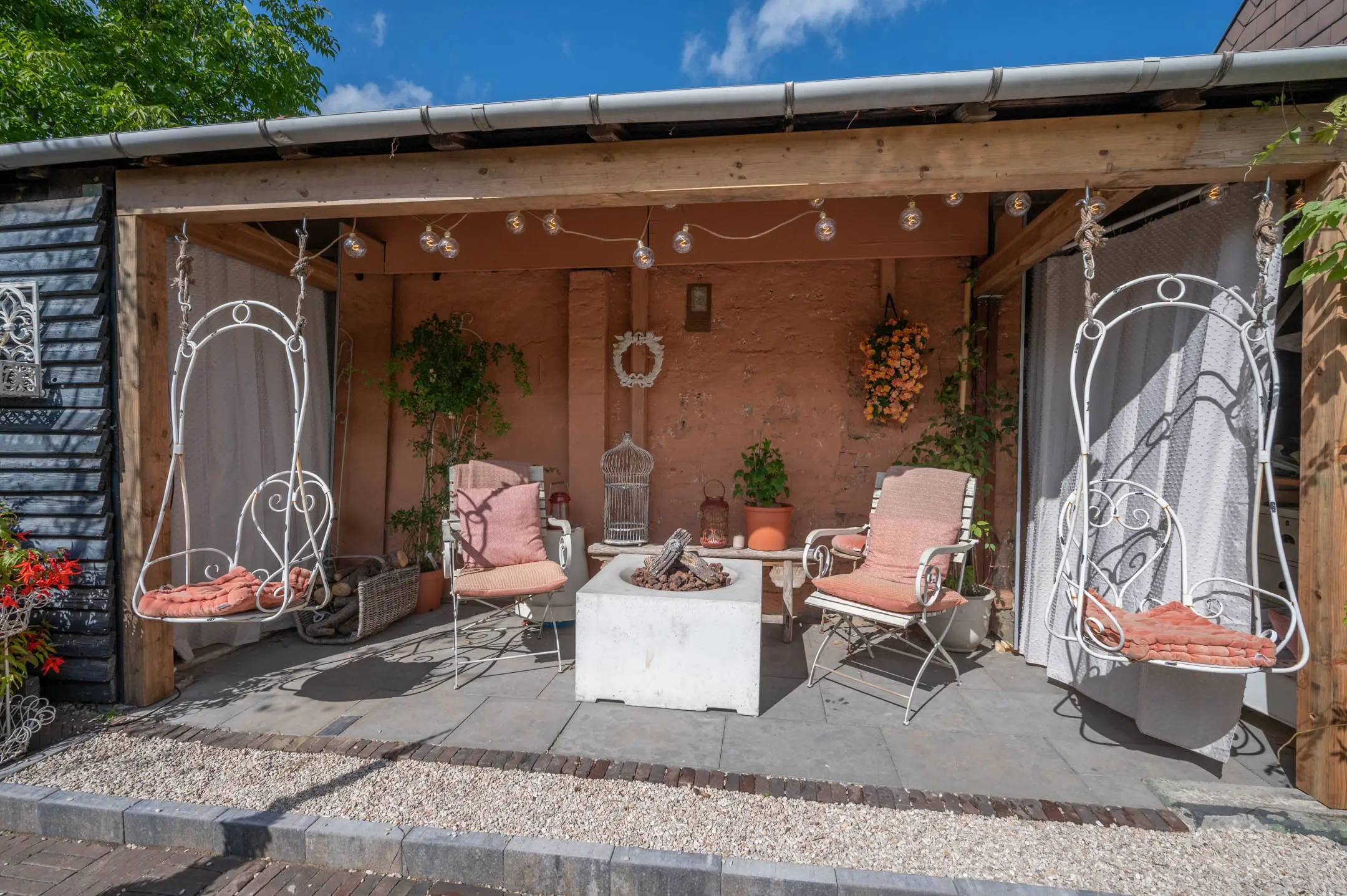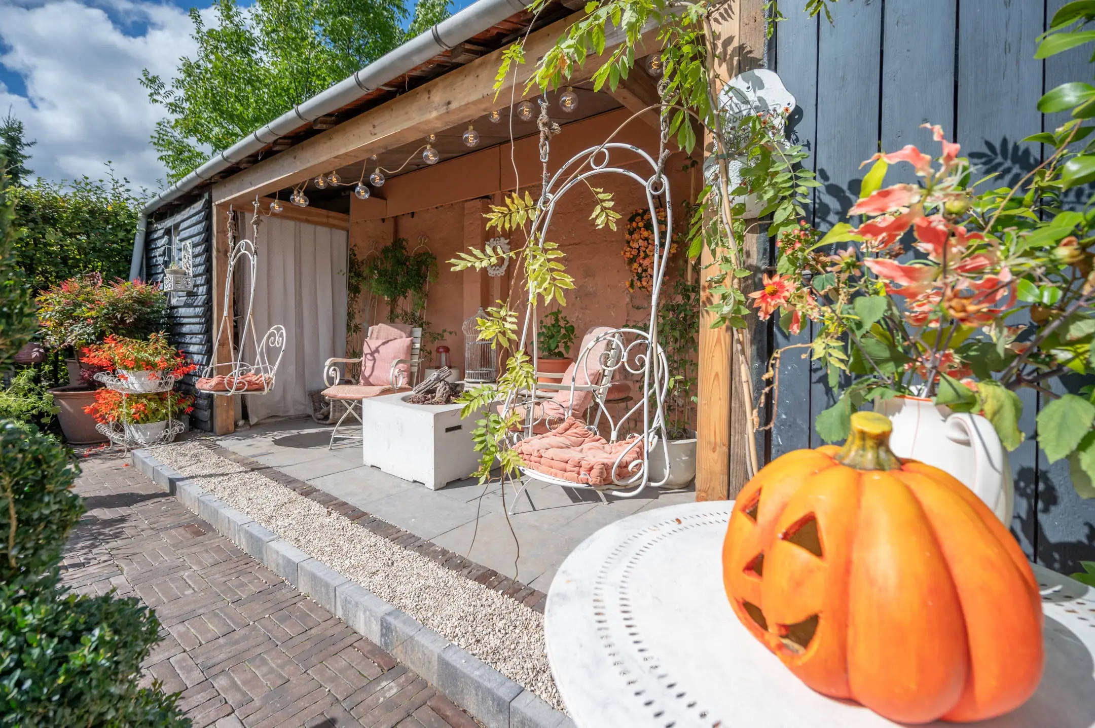 De houten berging is deels getransformeerd tot een charmant overdekt terras, waar je het hele jaar door van het buitenleven kunt genieten. Verder is de tuin voorzien van stijlvolle bestrating en een royaal elektrisch zonnescherm. Dankzij de omsloten ligging vormt de tuin een intieme oase van privacy.