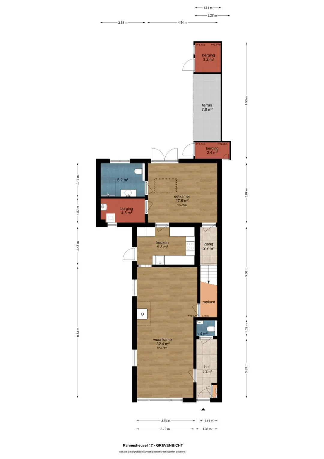Ook de bijkeuken met CV-opstelling en witgoedaansluitingen, evenals de trap naar de eerste verdieping, zijn hier gesitueerd.