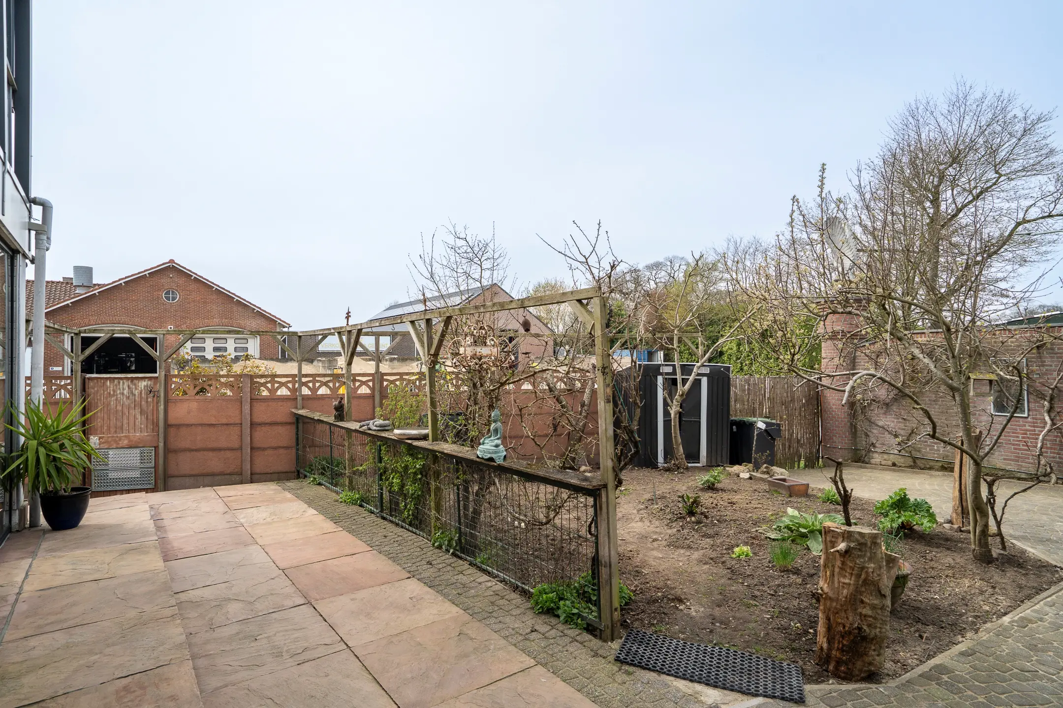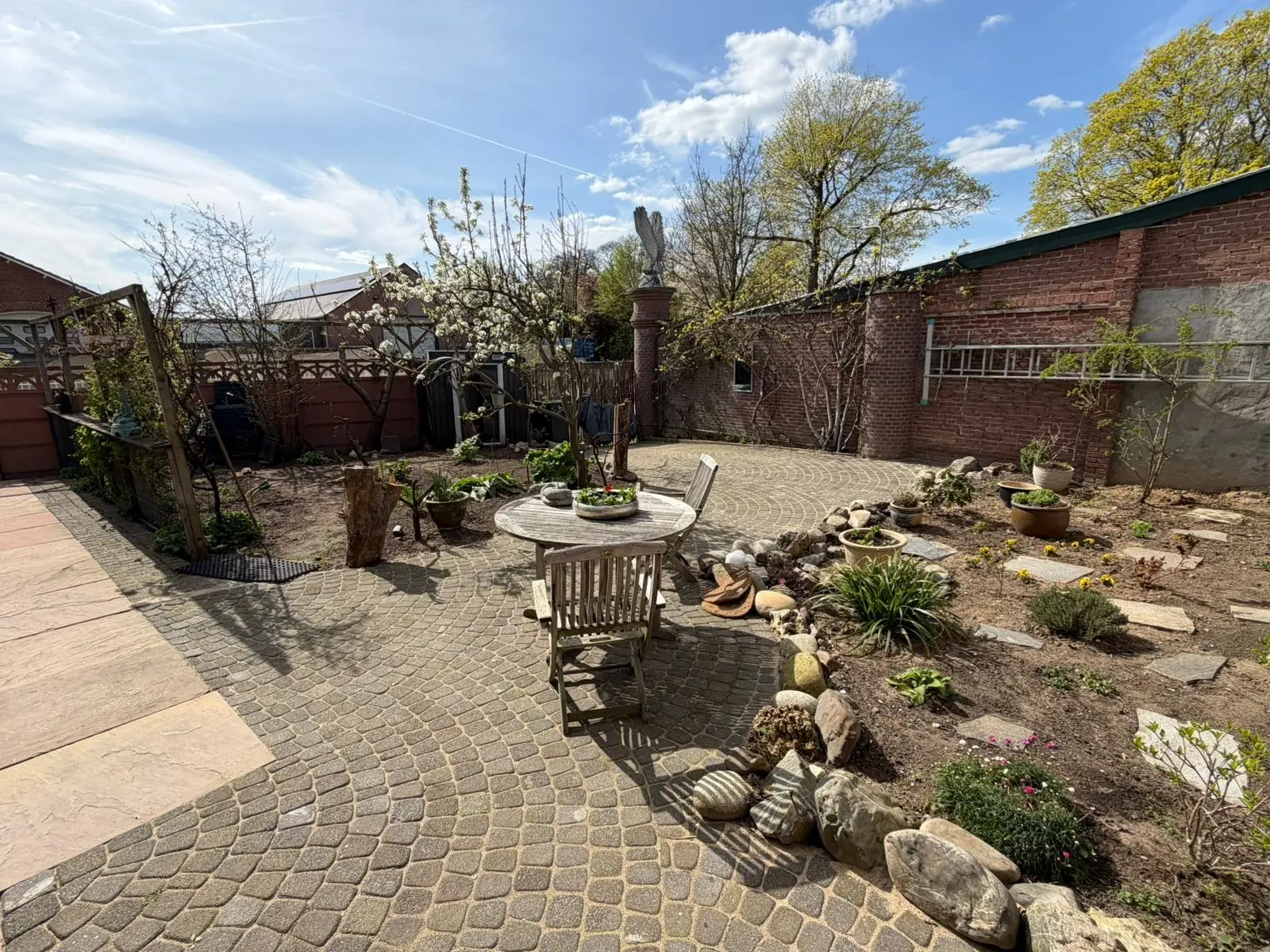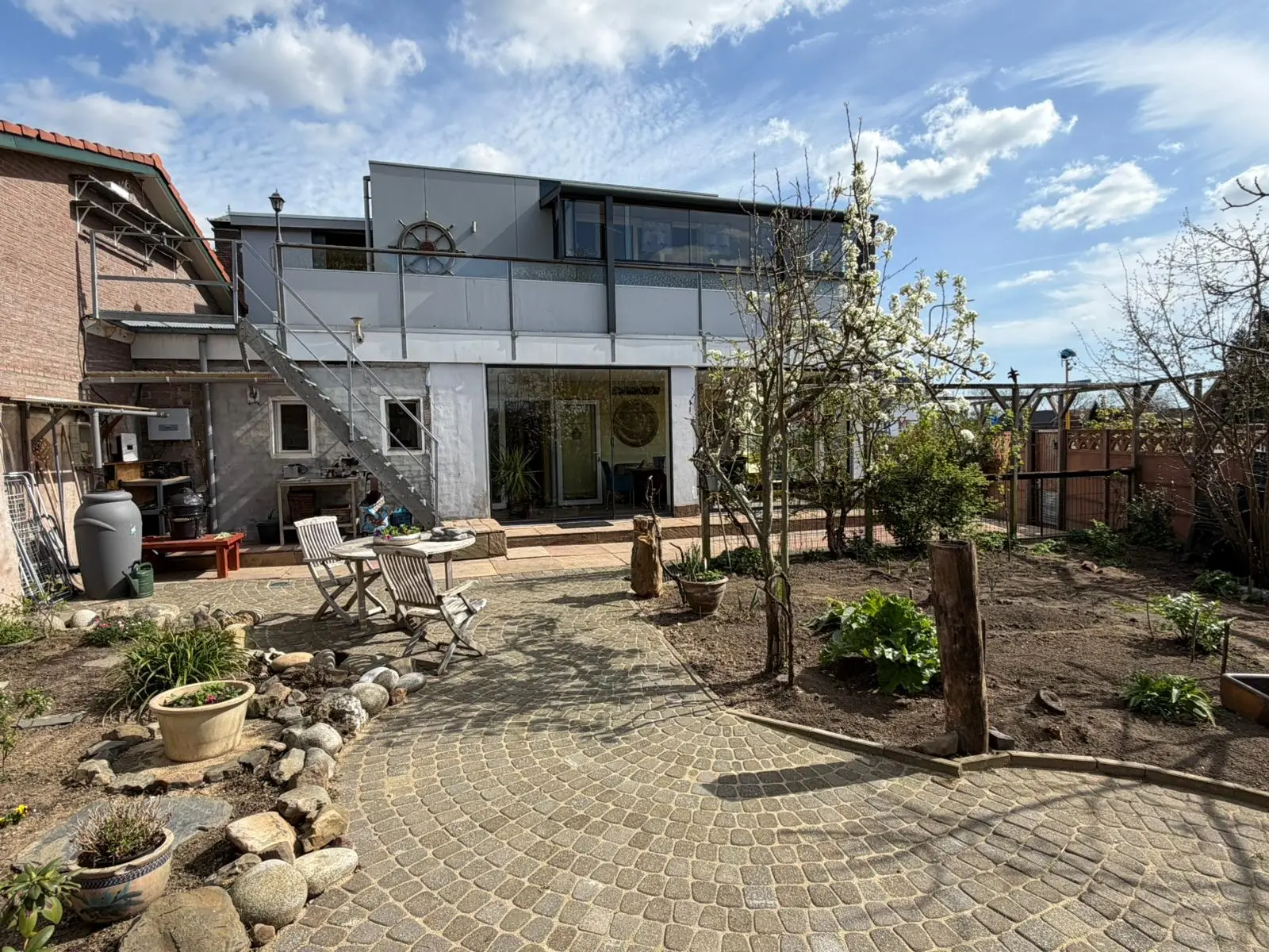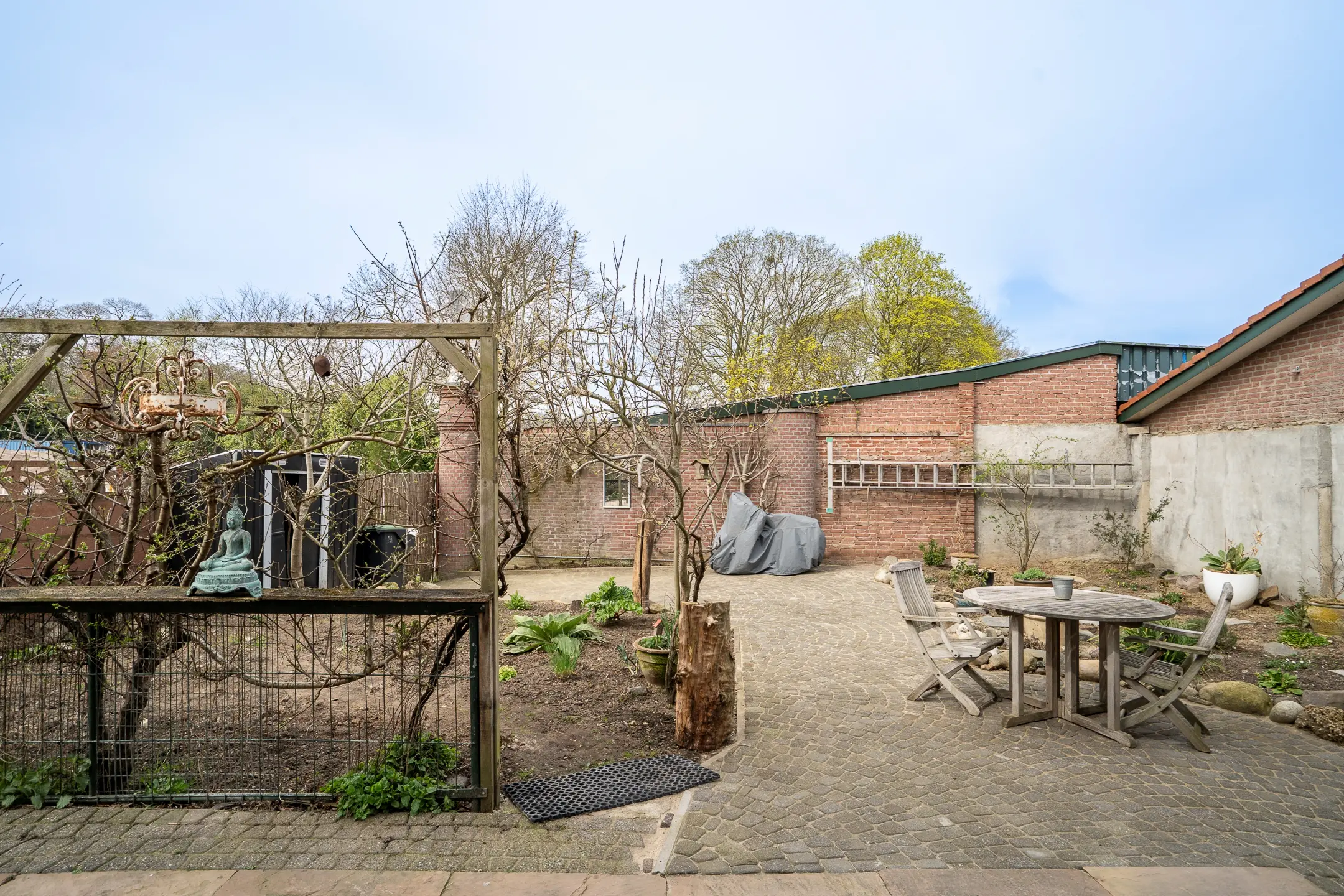 De tuin is ruim en veelzijdig, en via twee poorten toegankelijk.
