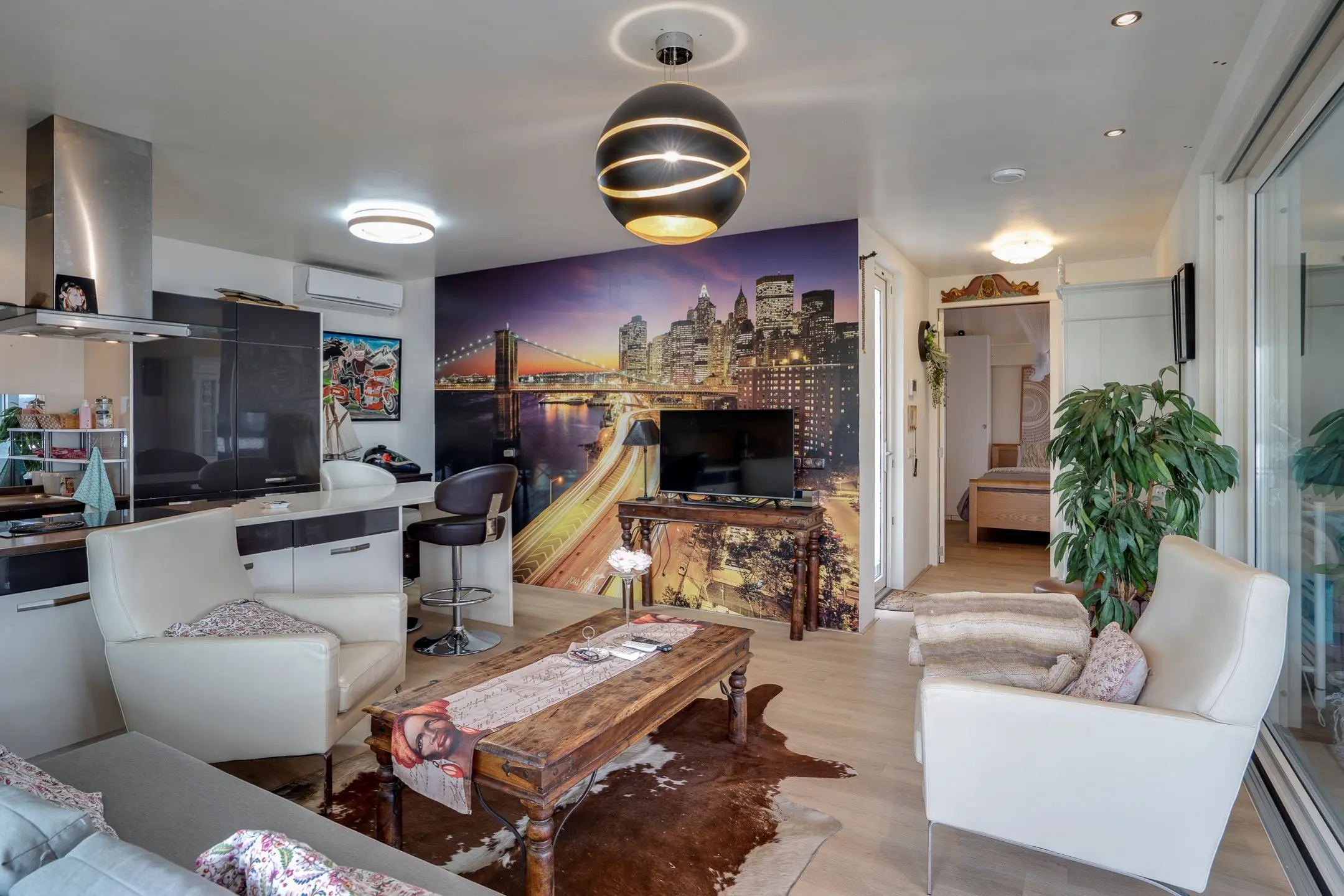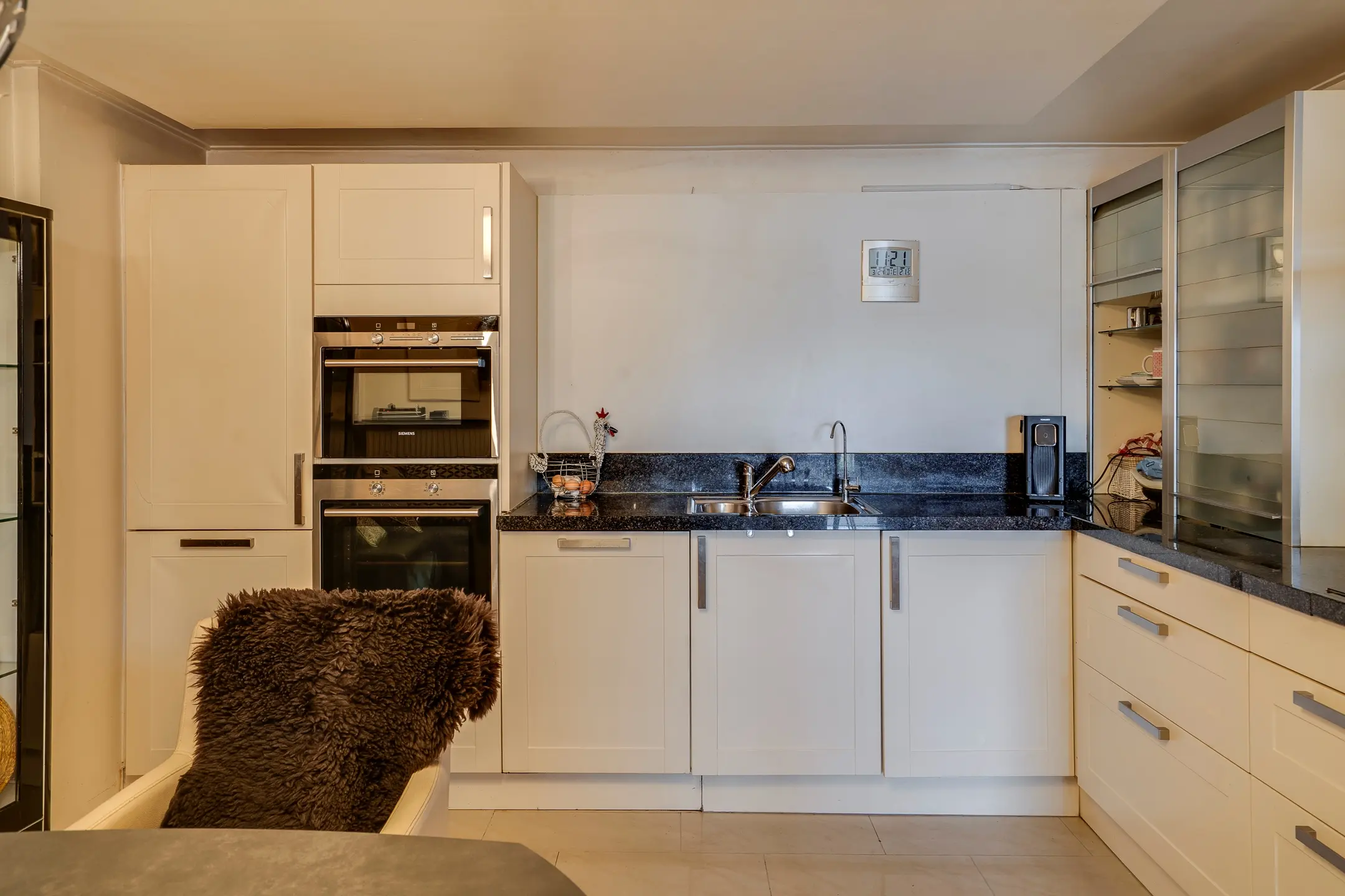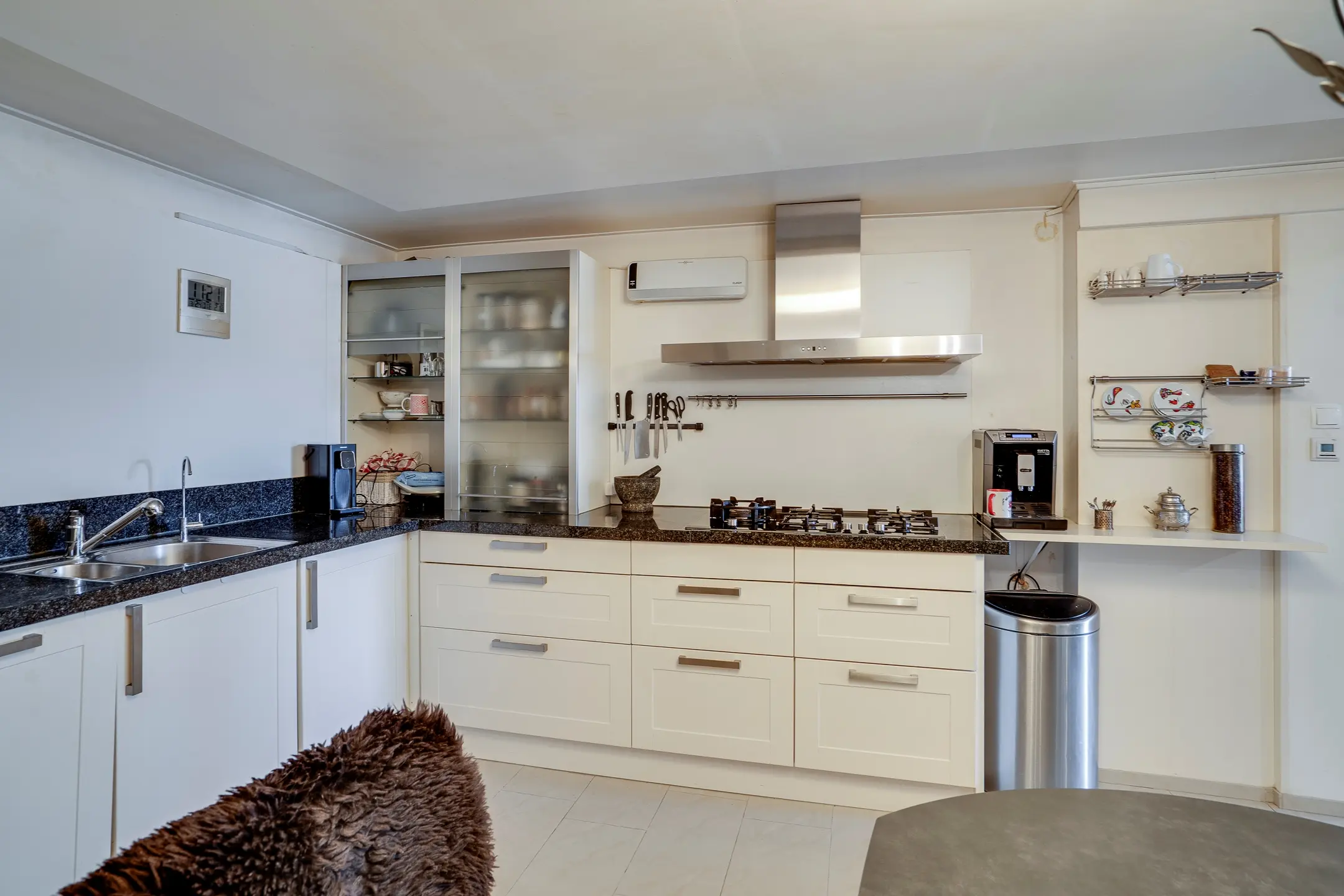 Binnen vind je een moderne keuken met kookeiland en diverse inbouwapparatuur. De airconditioning zorgt het hele jaar door voor een aangenaam klimaat.