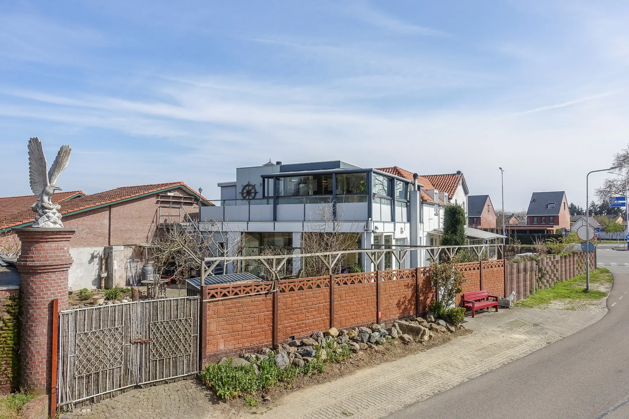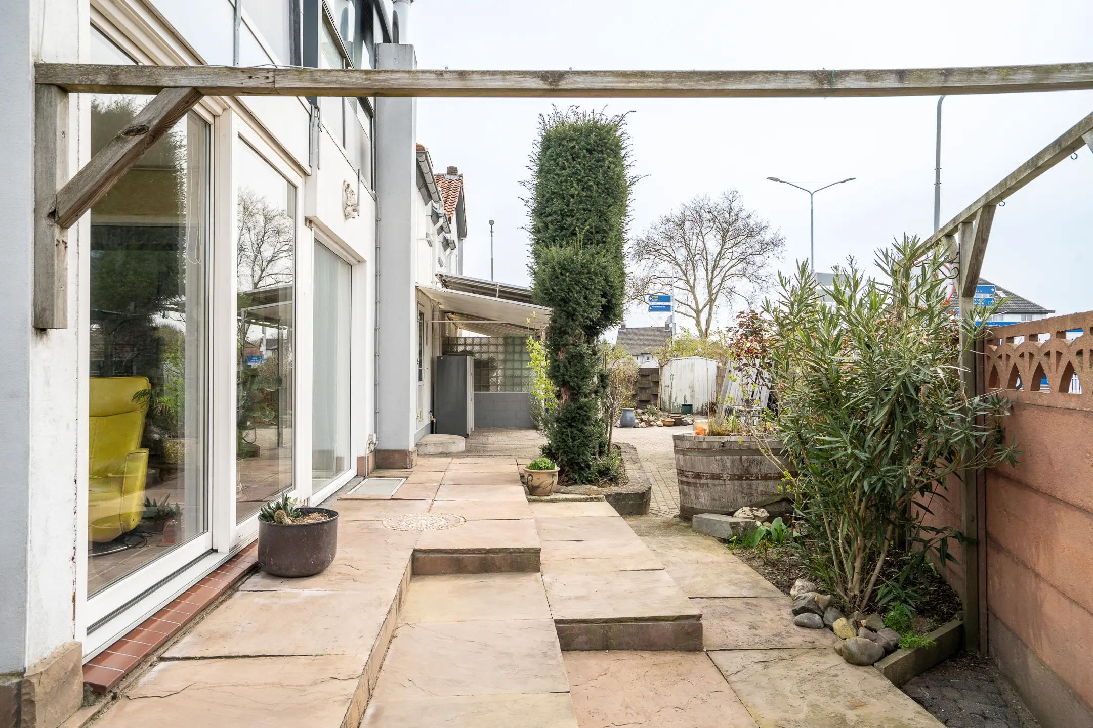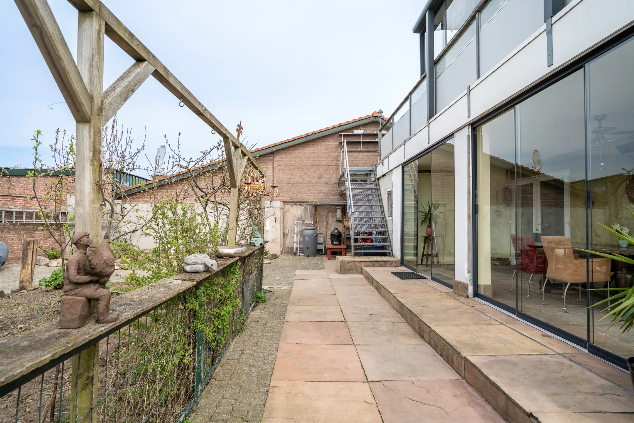 Via de looppoort, ter hoogte van de serre, bereik je eenvoudig de hoofdwoning en de trap naar het appartement. De dubbele poort aan de achterzijde biedt toegang tot een gedeelte waar momenteel ruimte is voor minimaal één auto, maar dat zich uitstekend leent voor verdere invulling naar eigen wens.