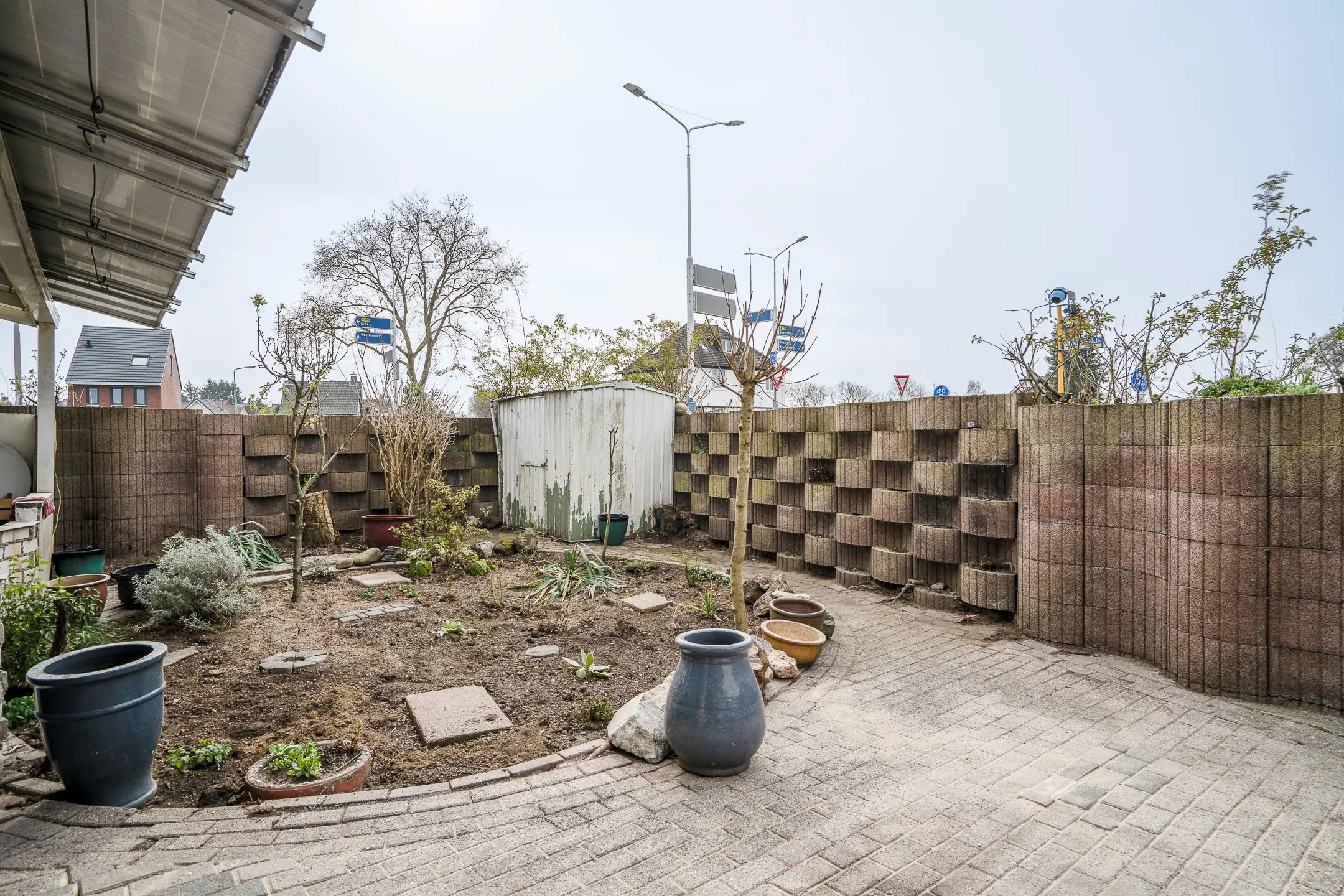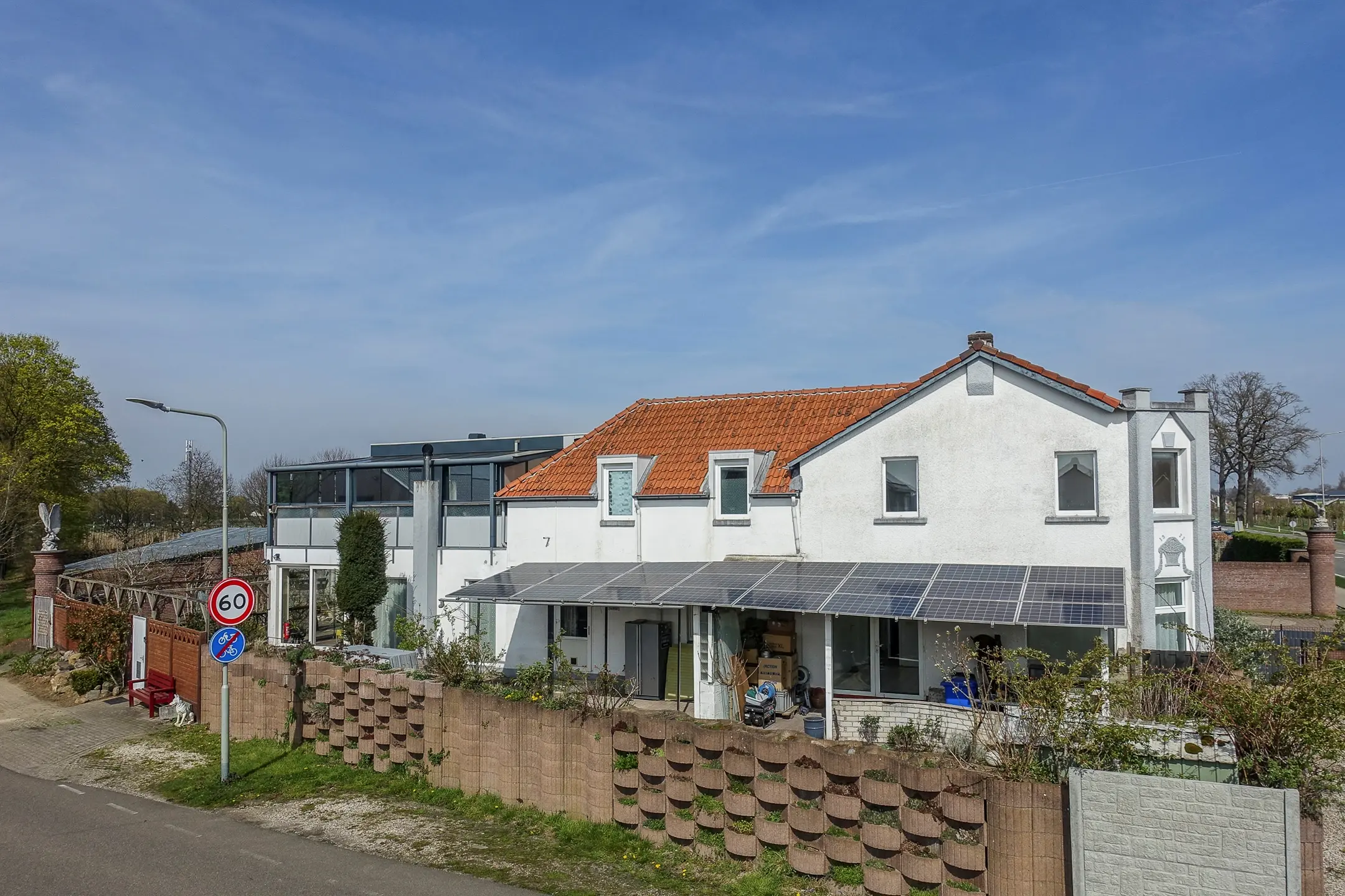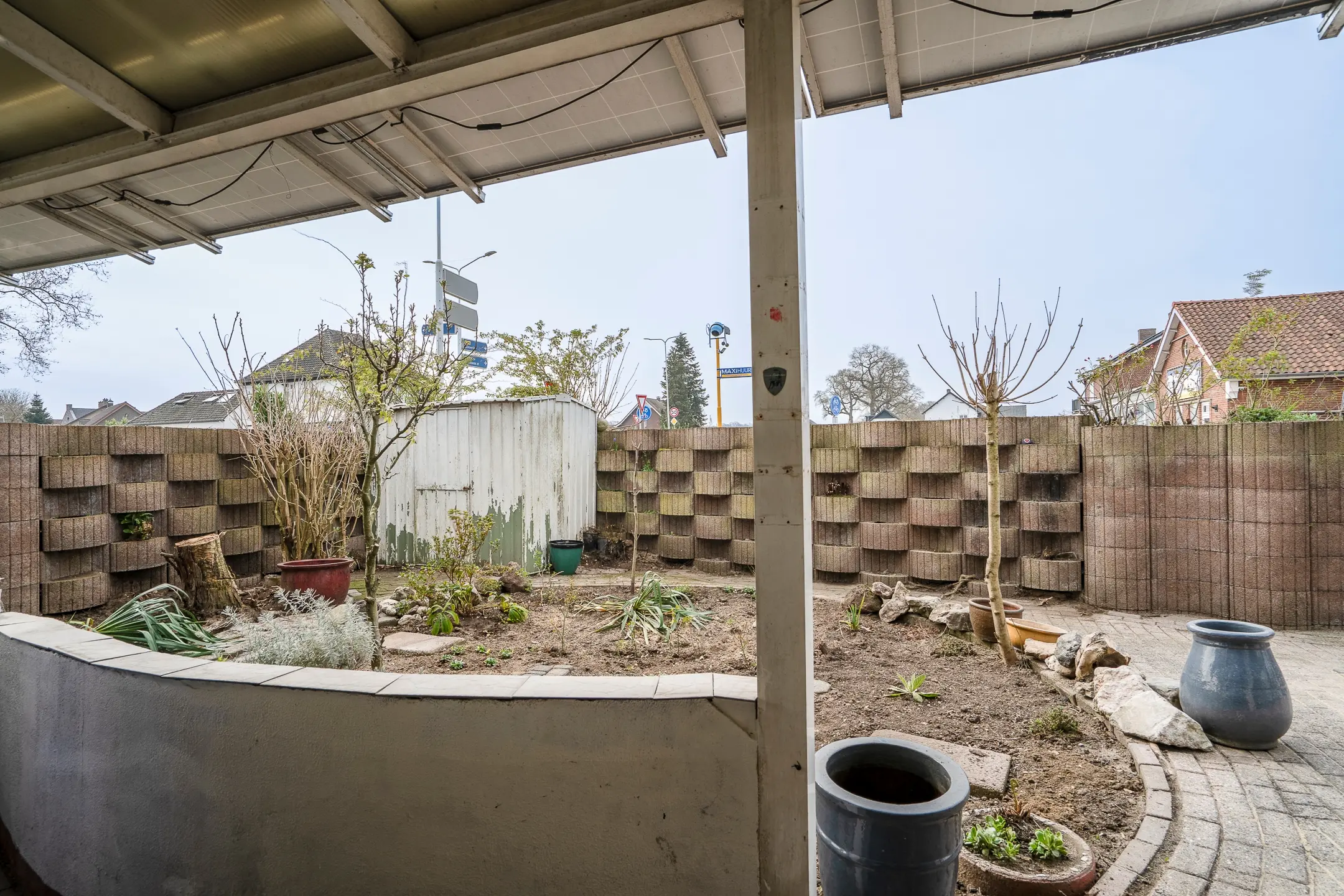 Langs de volledige lengte van de woning is een overkapping gerealiseerd, voorzien van zonnepanelen (20 stuks van 255 Wp). Dit zorgt niet alleen voor beschutting, maar draagt ook bij aan de energievoorziening van de woning.