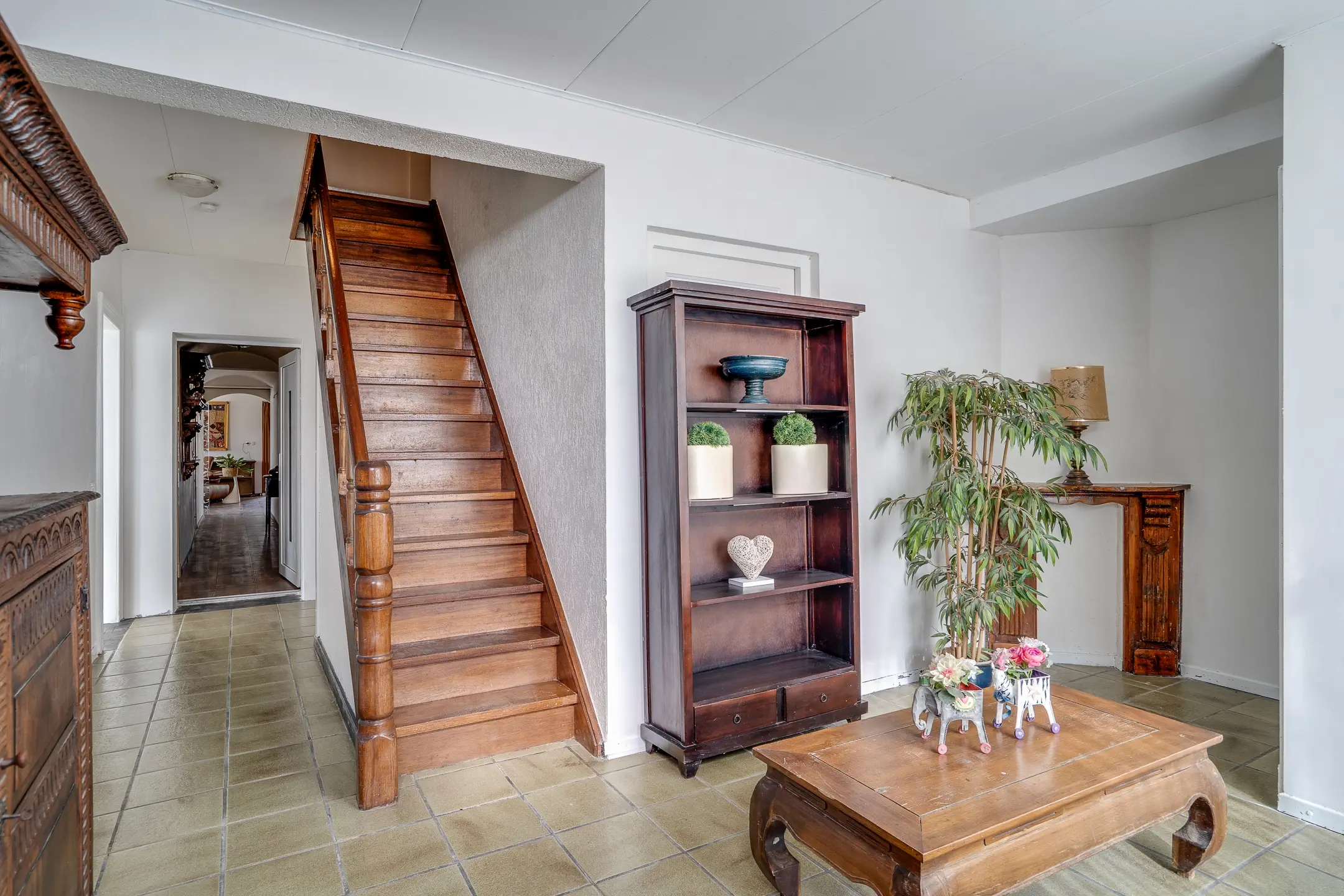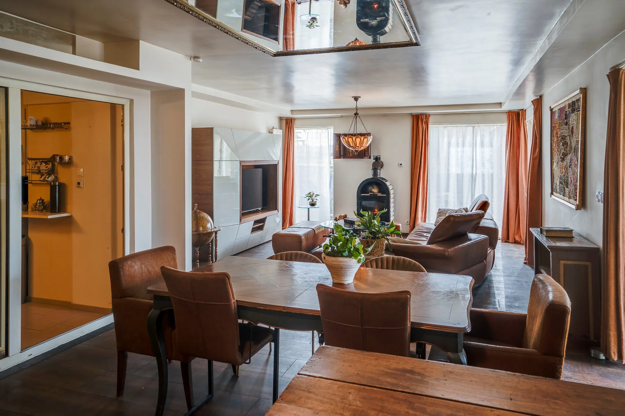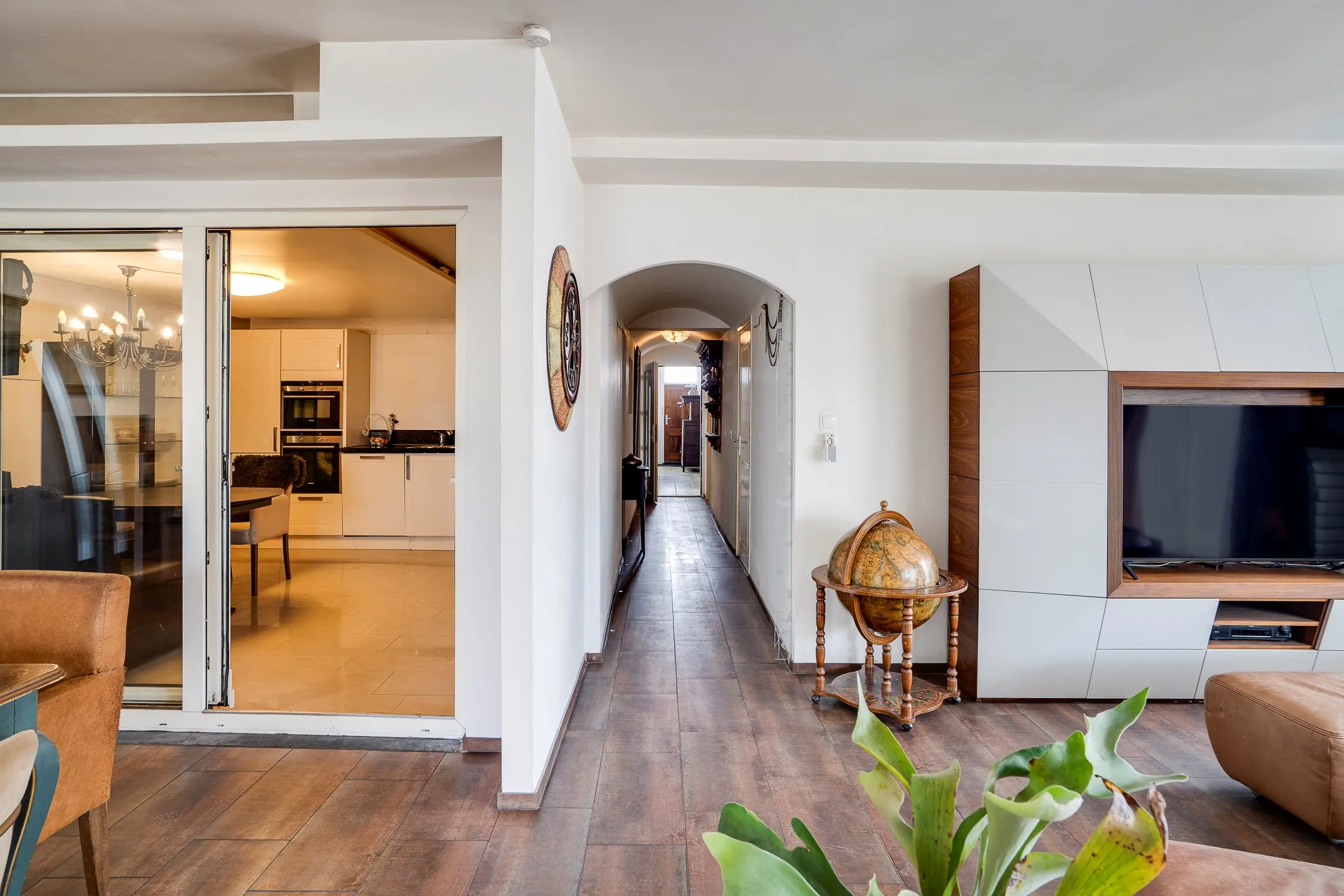 De hoofdwoning is bereikbaar via de centrale hal of via de serre aan de achterzijde en voelt direct als het hart van het huis.