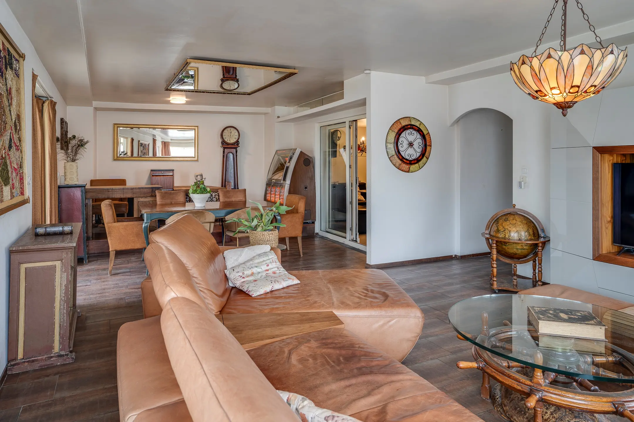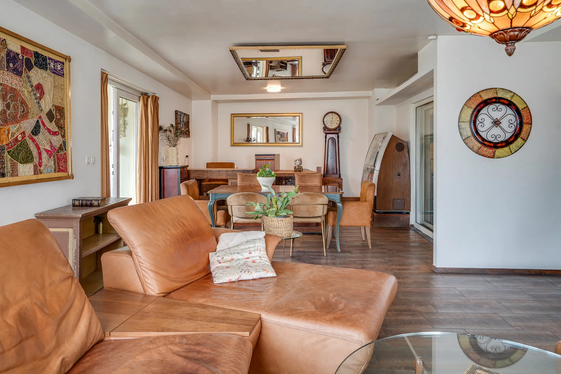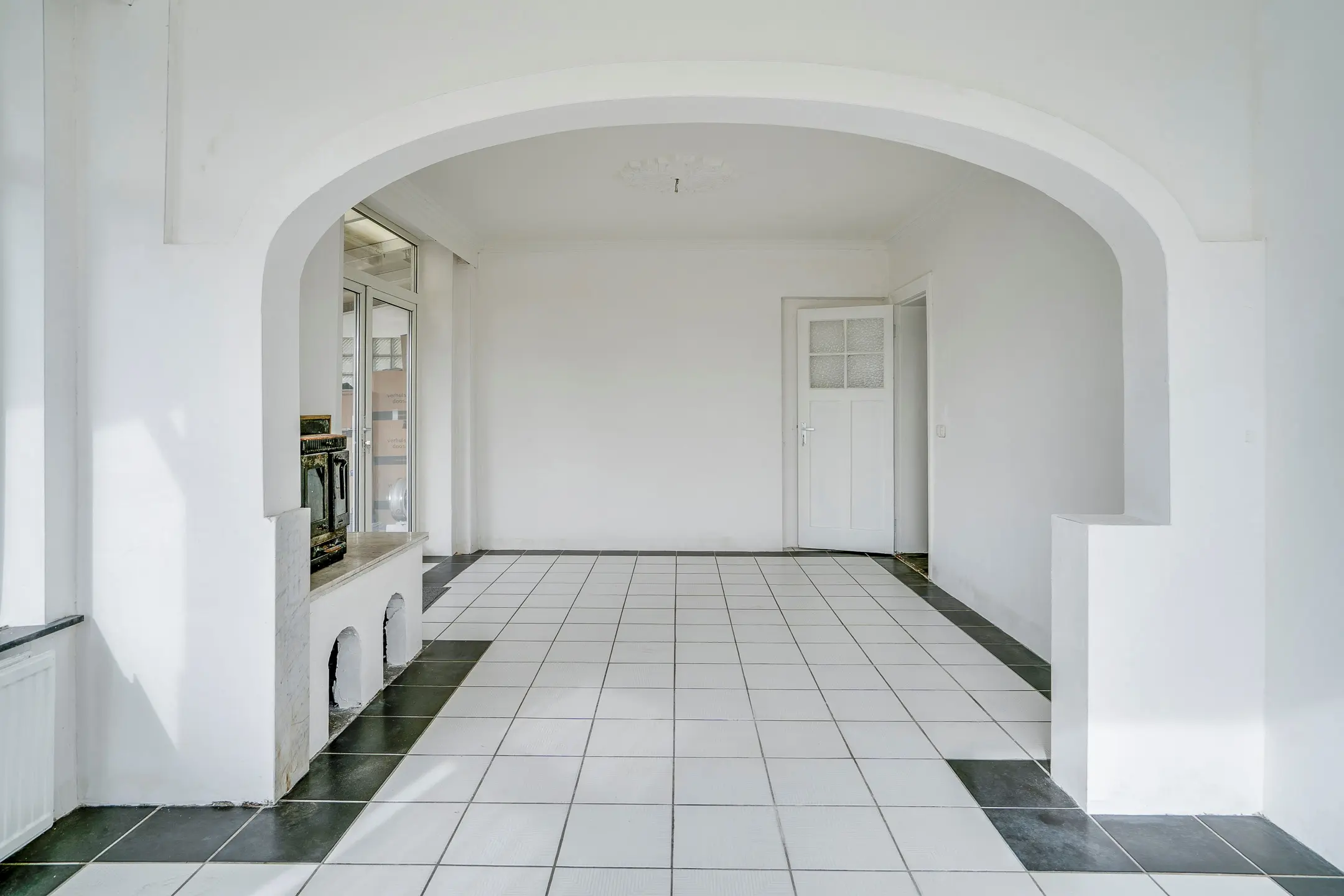 De hoofdwoning is bereikbaar via de centrale hal of via de serre aan de achterzijde en voelt direct als het hart van het huis.