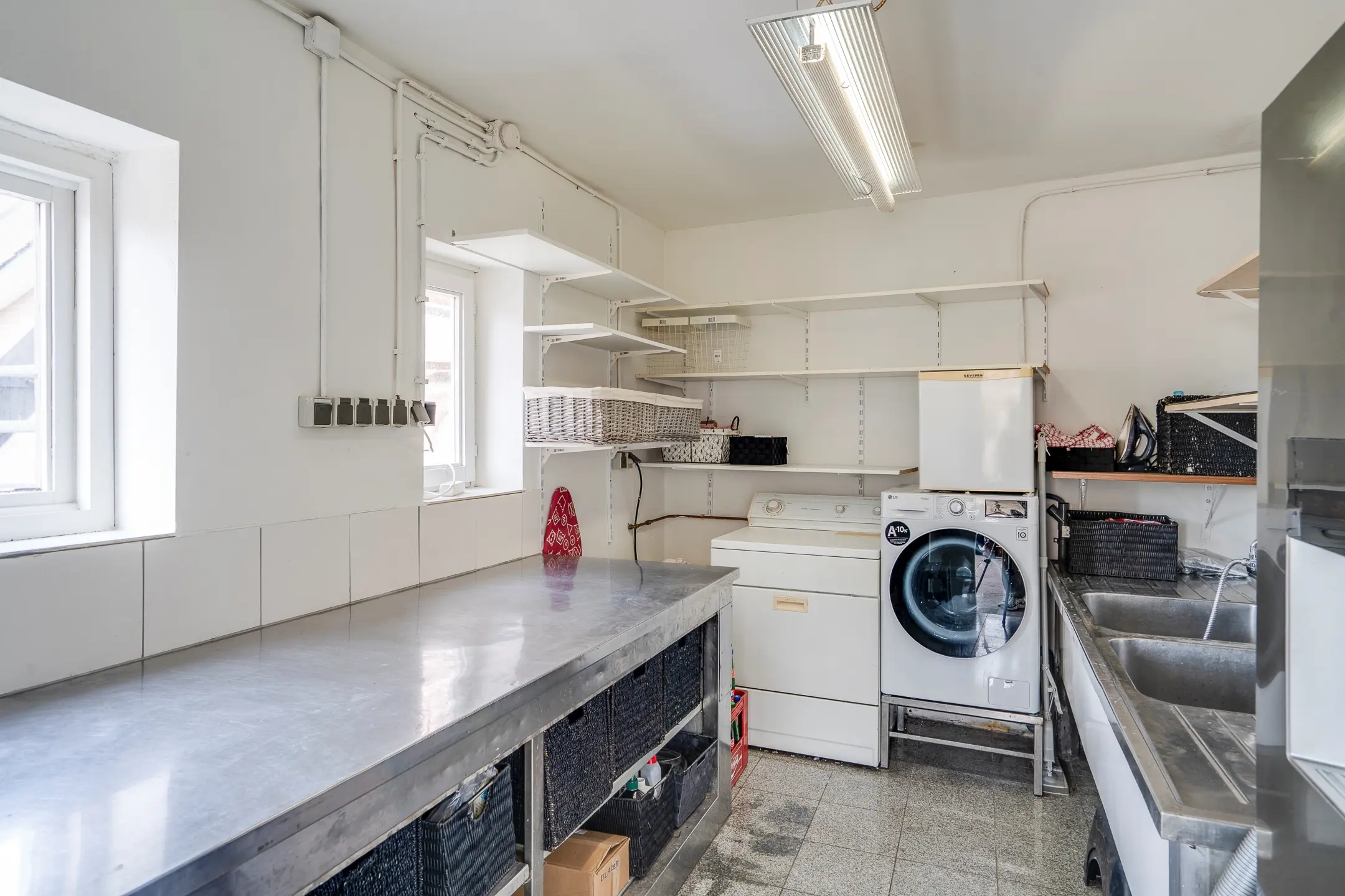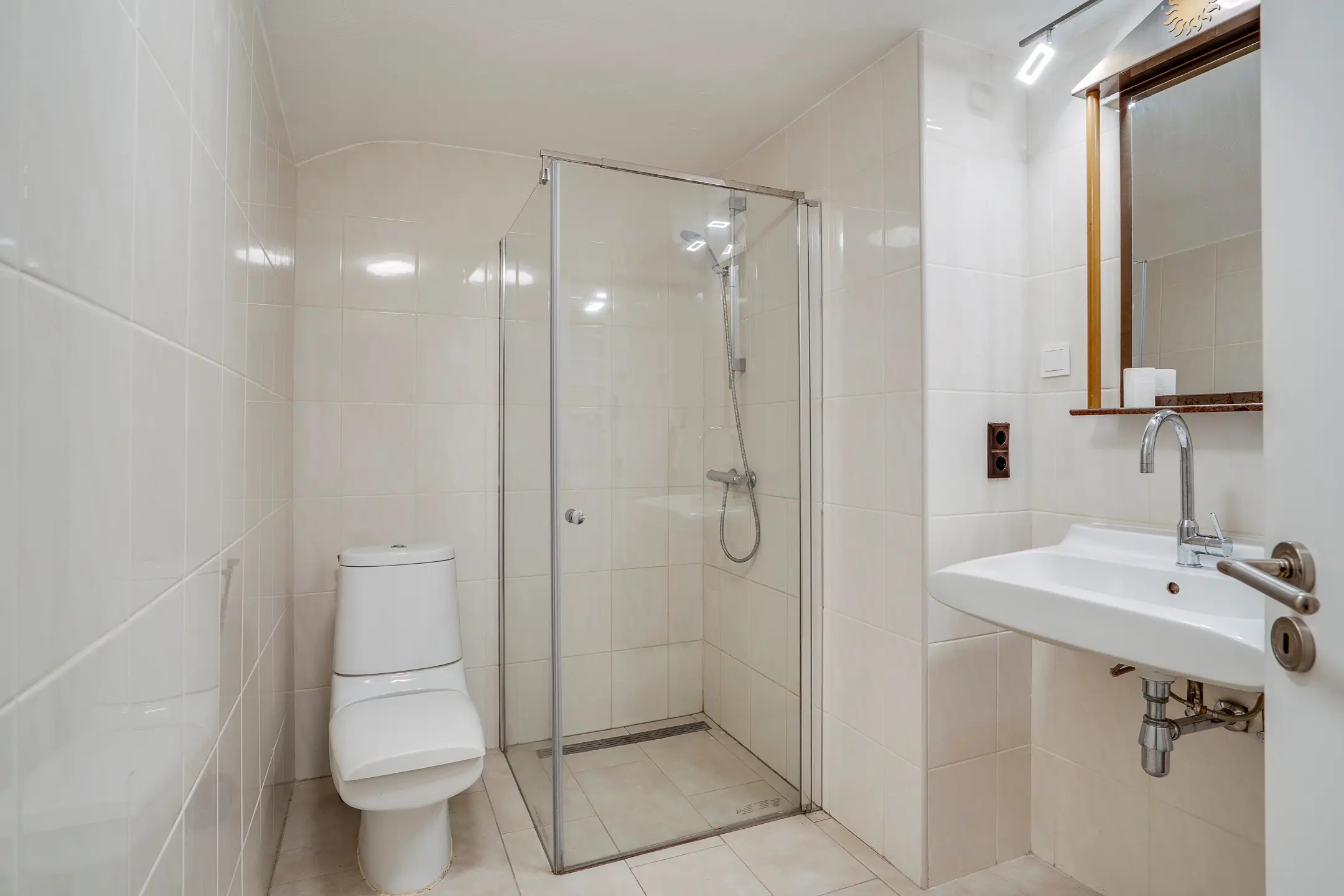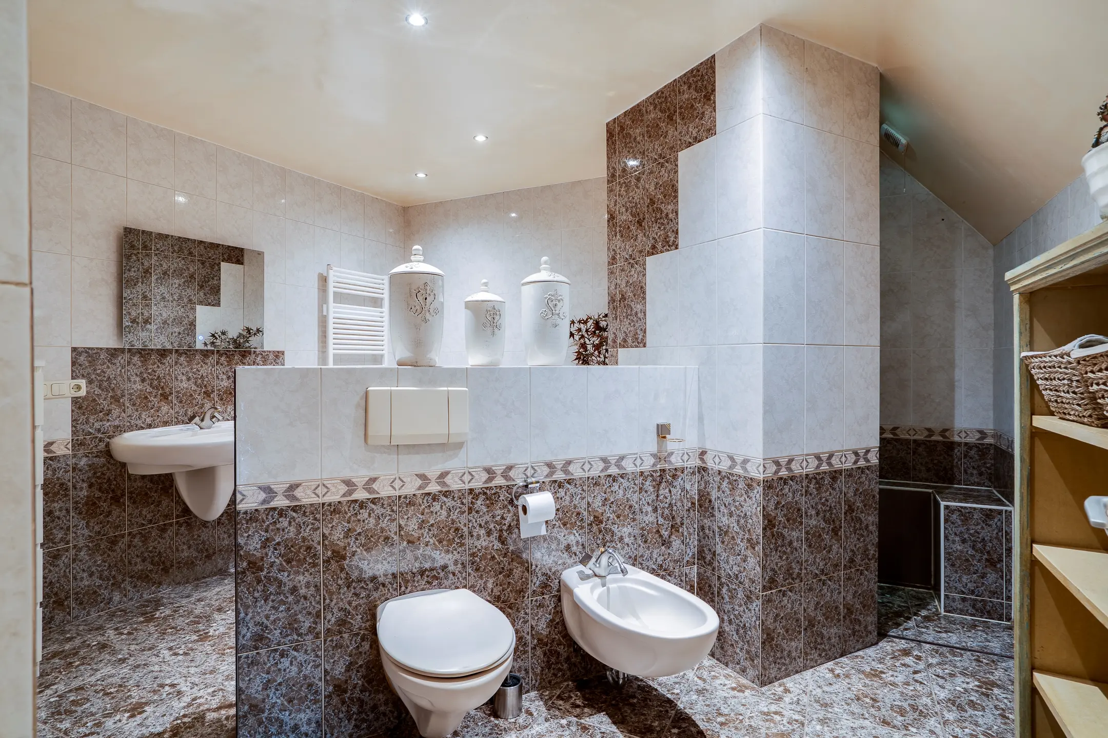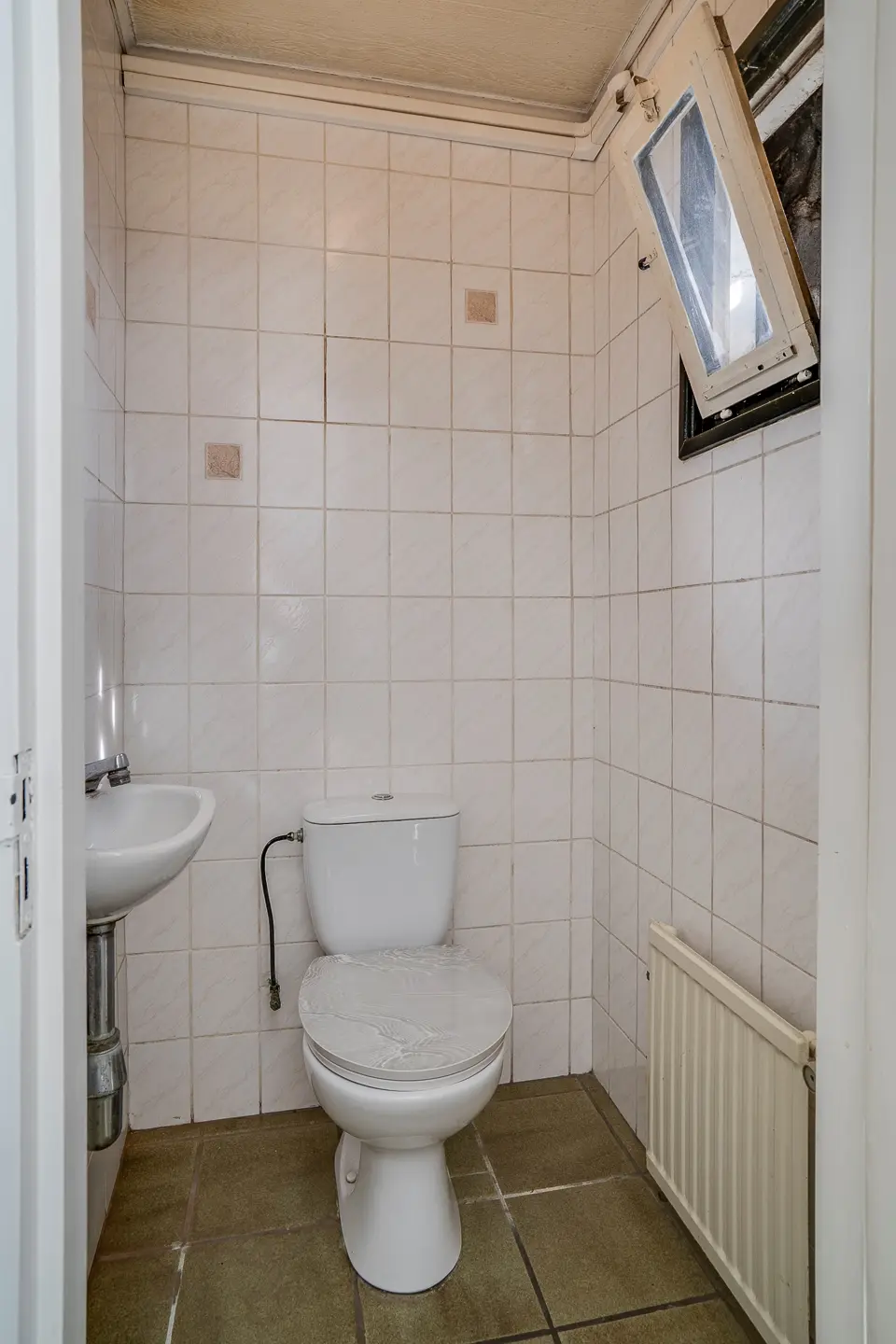 Ook het gastentoilet bevindt zich hier — netjes afgewerkt, volledig betegeld en voorzien van een fonteintje en verwarming.