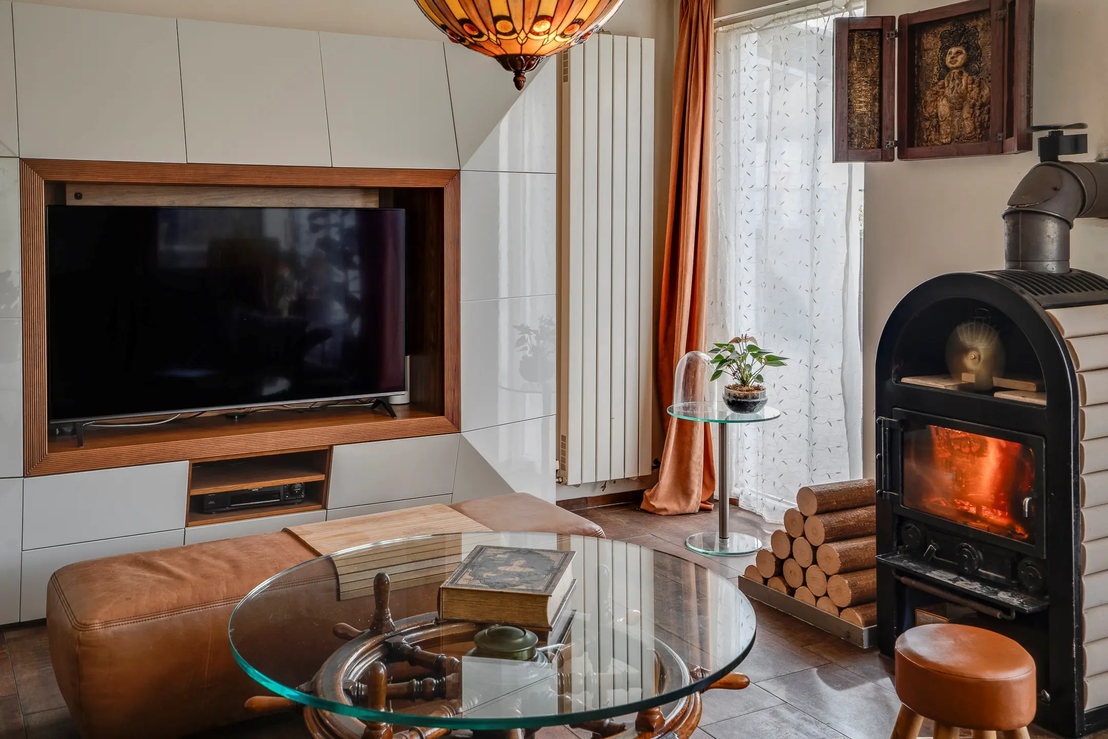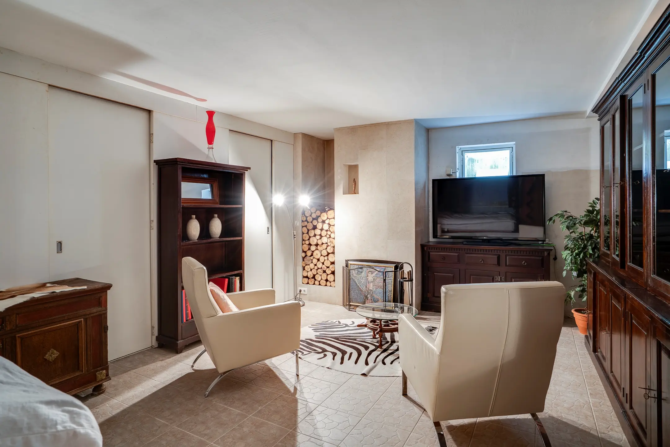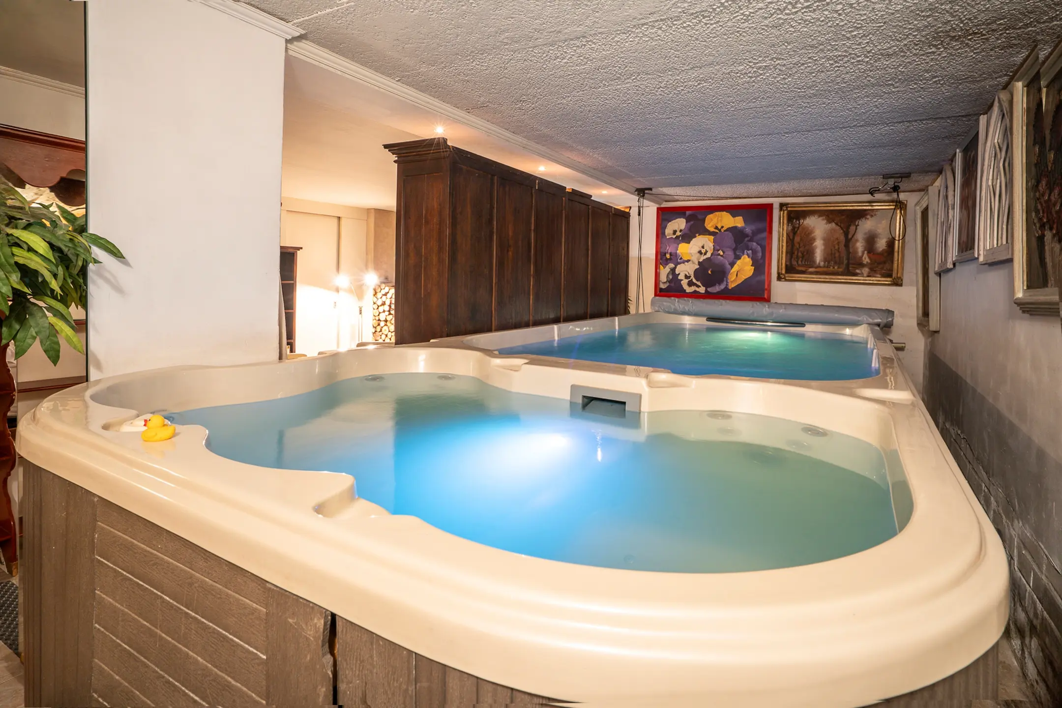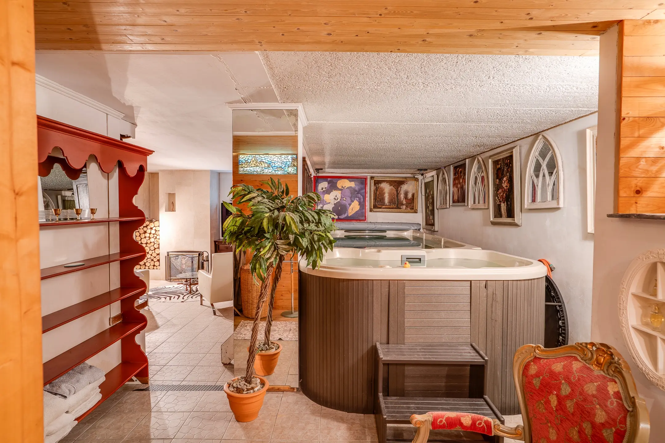 Hier bevindt zich de wellnessruimte: een warme, ontspannen omgeving met sauna, jacuzzi, douche en toilet. De open haard zorgt voor sfeer, terwijl de royale opzet ruimte biedt om echt tot rust te komen. Dit is geen standaard kelder, maar een volwaardige leefruimte gericht op comfort en ontspanning.