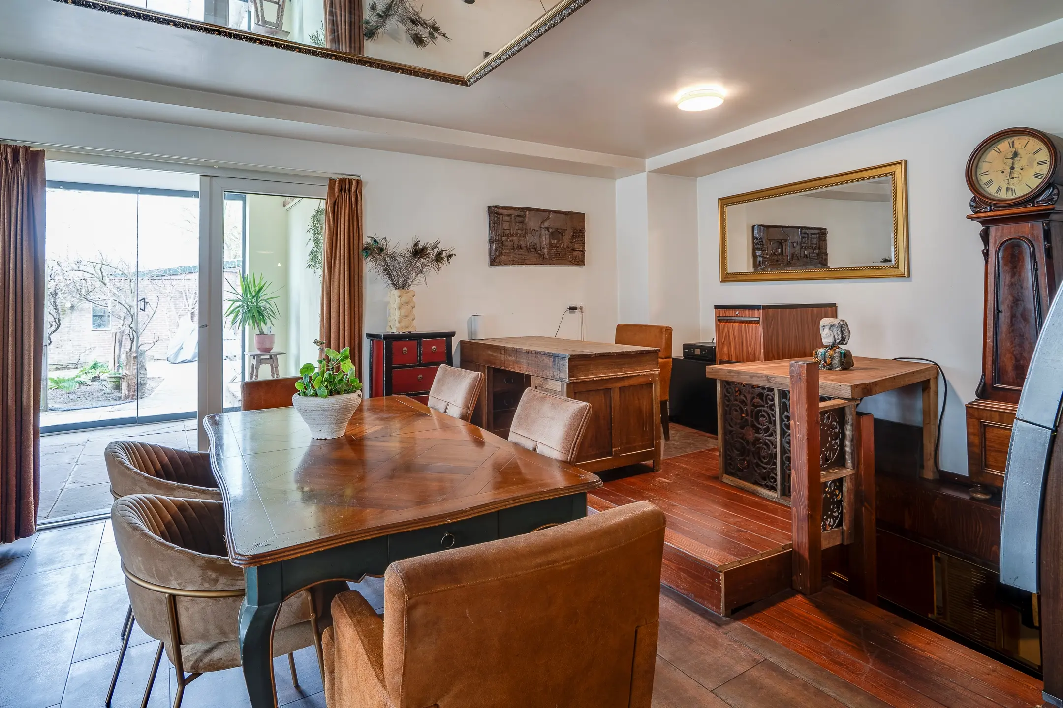 Op de begane grond bevindt zich een woonkamer van circa 25 m² met openslaande deuren naar de zijtuin — een fijne, lichte ruimte. Daarnaast is er een multifunctionele kamer die zich leent als kantoor, inloopkast of hobbyruimte.