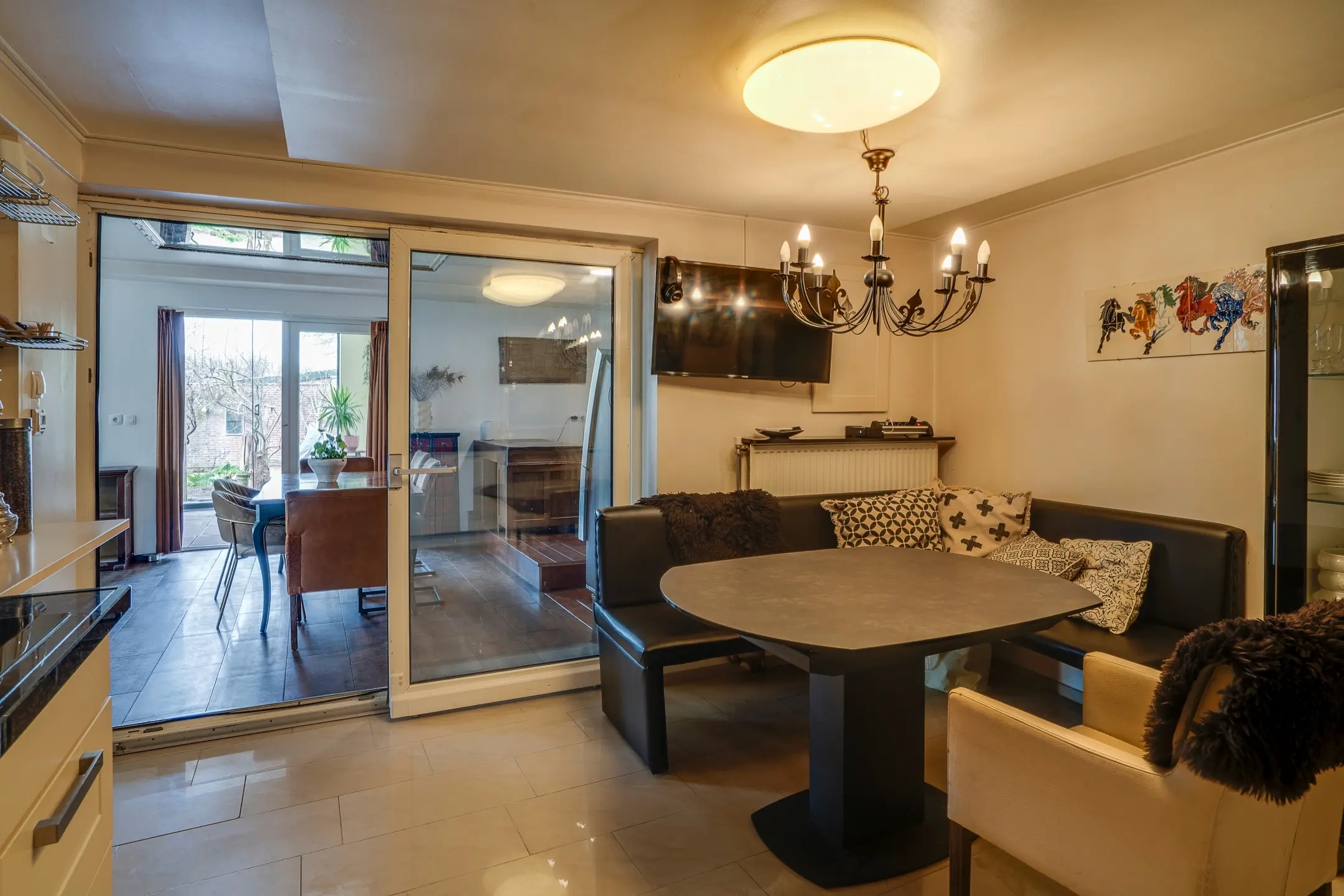 De serre vormt een heerlijke overgang naar buiten. Dankzij de glazen constructie stroomt het daglicht rijkelijk naar binnen en ontstaat een plek waar binnen en buiten in elkaar overlopen. Aangrenzend ligt de bijkeuken / wasruimte, praktisch en goed bereikbaar.
