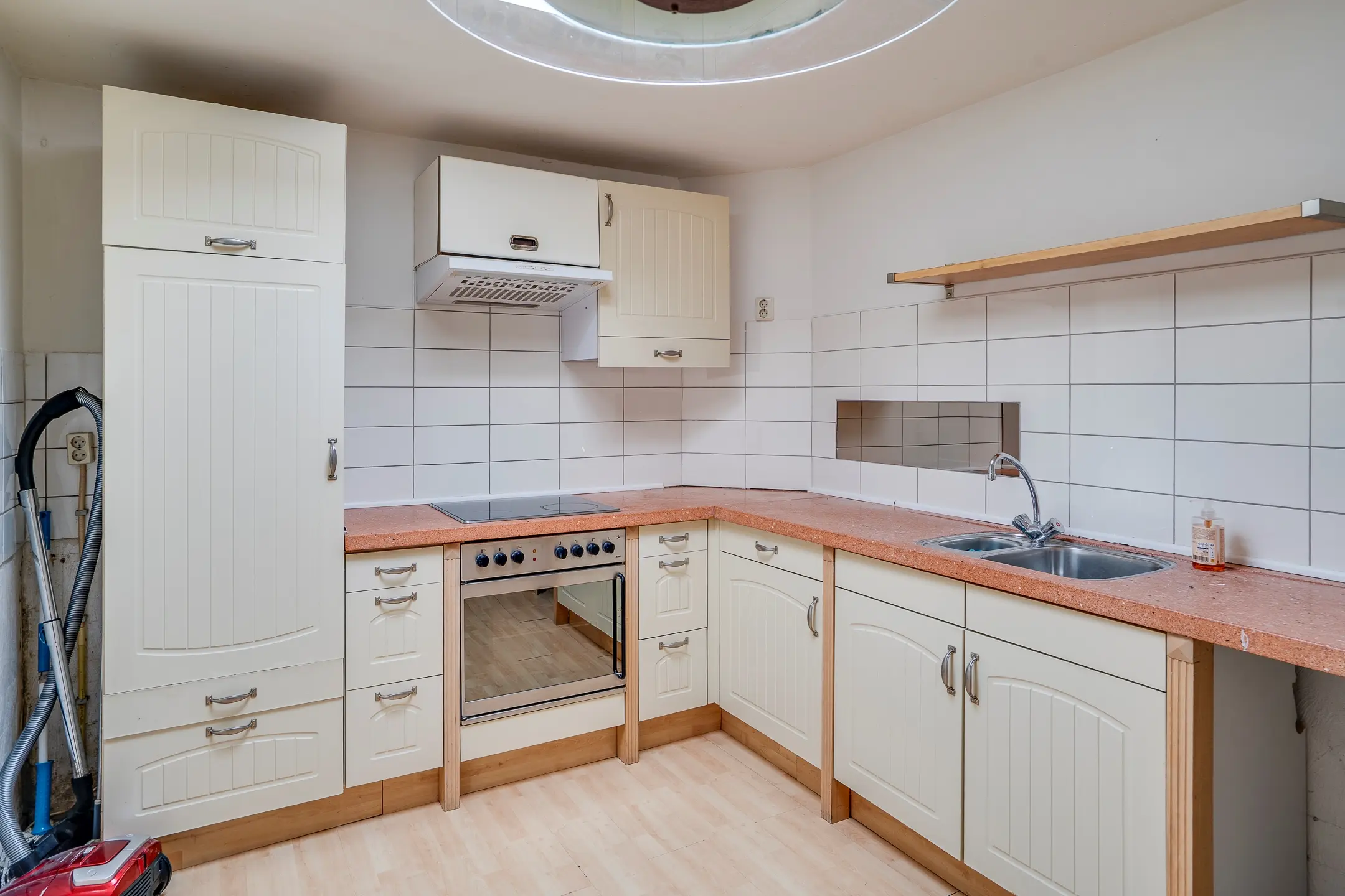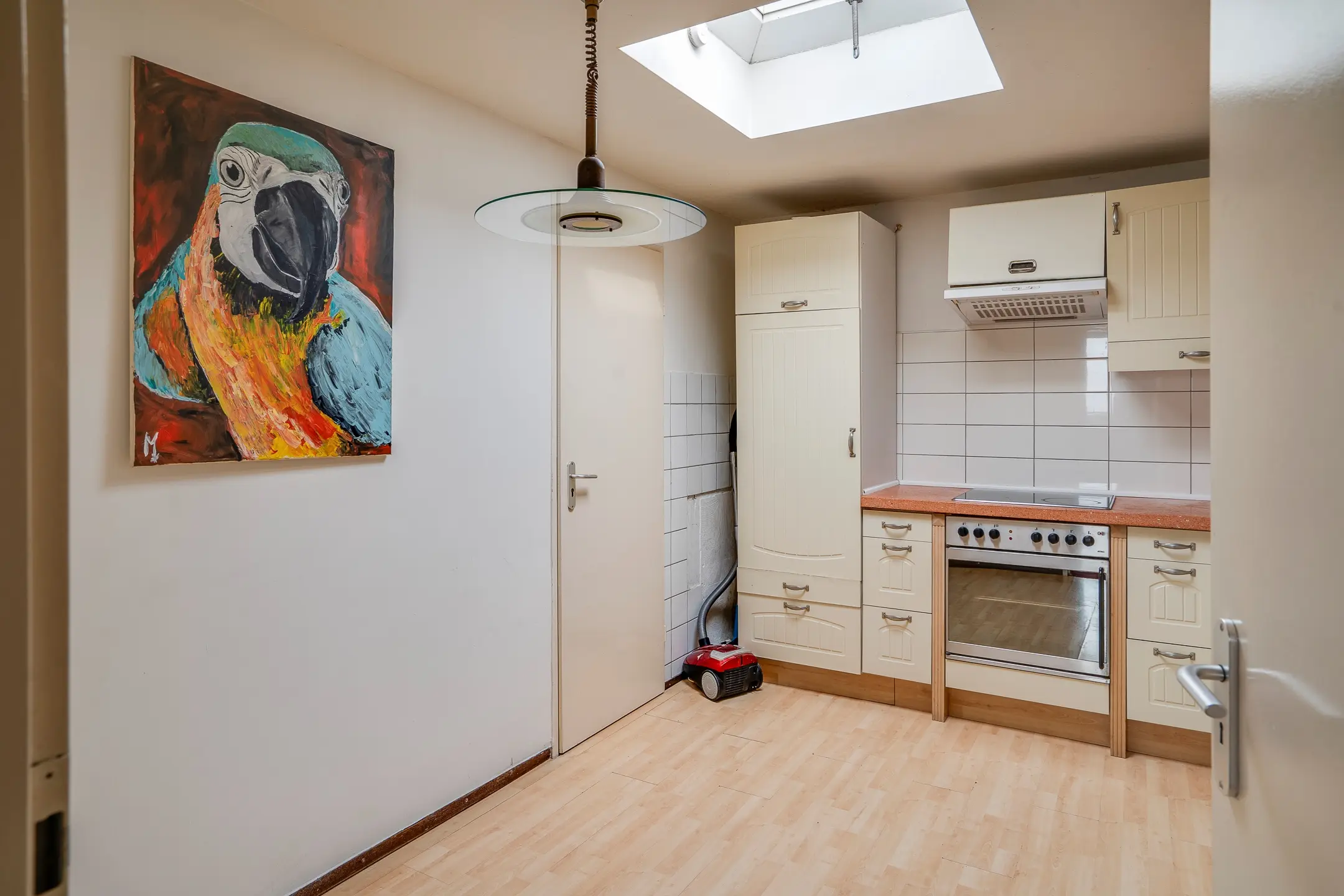 De woonkamer, met een royale oppervlakte van circa 44 m², nodigt uit tot samenzijn. De houthaard zorgt voor warmte en sfeer, terwijl de open verbinding met de halfopen keuken het geheel luchtig en ruimtelijk maakt. De keuken zelf is eveneens royaal opgezet (ca. 15 m²) en van alle gemakken voorzien.