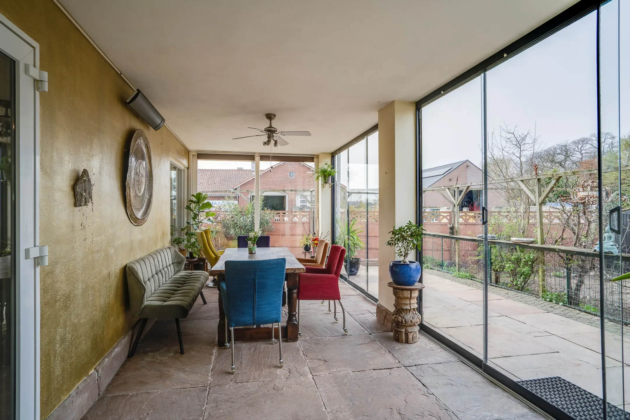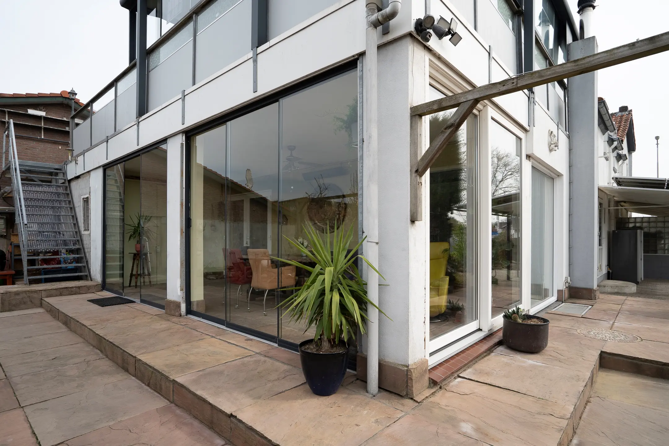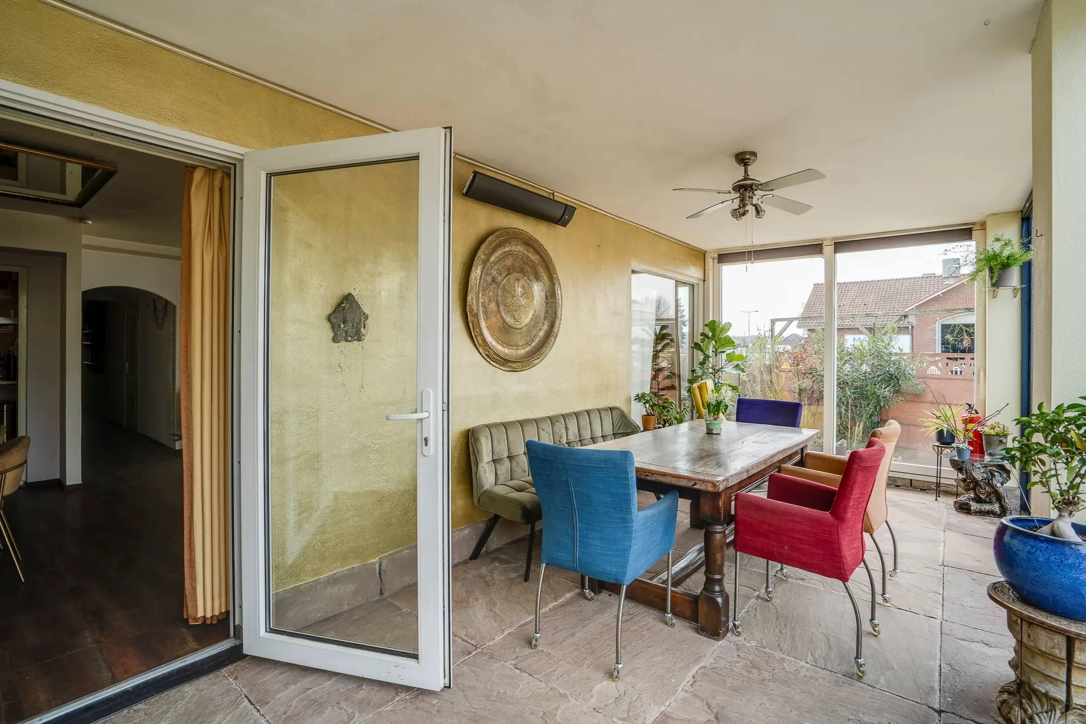 Wat direct opvalt is de serre / galerie die langs de volledige buitenzijde loopt. Dankzij de grote raampartijen, die grotendeels geopend kunnen worden, ontstaat een lichte en open sfeer.