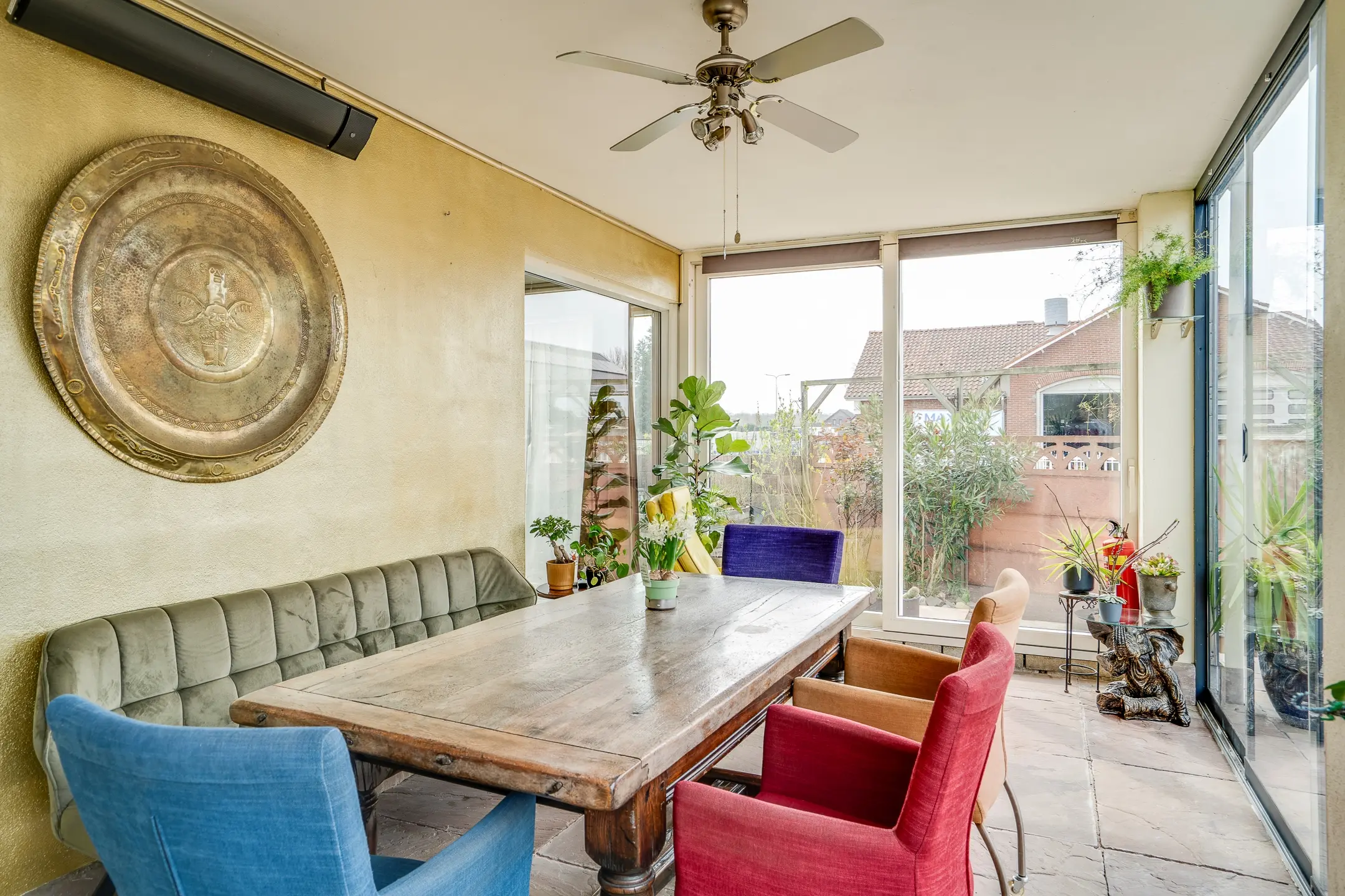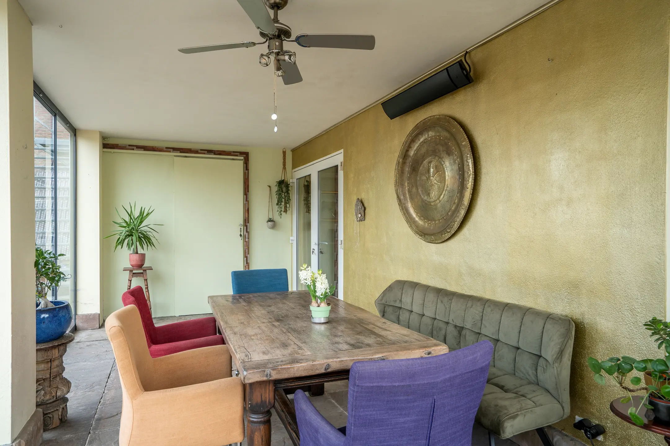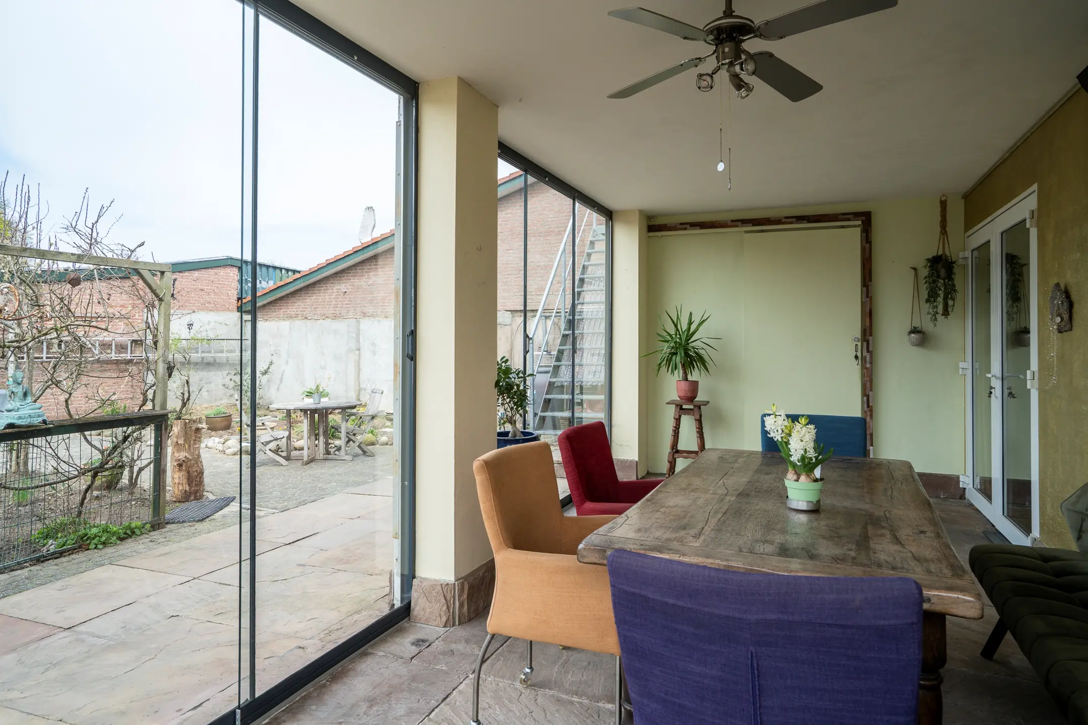 Wat direct opvalt is de serre / galerie die langs de volledige buitenzijde loopt. Dankzij de grote raampartijen, die grotendeels geopend kunnen worden, ontstaat een lichte en open sfeer.