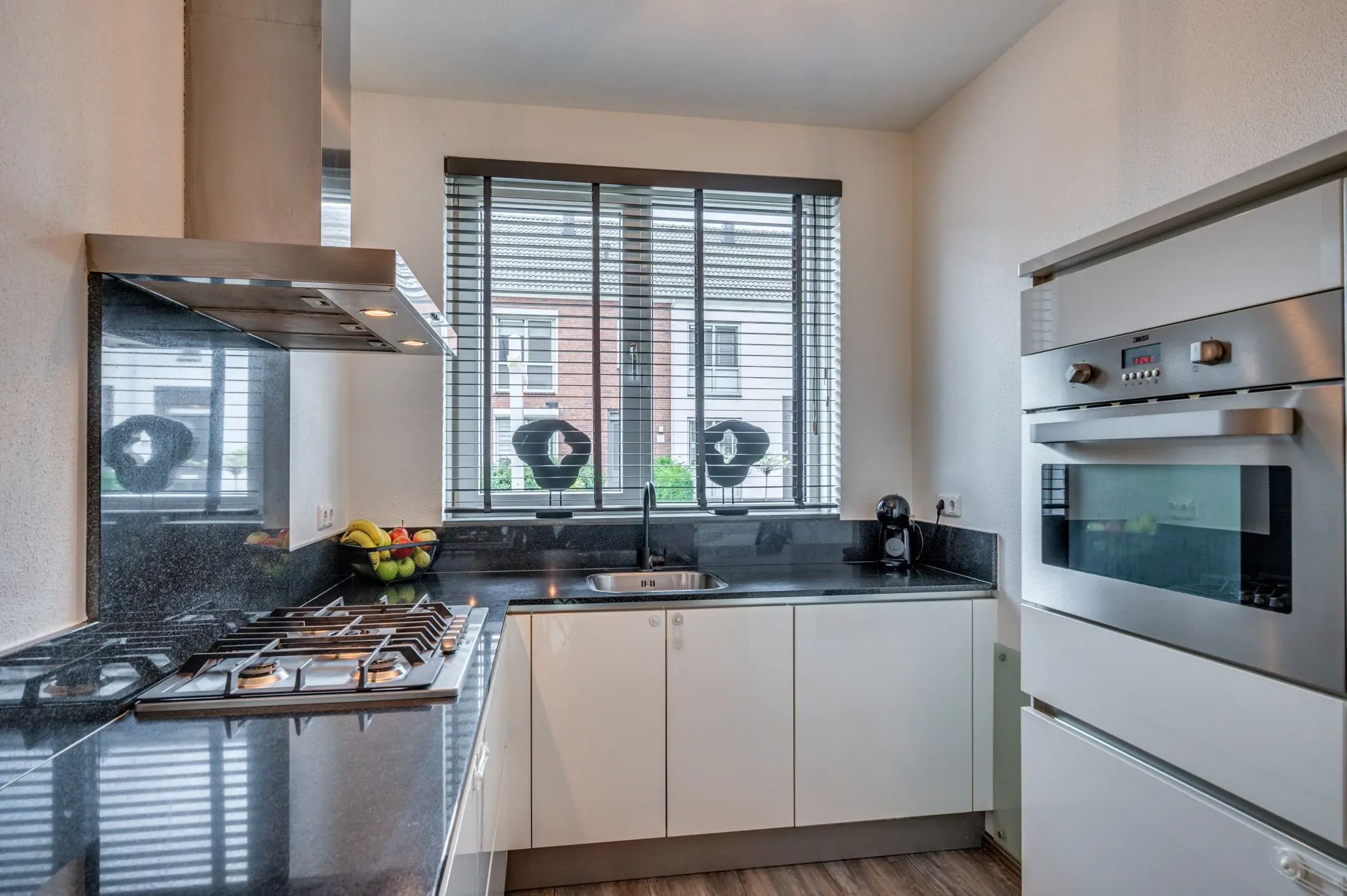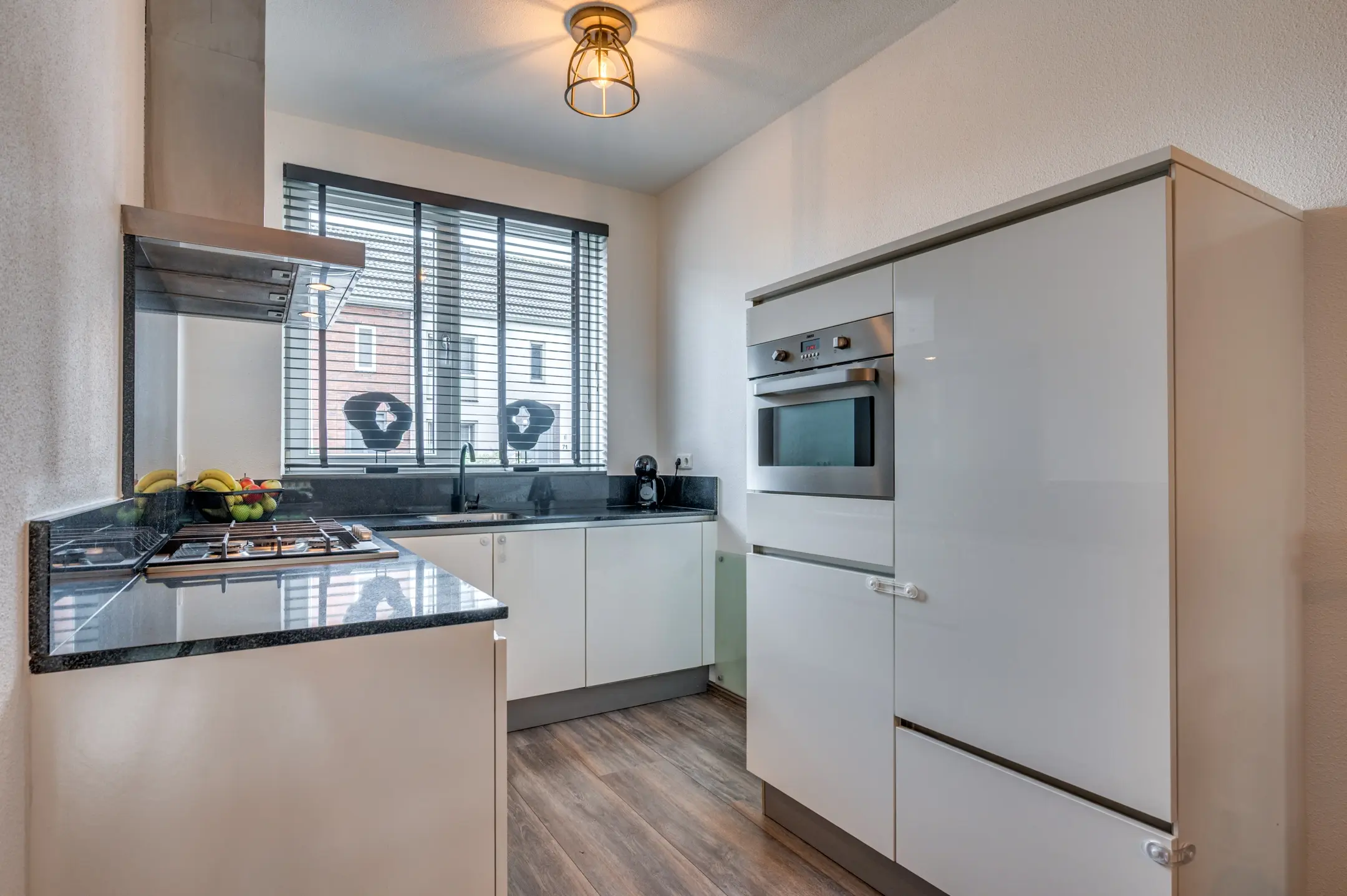 Aan de voorzijde ligt de moderne open keuken, uitgerust met witte fronten, een stijlvol antraciet granieten