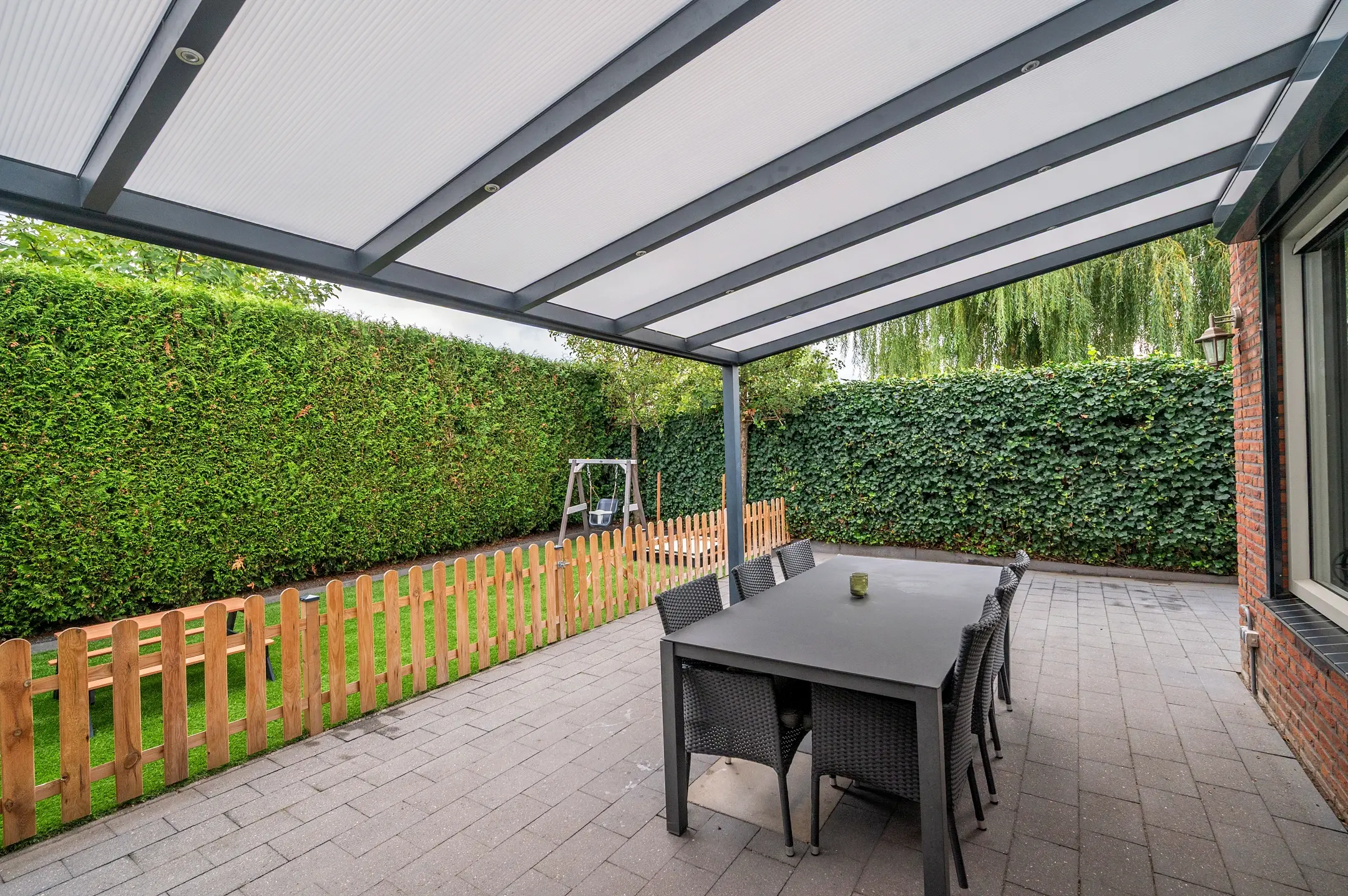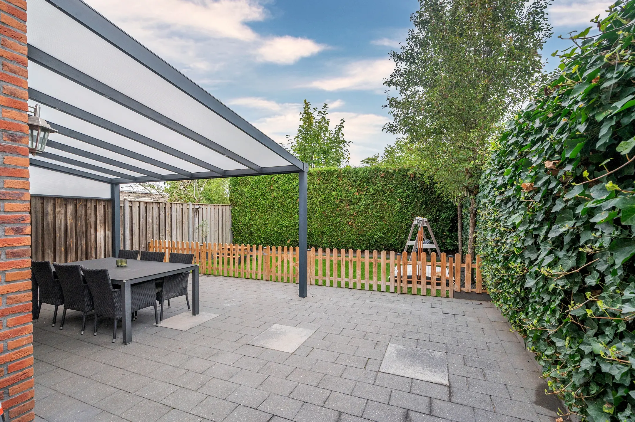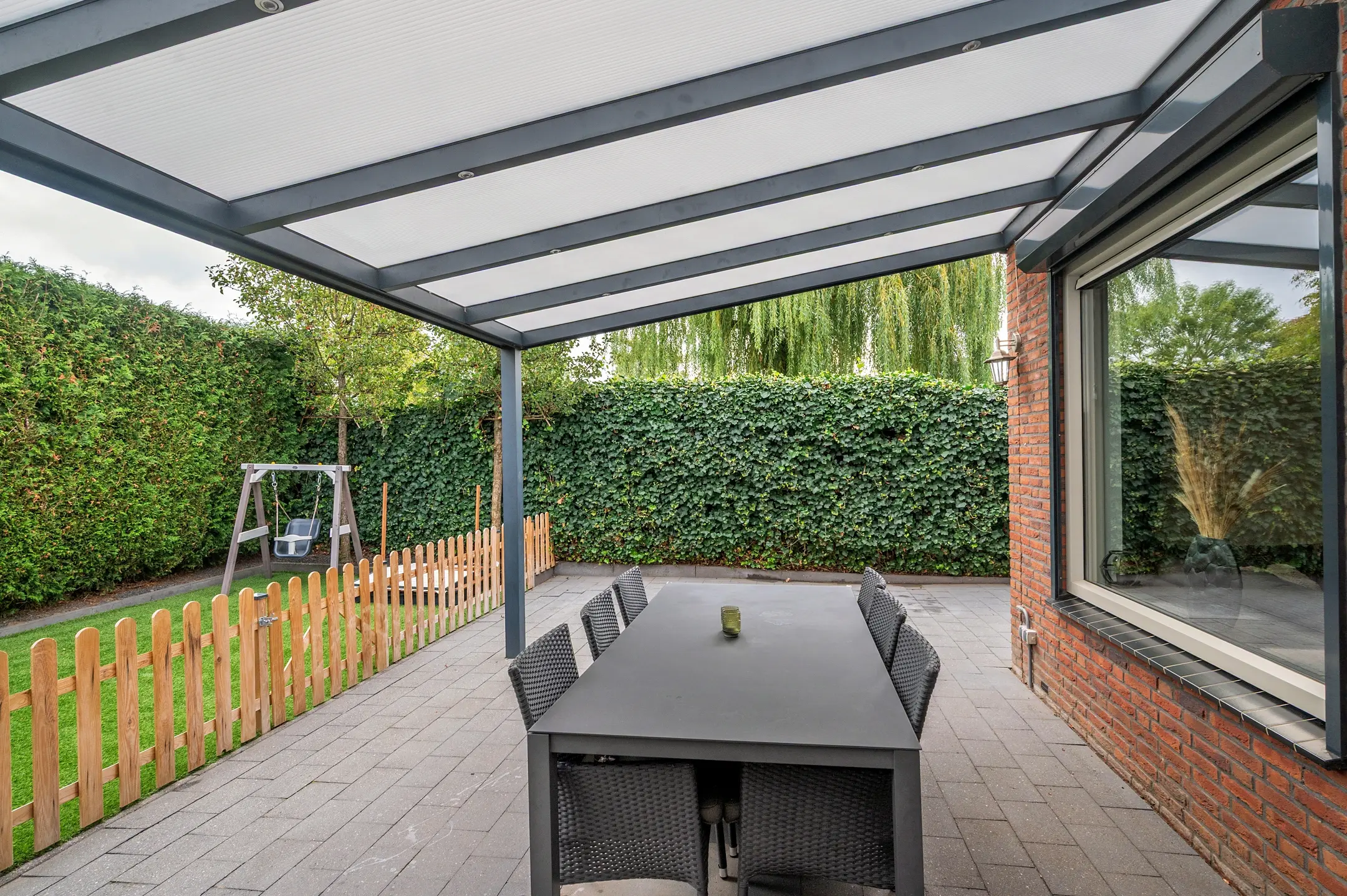 De achtertuin ligt op het noordoosten en biedt volop privacy. Onder de gecoate aluminium overkapping met geïntegreerde verlichting geniet je het hele jaar door van het buitenleven – van lange zomeravonden tot knusse herfstmiddagen.