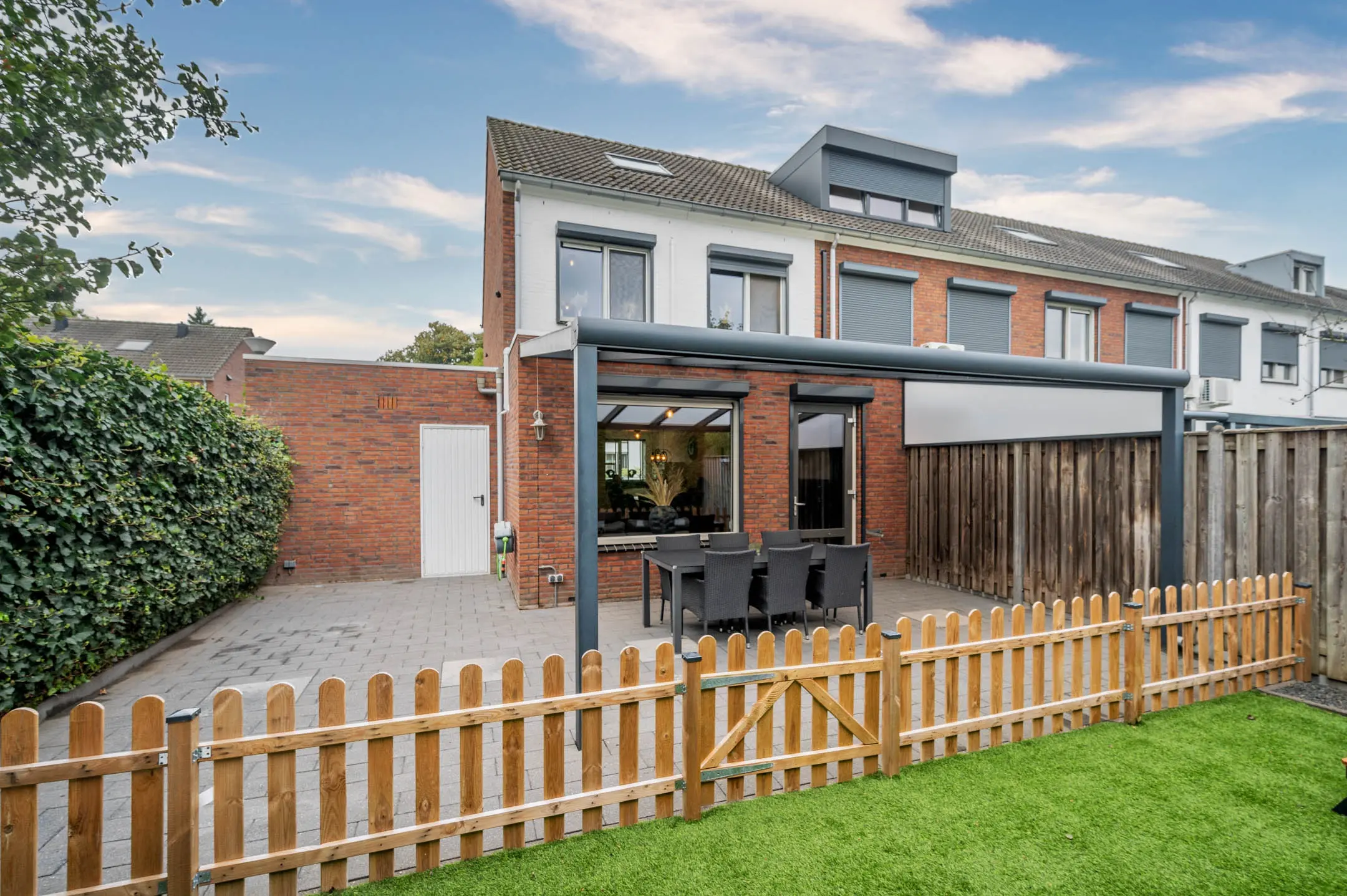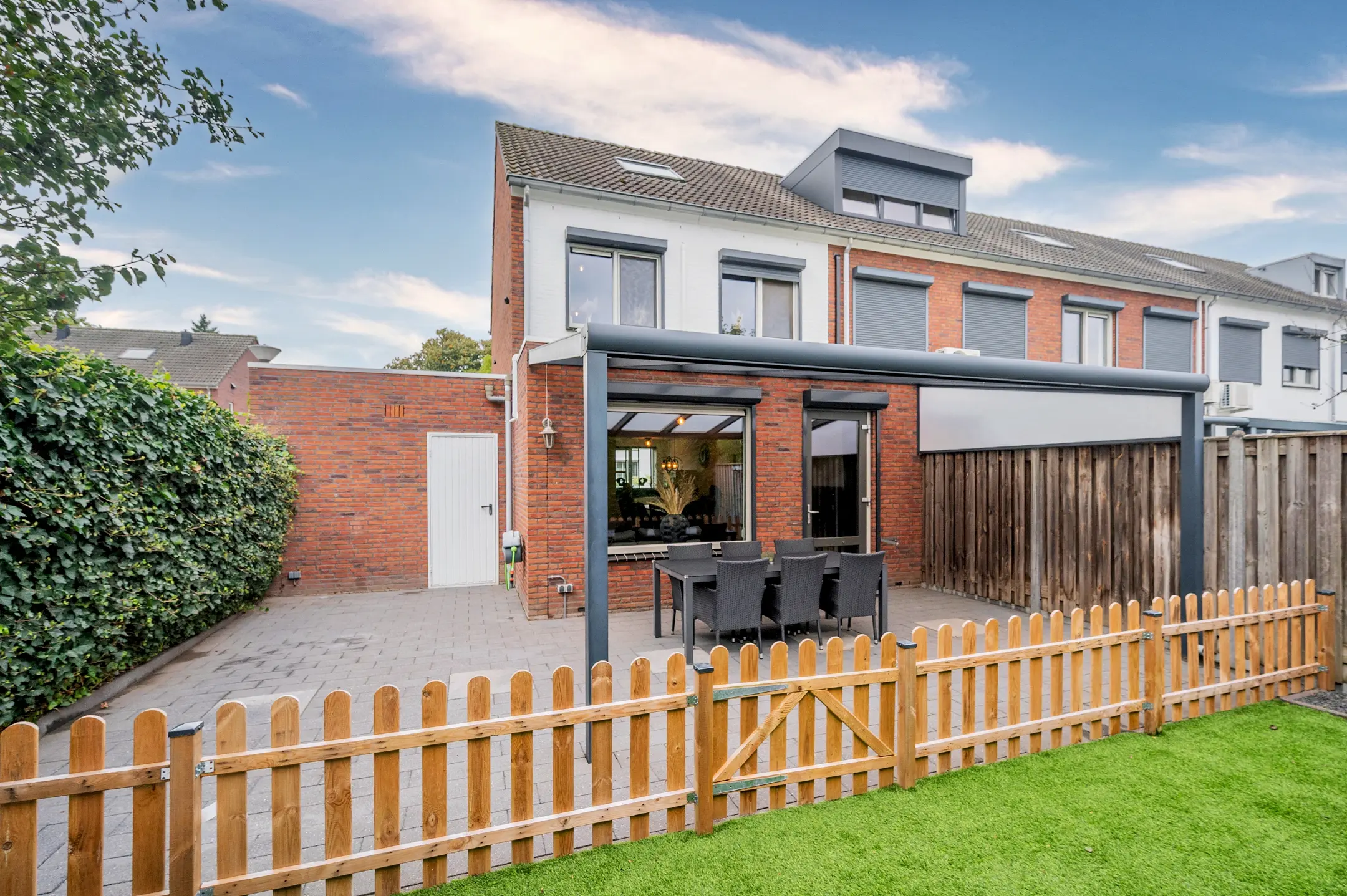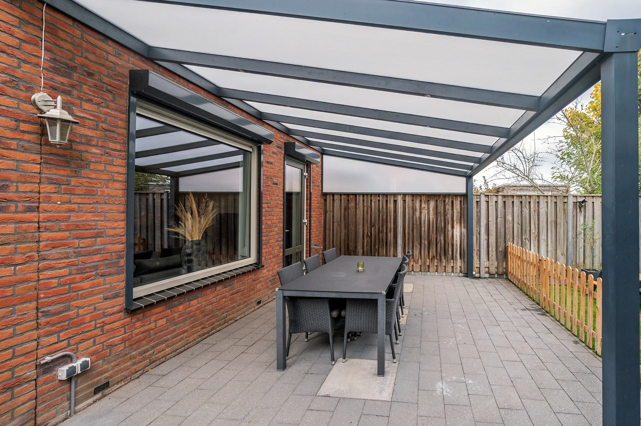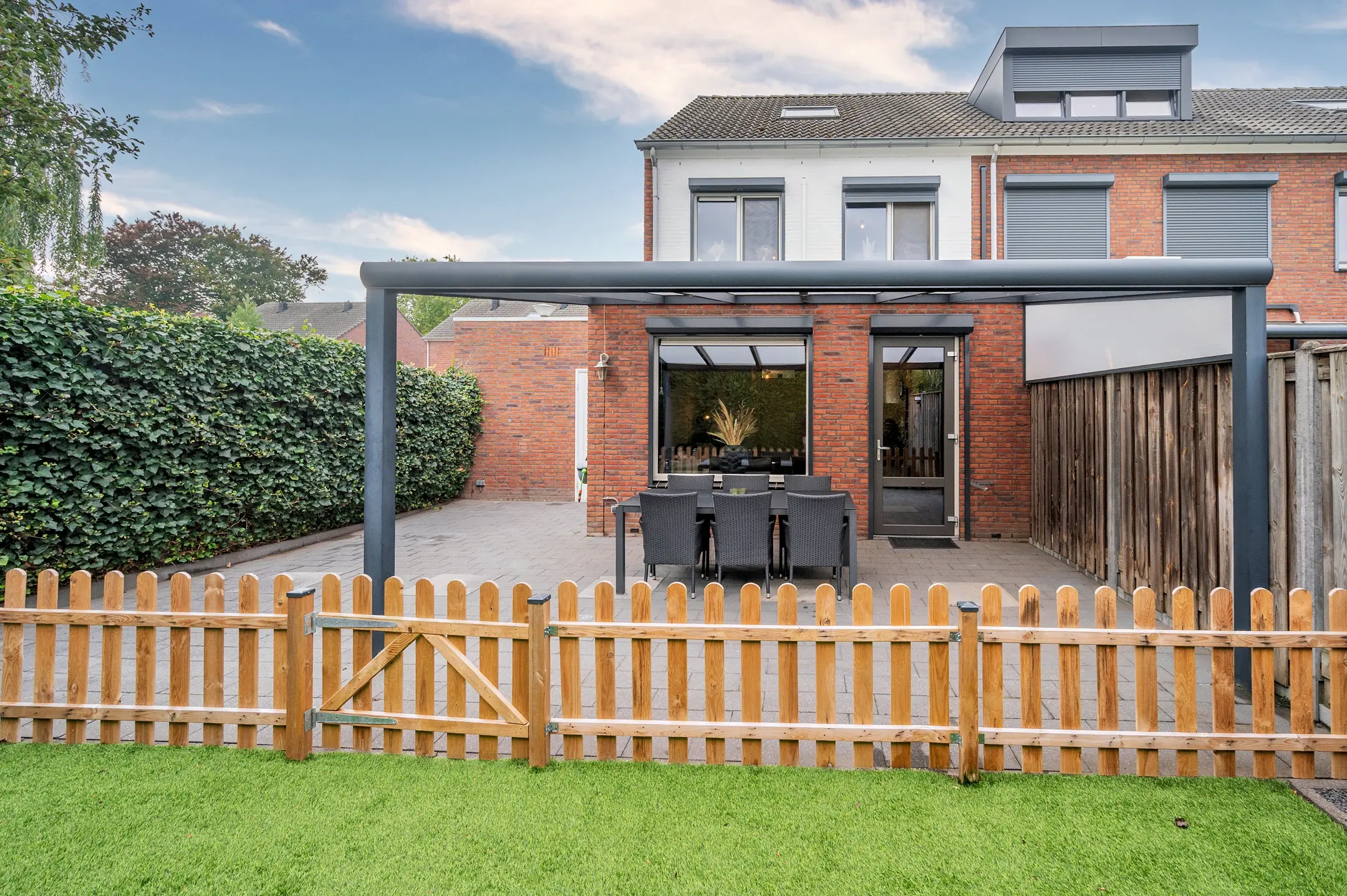 De achtertuin ligt op het noordoosten en biedt volop privacy. Onder de gecoate aluminium overkapping met geïntegreerde verlichting geniet je het hele jaar door van het buitenleven – van lange zomeravonden tot knusse herfstmiddagen.