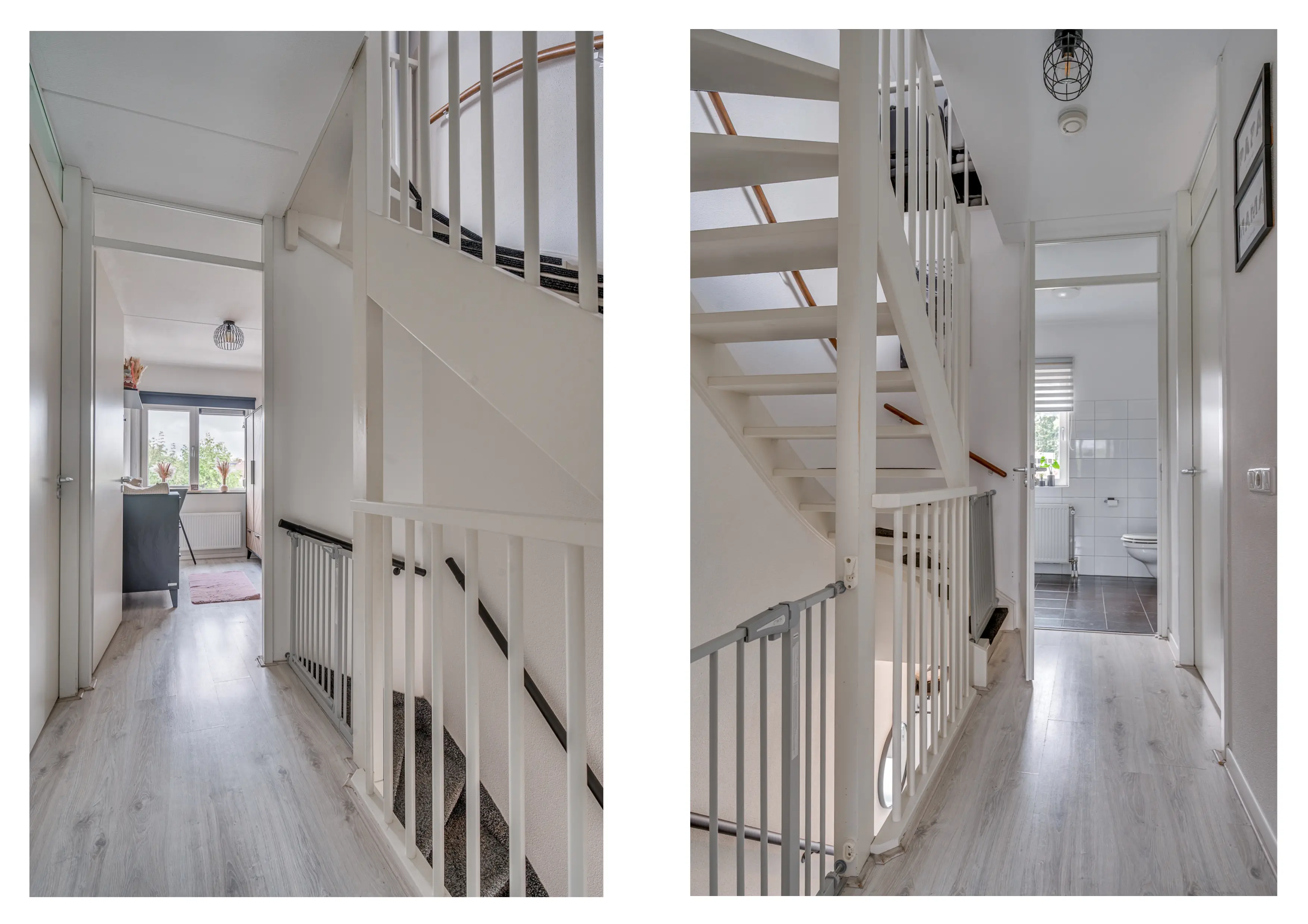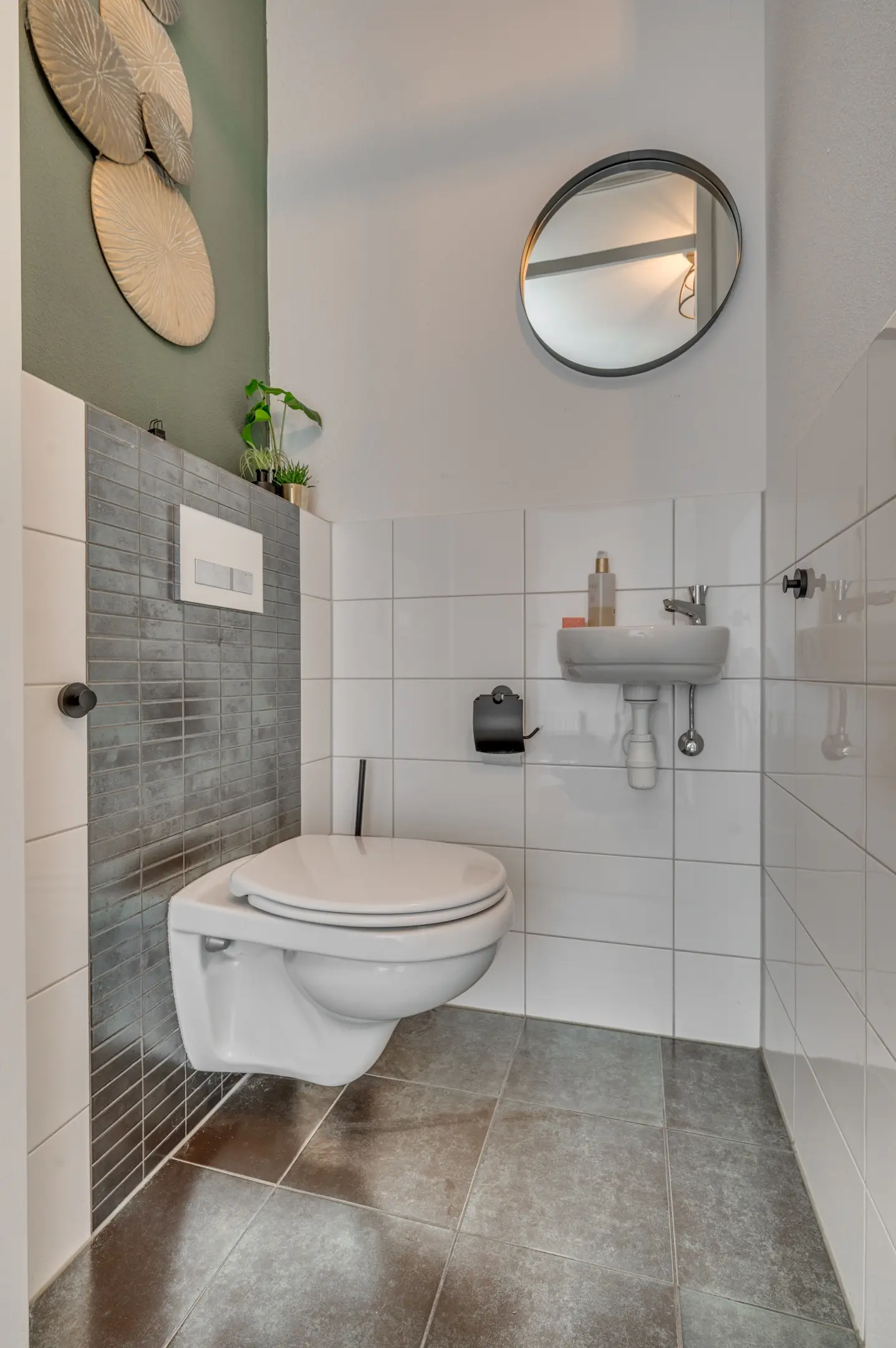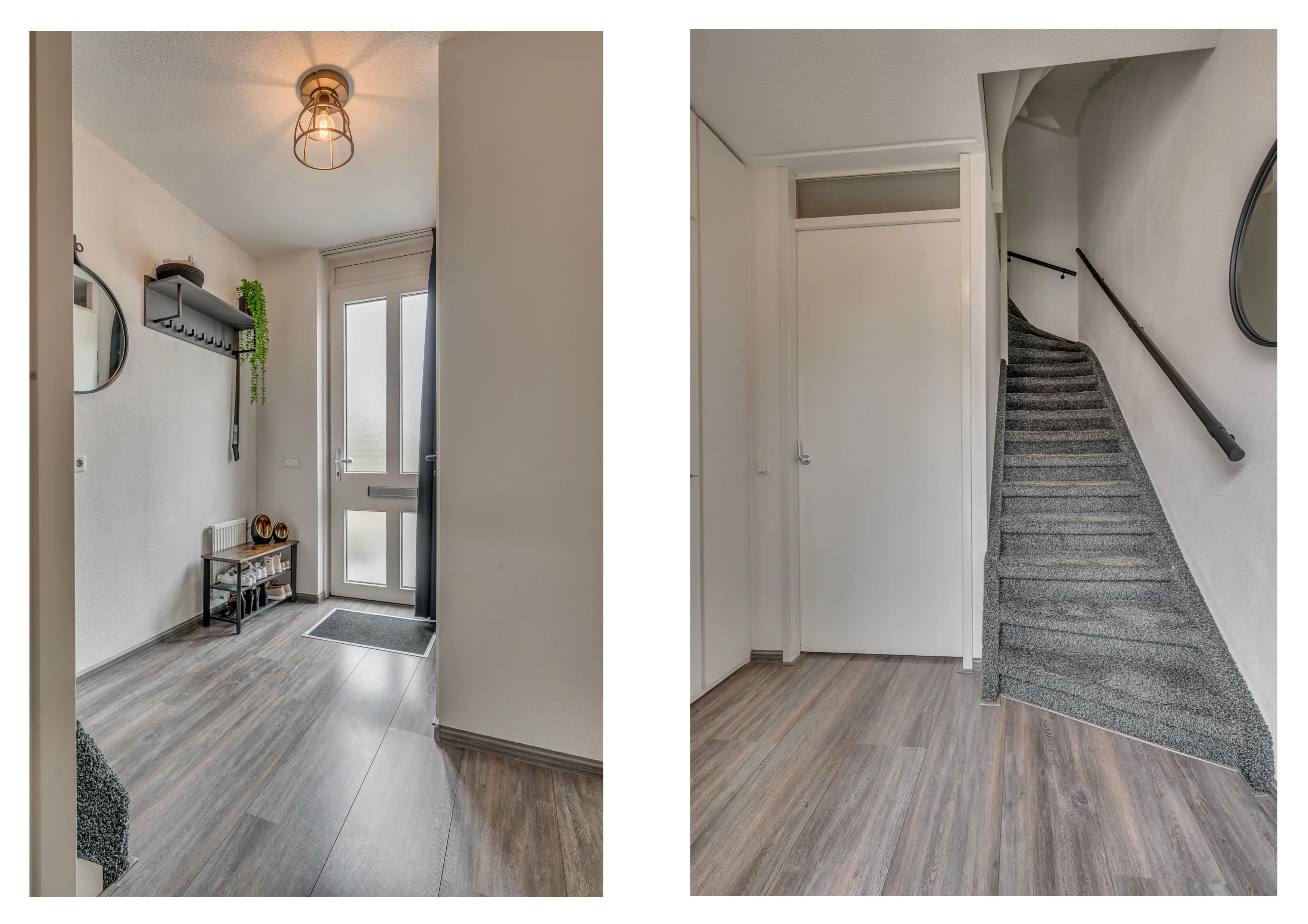 Via de nette entree aan de voorzijde van de woning, waar je een moderne meterkast, de garderobe en een stijlvol toilet met fonteintje en deels betegelde wanden vindt, betreed je de ruime, uitgebouwde woonkamer. De entree is afgewerkt met een prachtige, drempelloos gelegde laminaatvloer die voor een mooie, strakke uitstraling zorgt.