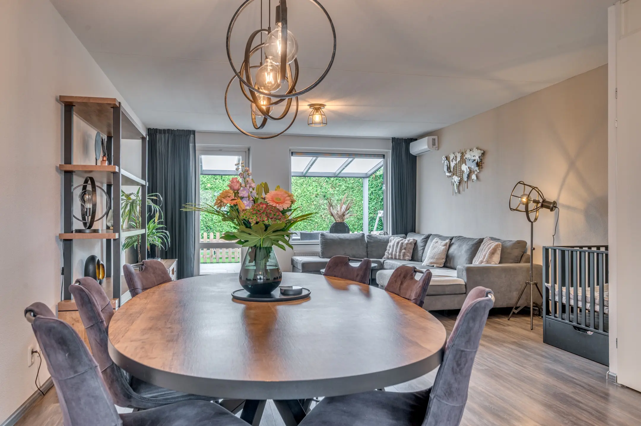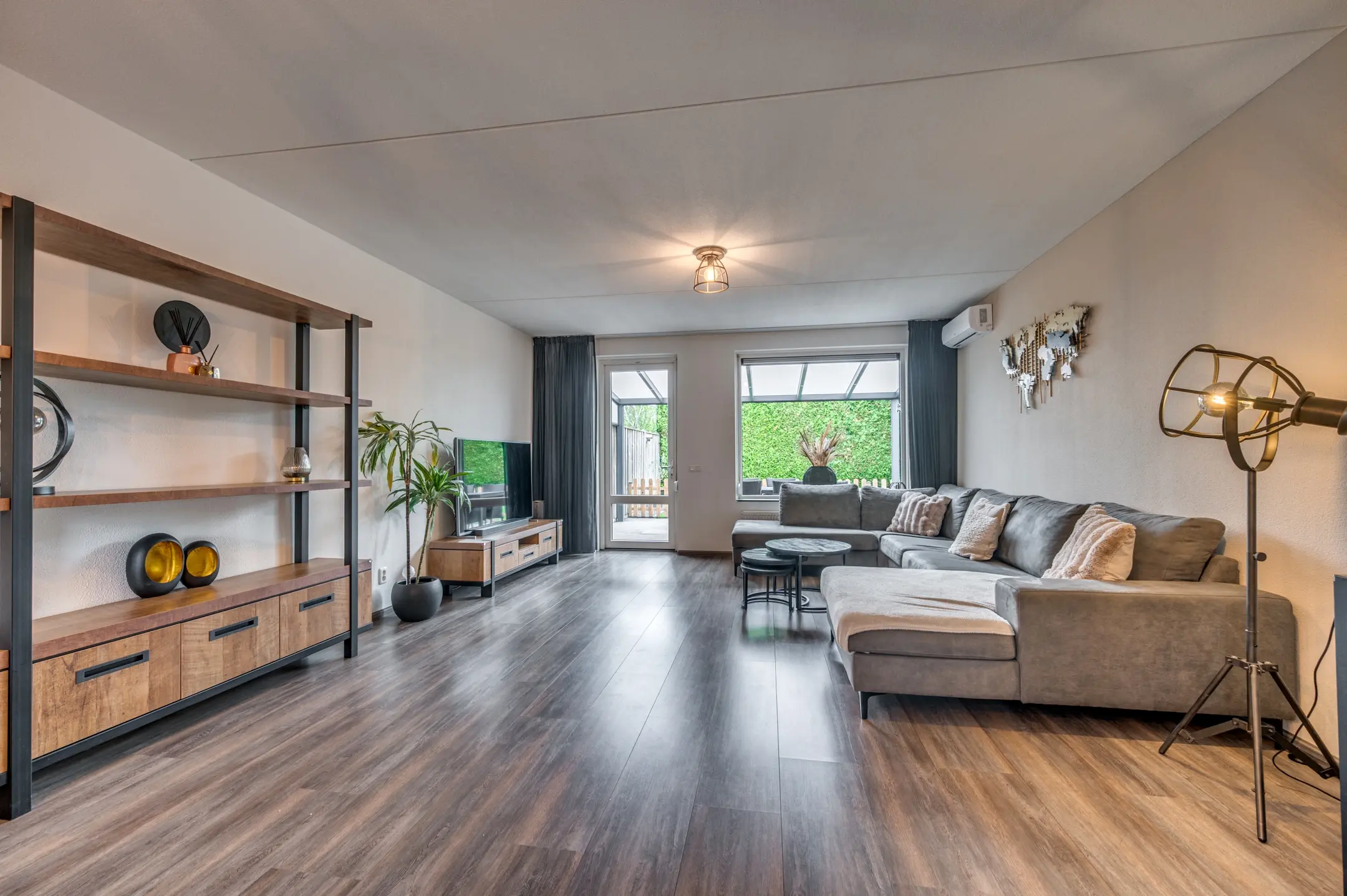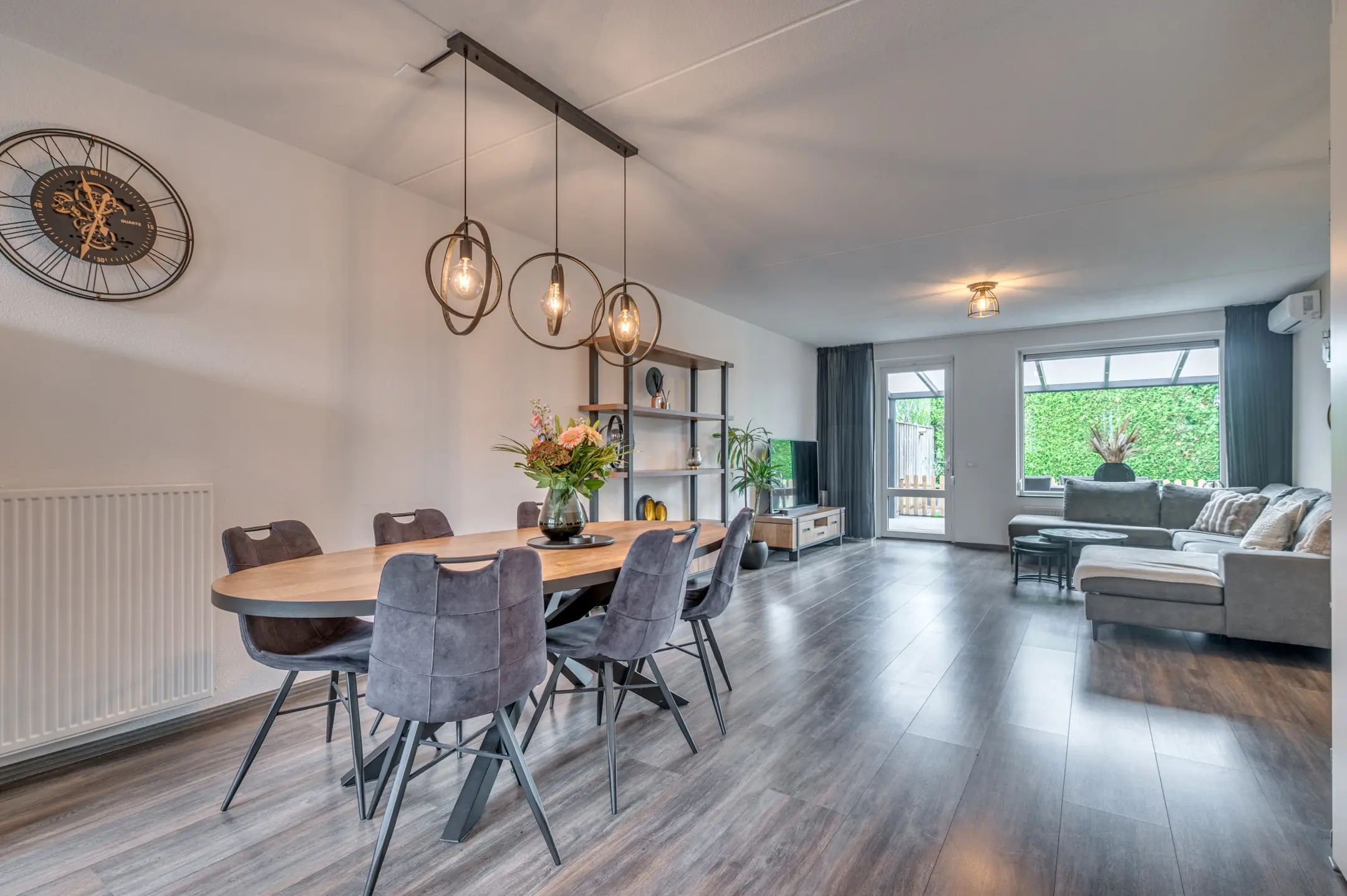 Dankzij de raampartijen aan de voor- en achterzijde en de tuindeur geniet je hier van veel natuurlijk licht en direct contact met de tuin. De strakke laminaatvloer en neutrale afwerking zorgen voor een warme, eigentijdse sfeer.