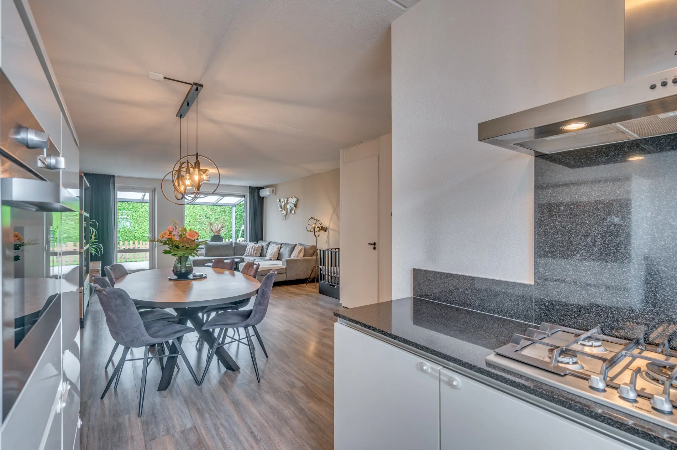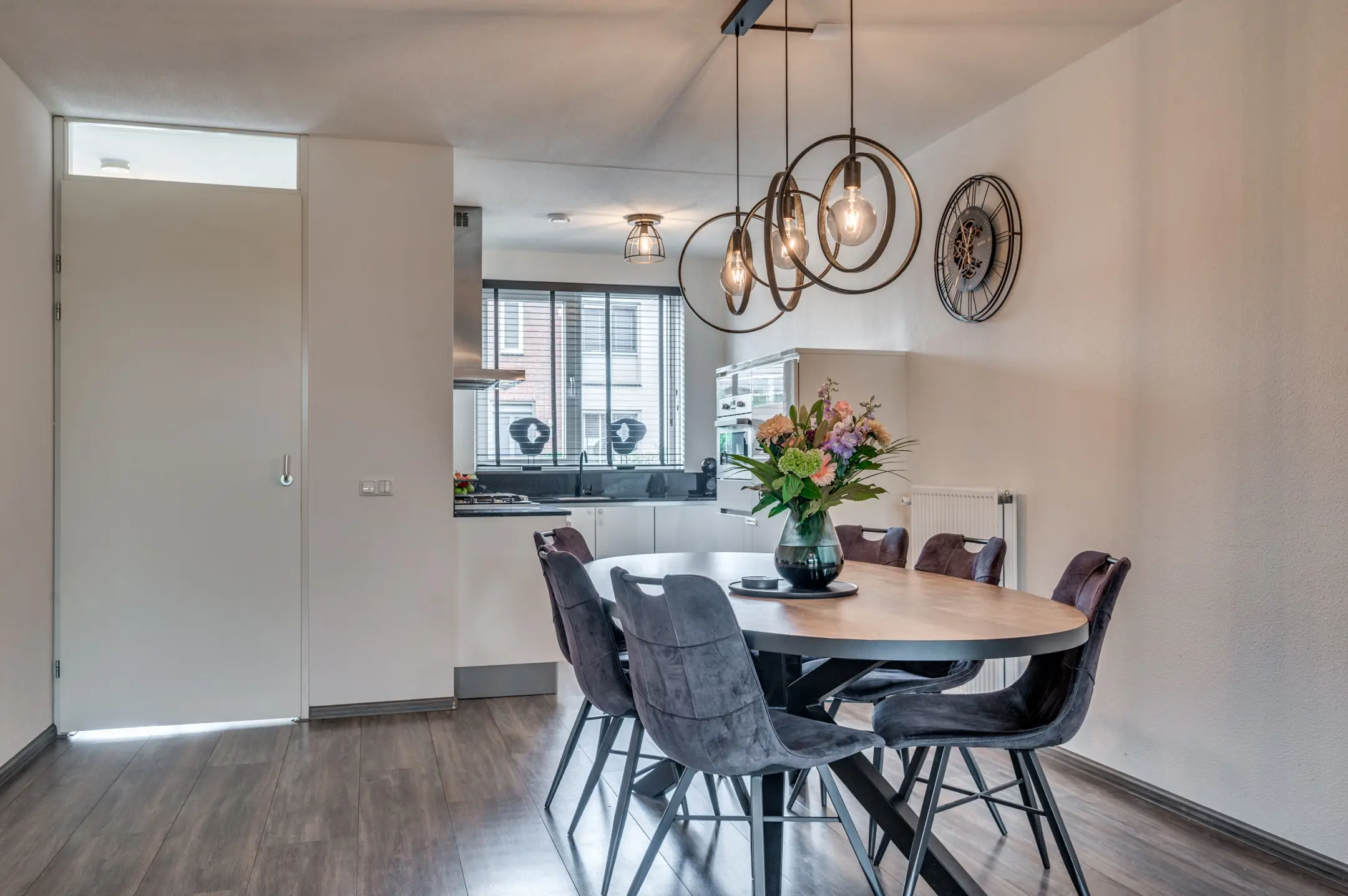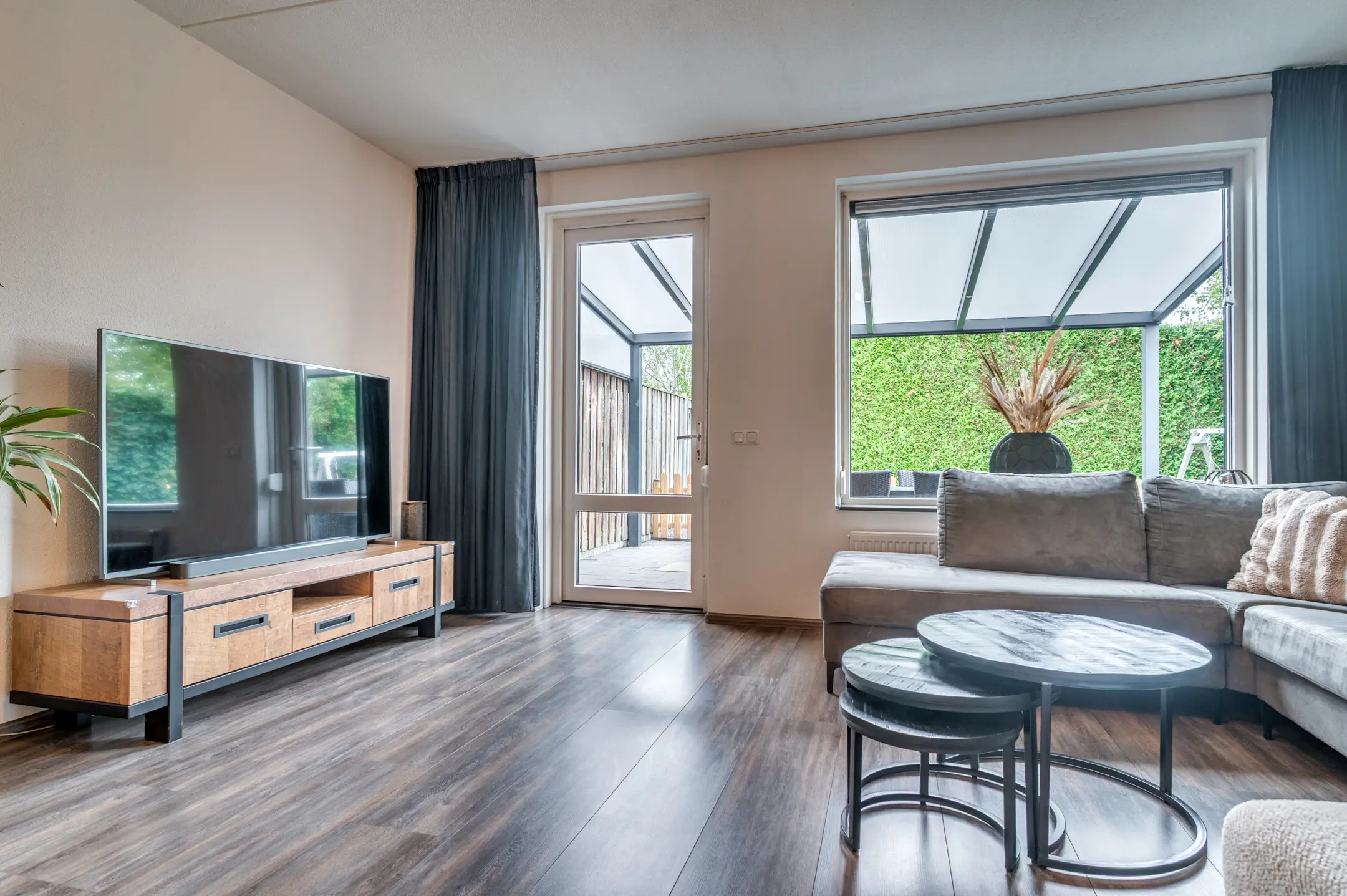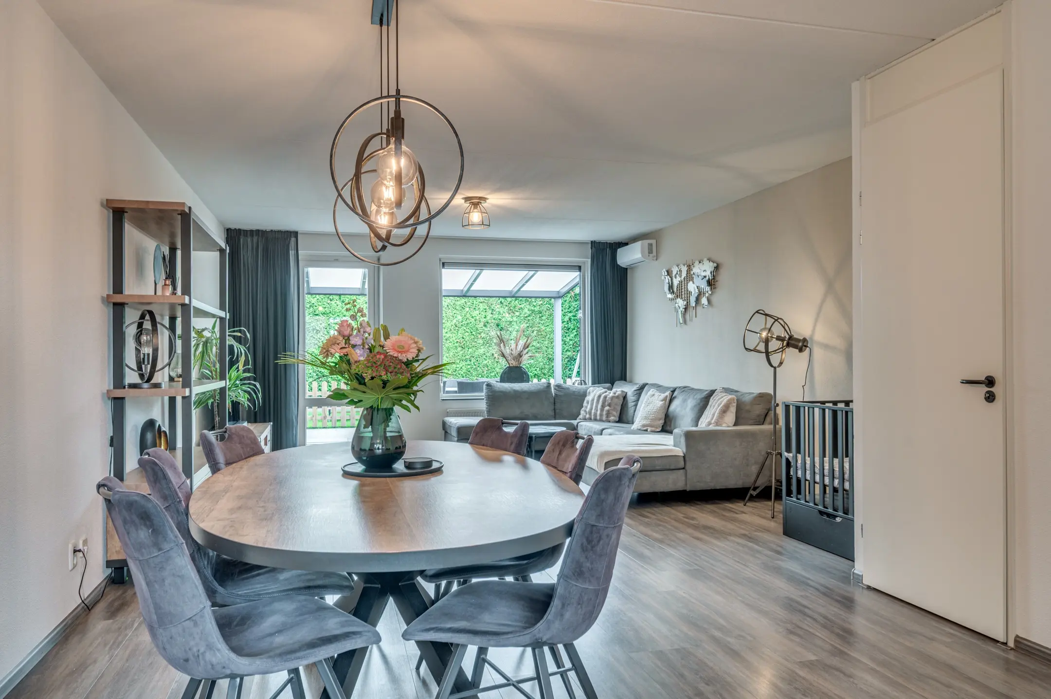 Dankzij de raampartijen aan de voor- en achterzijde en de tuindeur geniet je hier van veel natuurlijk licht en direct contact met de tuin. De strakke laminaatvloer en neutrale afwerking zorgen voor een warme, eigentijdse sfeer.