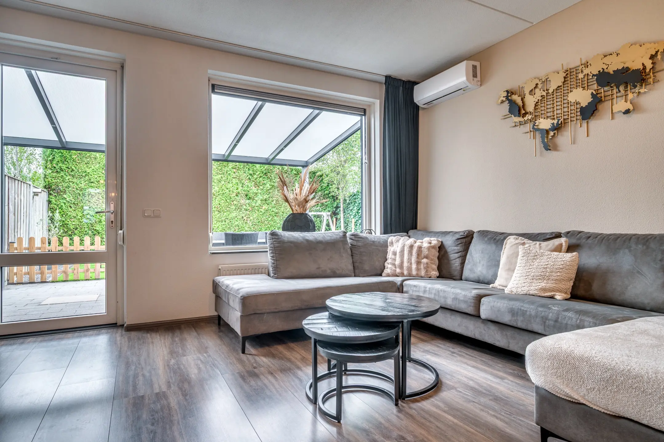 Voor extra comfort is de woonkamer voorzien van een airconditioning – ideaal op warme zomerdagen of frisse ochtenden. Onder de trap bevindt zich een handige trapkast voor extra opslagruimte.