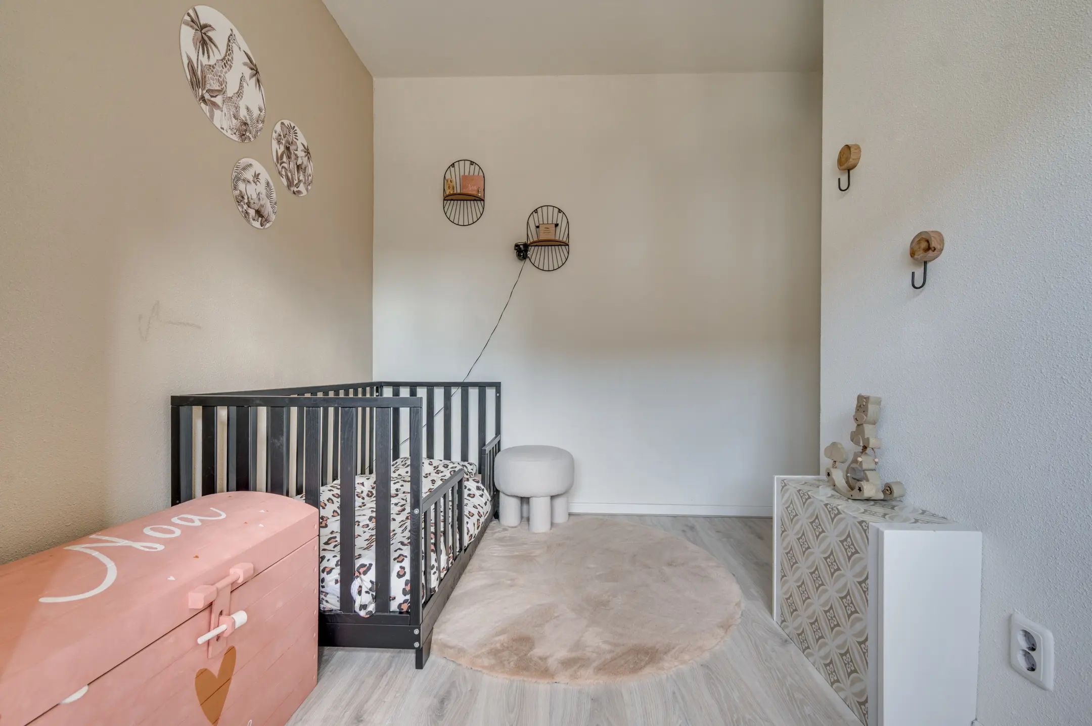 De slaapkamers en de overloop zijn afgewerkt met een lichte, strakke laminaatvloer, die de ruimtes een frisse en moderne uitstraling geeft.