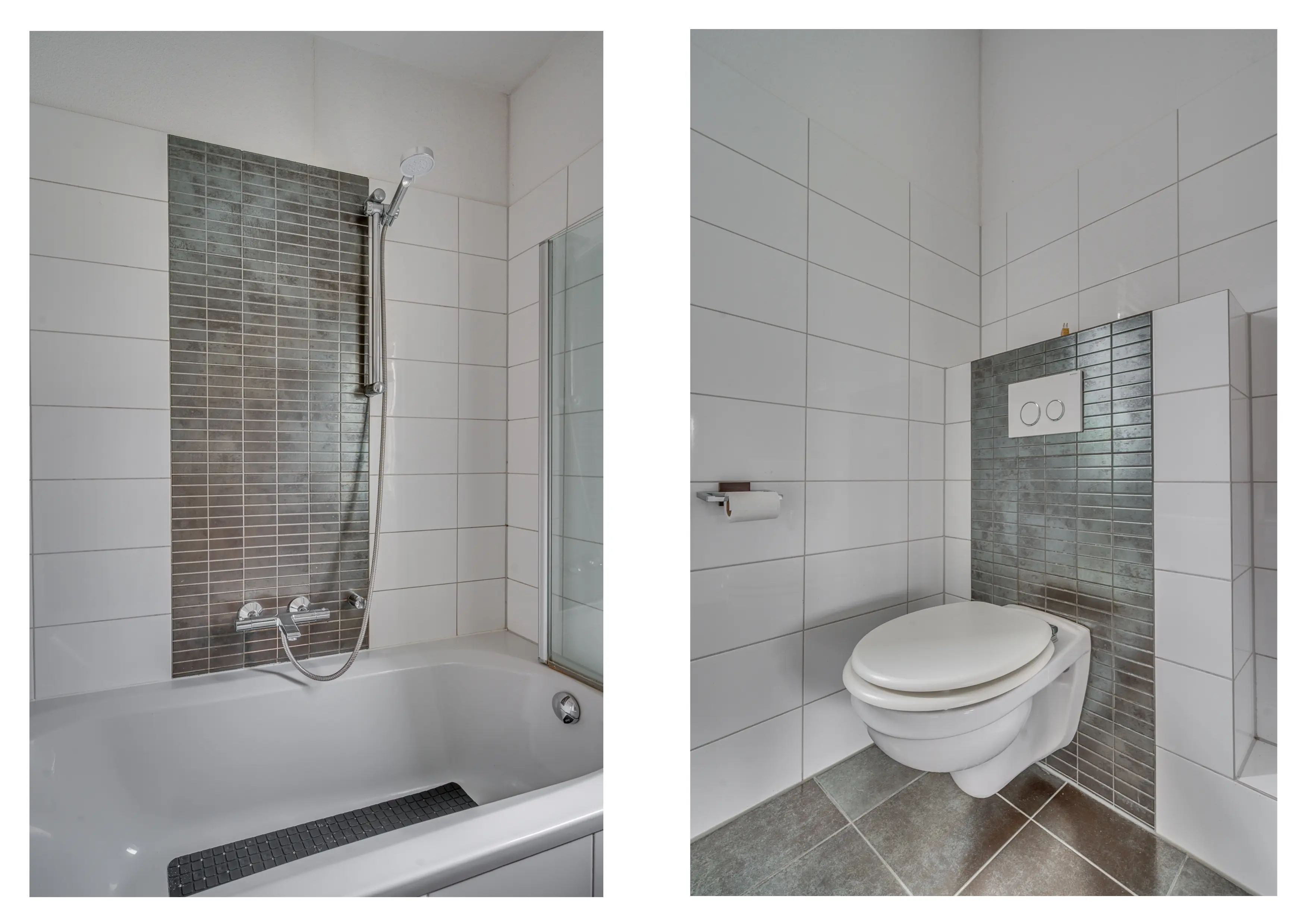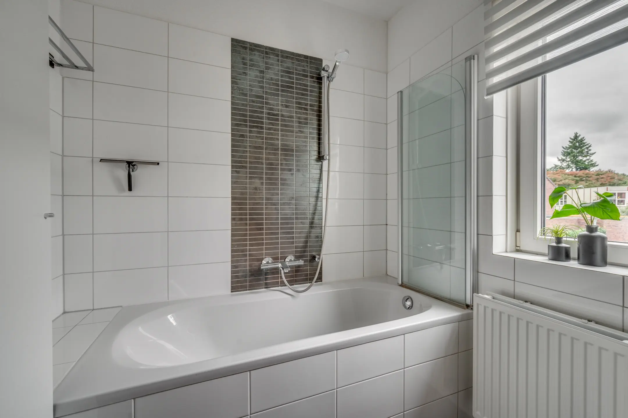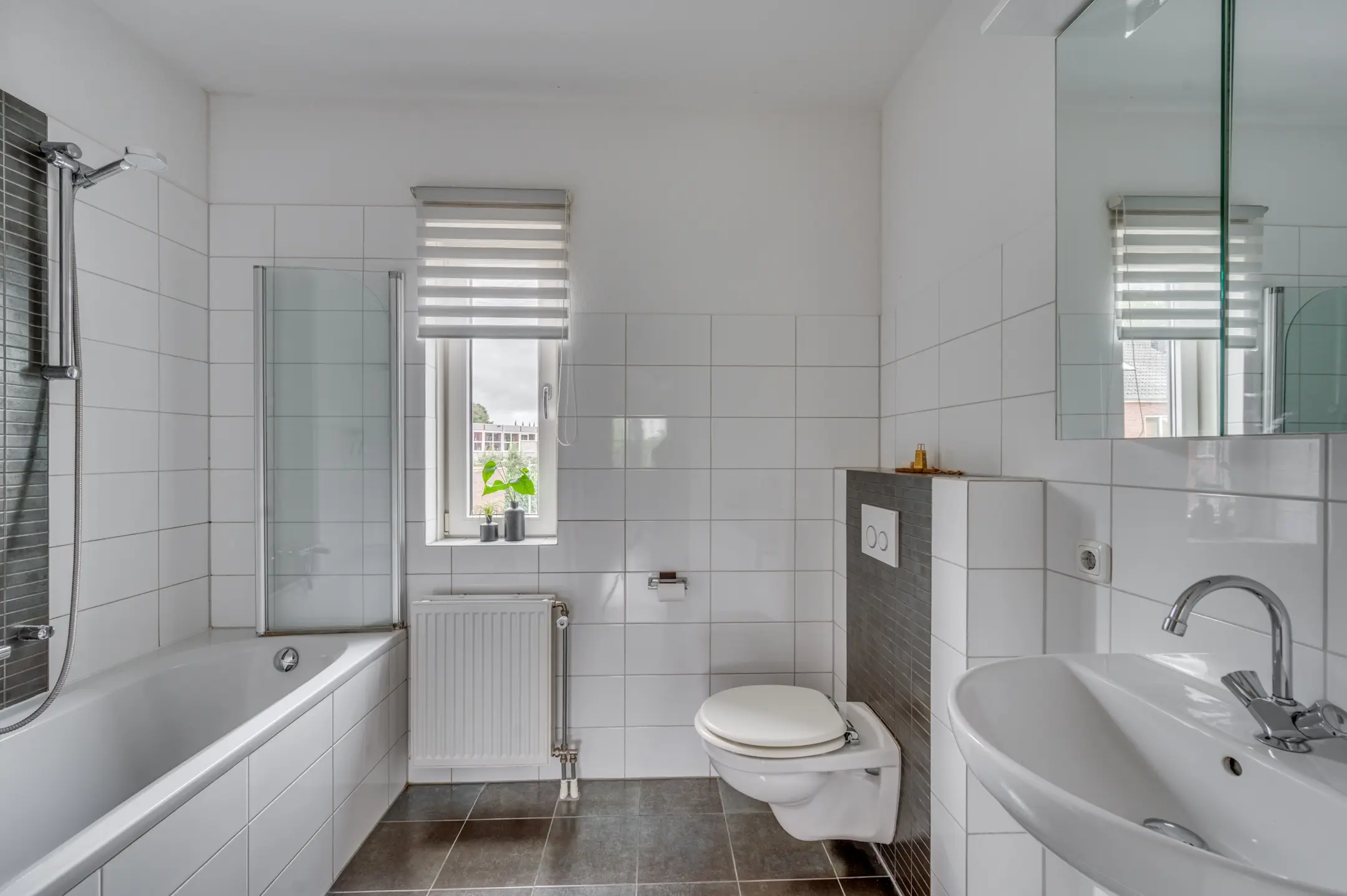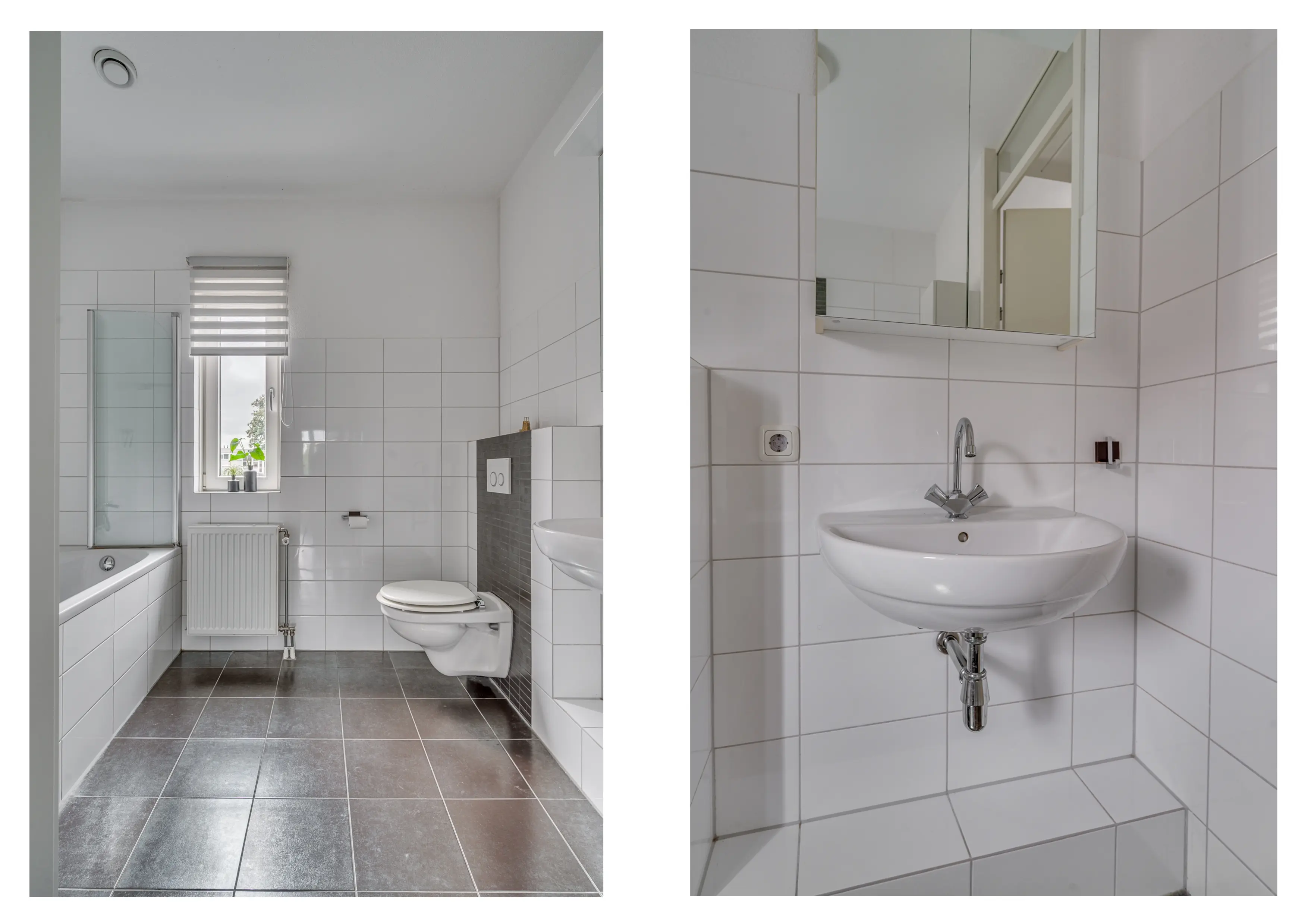 De verzorgde badkamer, met veel natuurlijk licht en grotendeels betegelde wanden, beschikt over een comfortabele ligbad/douchecombinatie, een wastafel en een tweede toilet.