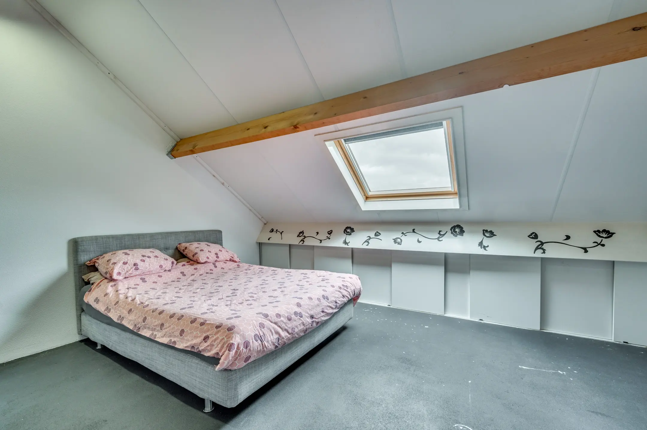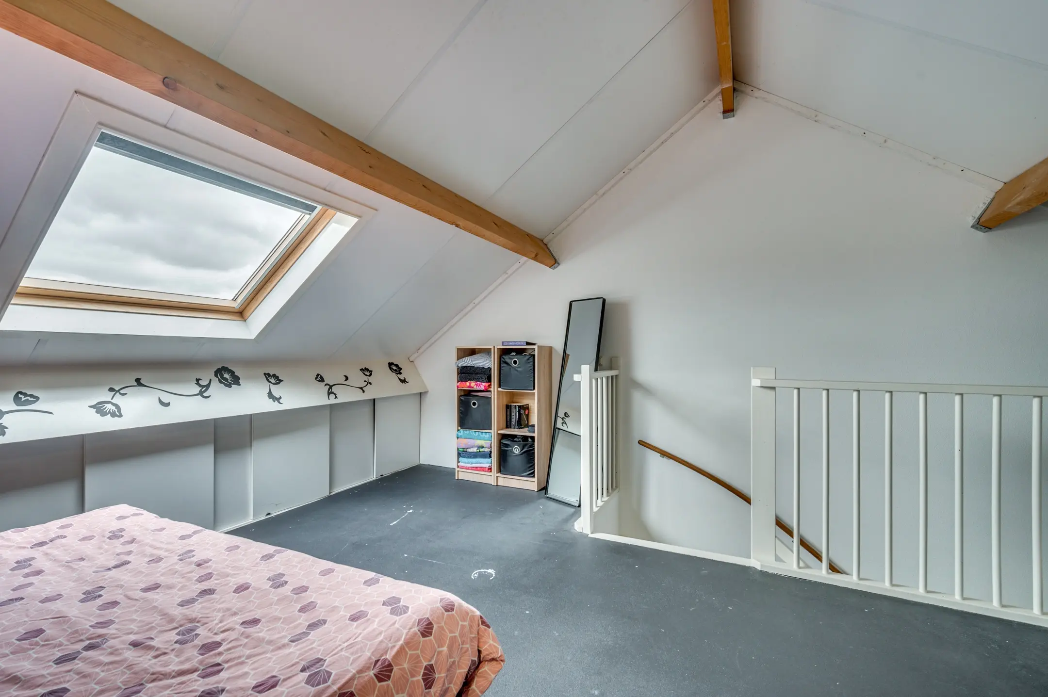Via een vaste trap bereik je de ruime zolderverdieping, een verrassend multifunctionele ruimte met volop mogelijkheden. Momenteel ingericht als extra (slaap)kamer met een Velux-dakraam, biedt deze verdieping ook de aansluitingen voor witgoed, de cv-ketel en mechanische ventilatie. Achter strak afgewerkte knieschotten bevindt zich een royale bergruimte, ideaal om spullen netjes uit het zicht te bewaren.
