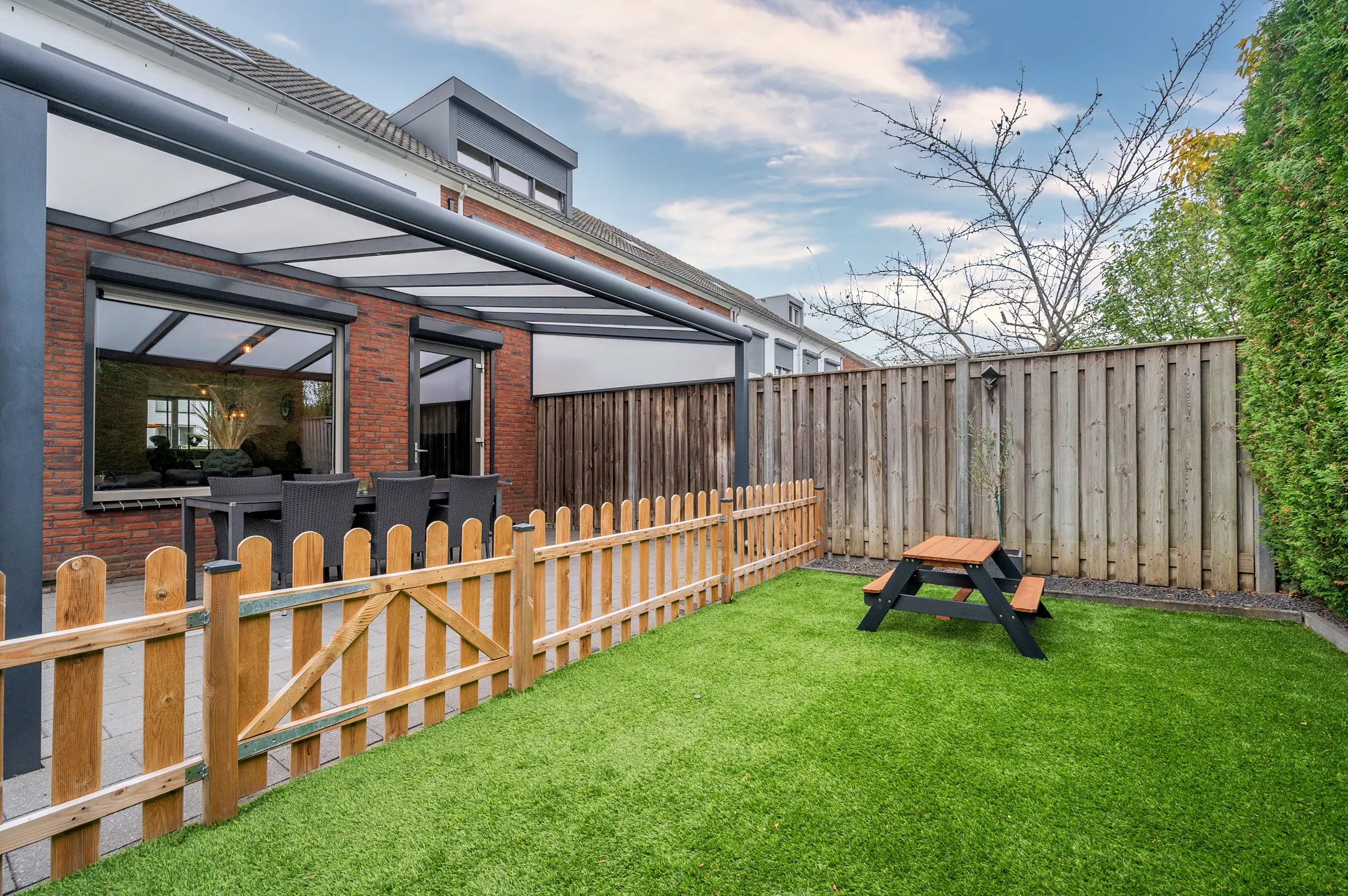 De tuin is onderhoudsvriendelijk aangelegd met een terras en een verzorgd gazon van kunstgras.